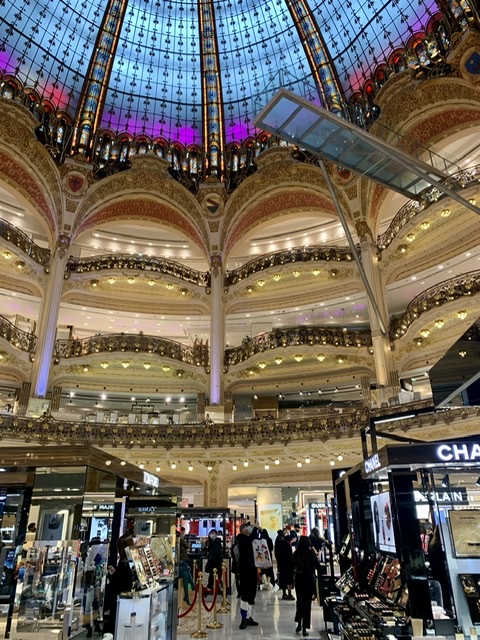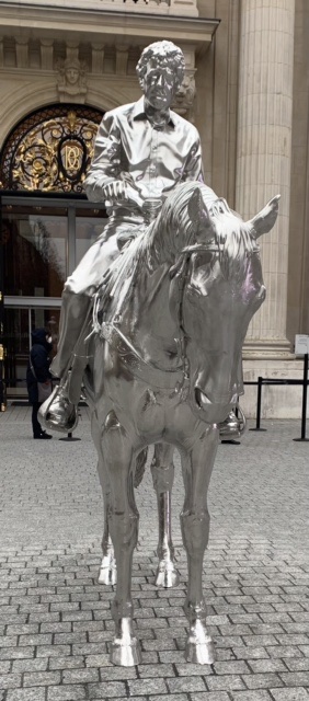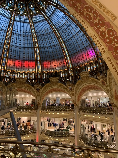 …sicherlich nicht die billigsten Käufhäuser, aber bestimmt die schönsten. Was mir besser gefallen hat: eindeutig das Lafayette. Die Rundkuppel mit dem schönen Glasdach, das in unterschiedlichen Farben beleuchtet wird, ist unbeschreiblich. Das Licht bunt, warm und die Atmosphäre locker und entspannt. Auf dem Dach hat man einen tollen Blick auf die Oper und La Tour Eiffel. Leider war´s neblig. Das Printemps besteht nur aus den exklusiven Modelabels, aber im obersten Stock befindet sich eine schöne Galerie, wo man auch Second Hand Mode kaufen kann. Das meiste ist trotzdem unbezahlbar. Ich laufe weiter mit dem Ziel Les Halles, dem dritten Shopping Centre des Tages. Das ist eher jugendlich und modern. Aber da ich mir unter Les Halles gar nichts vorstellen konnte, bin ich auch hier überrascht von der Bauweise. Es liegt größtenteils unterirdisch mit drei Ebenen und hat ein riesiges Glas-Stahldach, so als würde ein Wochenmarkt überdacht werden. Auf dem Weg dorthin entdecke ich schon wieder eine hübsche alte Ladenpassage, die Galerie Vero-Dodat. Man kann sich gut vorstellen, wie es früher war, hier einzukaufen. Heute sind dort hauptsächlich Galerien, Möbelläden, ein Gitarrenbauer und ein Schuhladen Christian Louboutin. Nach oben gibt es hier keine Preisgrenzen. Die Schuhe erinnern mich an Disney World. An der Pariser Börse wartet ein silberner Reiter auf mich. Nach einem Crêpes aux maronnes bin ich wieder aufgeladen für das Centre Pompidoux. Die Ausstellung Georg Baselitz interessiert mich eigentlich nicht sonderlich, aber da er ein deutscher Künstler ist, sollte man ihn mal gesehen haben. Und ins CP wollte ich eh schon immer hinein. Gegen meine erste Meinung bin ich aber trotzdem bald eingetaucht in die Kunst von Baselitz. Er war ein Protestmaler, kam aus dem Osten nach West Berlin und wurde erst bekannt, als er Anfing seine Objekte grundsätzlich auf dem Kopf darzustellen. Die Farbwahl und die Gewalt seiner Bilder gefallen mir gut und reißen mich mit. Die moderne Kunst einen Stock tiefer ist auch noch interessant, doch die Contemporary Art wieder ein Stockwerk darunter gibt mir bis auch Beys nicht mehr viel. Der Außenaufzug ist schön beleuchtet und auch von hier gibt einen schönen Blick über die Dächer von Paris zum beleuchteten, blitzendem Eiffelturm und zum Montmartre. Müde schleppe ich mich noch zum Monoprix bei mir über die Straße um fürs Abendessen zu sorgen. Die Auswahl erschlägt mich fast: zwei Käsestückchen, frisches Gemüse, Obst, Empanadas mit Crevetten, Mousse aux Chocolat und ein weißer Biowein aus der Provence verlassen mit mir den Laden.