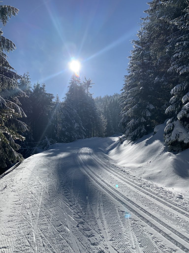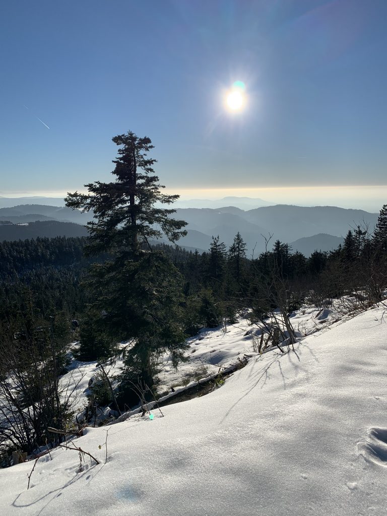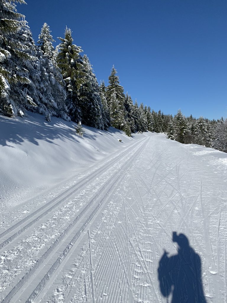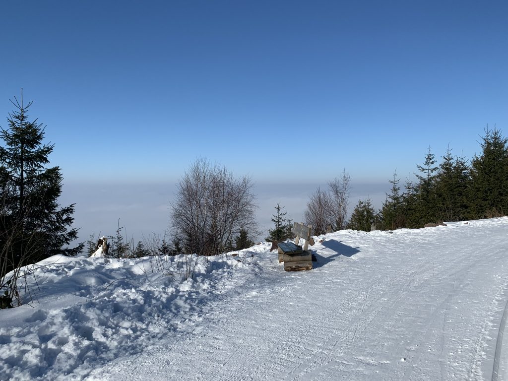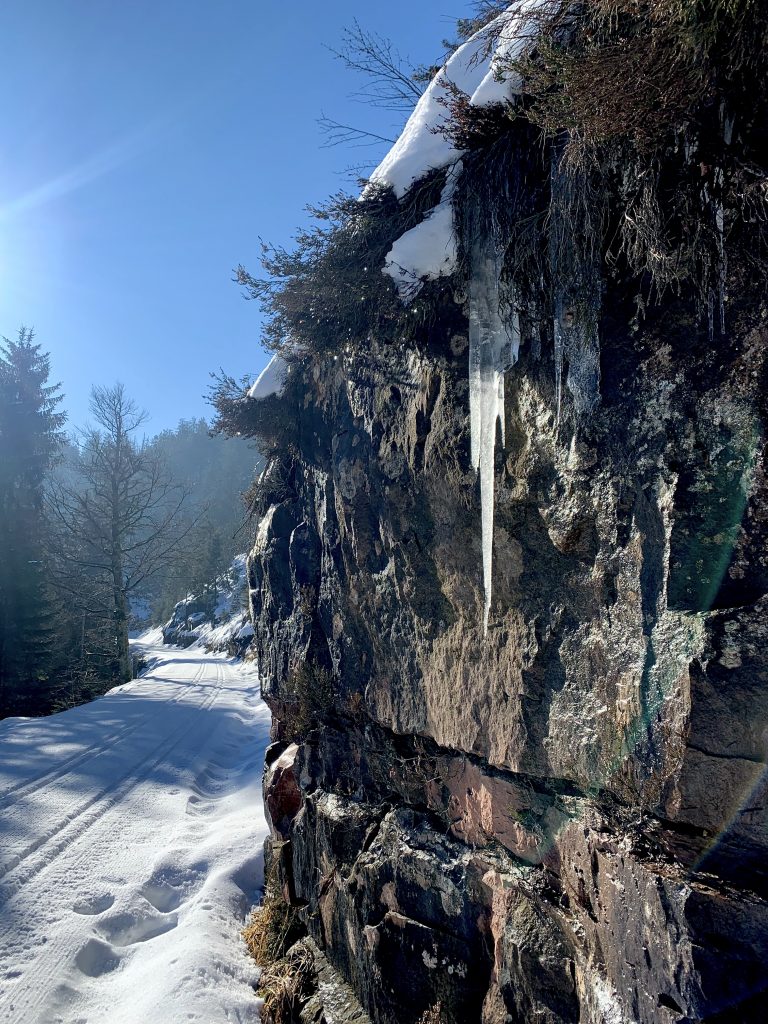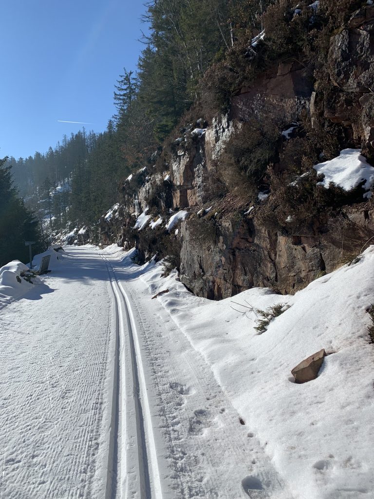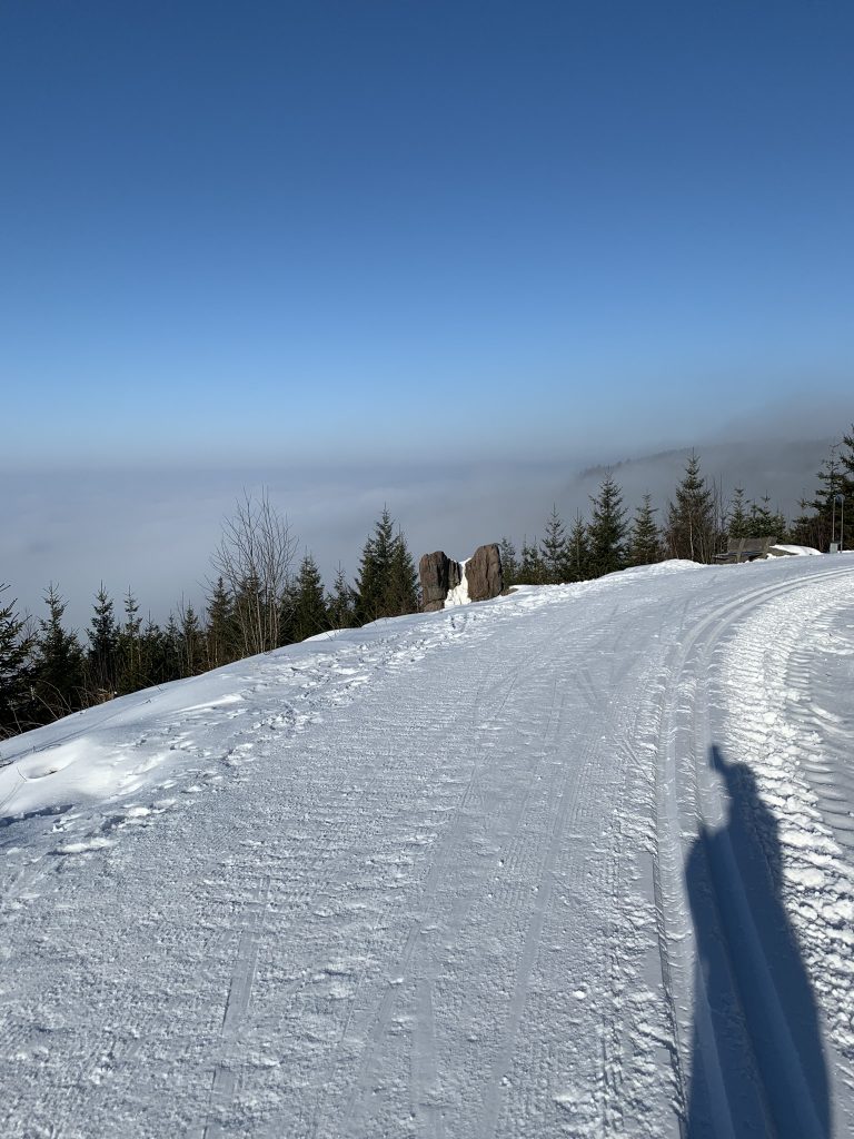 An meinem letzten Tag im Schwarzwald möchte ich das schöne Wetter maximal nutzen. Ich bekomme im Schaukelpferd, wo ich gestern Abend Essen war, den Tipp entlang des 1000-Meter-Wegs zu laufen. Via Freudenstadt, vorbei am Kniebis erreiche ich den unter der Woche verlassenen Skilift Zuflucht und stelle mein Auto dort ab. Die Loipe finde ich nicht sofort sondern laufe erst am Skihang vorbei, dann quer durch ein Wäldchen bergab und erreiche die quer verlaufende Loipe. Sie führt mich abwärts am Westhang des Schwarzwaldes in in Richtung Norden mit genialen Aussichten auf die Wolken in der Ebene. Tief verschneite Wege, Lichtungen und Wälder. Die Sonne strahlt mich an, es geht ordentlich bergab und auf der schon etwas vereisten Loipe muss ich meine Geschwindigkeit ein wenig bremsen. Schnell und nach ordentlichem Anstieg erreiche ich nach ca. 7 km den Schliffkopf. Hier ist schon mehr los, viele Wanderer genießen die Aussicht und teilen sich rücksichtsvoll mit den eher wenigen klassischen Langläufern und Skatern den perfekt geloipten Höhenweg. Mein Ziel der Ruhestein sollen noch ca. 5 km entfernt sein. Da der Weg aber nicht direkt über den Melkereikopf geht, sondern in einem Bogen dran vorbei erreiche ich den Ruhestein erst nach weiteren 8 km. Glitzernde Eiszapfen hängen an den Felsen. Am Ruhestein sportlicher Skibetrieb. In der Hütte bestelle ich mir eine hausgemachte Maultaschensuppe. Ein älterer Herr lässt sich an meinem Tisch nieder und wir kommen ins Gespräch. Er war früher Tennisspieler, jetzt wandert er. Mit dem Bus ist er von Baden Baden hochgefahren und kennt sich sehr gut hier oben aus. Seine Restaurantstipps reichen für die nächsten Urlaube hier oben sicher aus: Hotel Engel in Obertal – Ziegenkäse mit Walnusskruste und Apfel-Kompott…