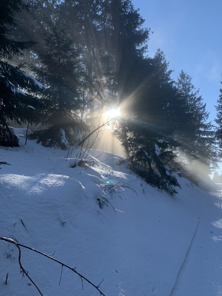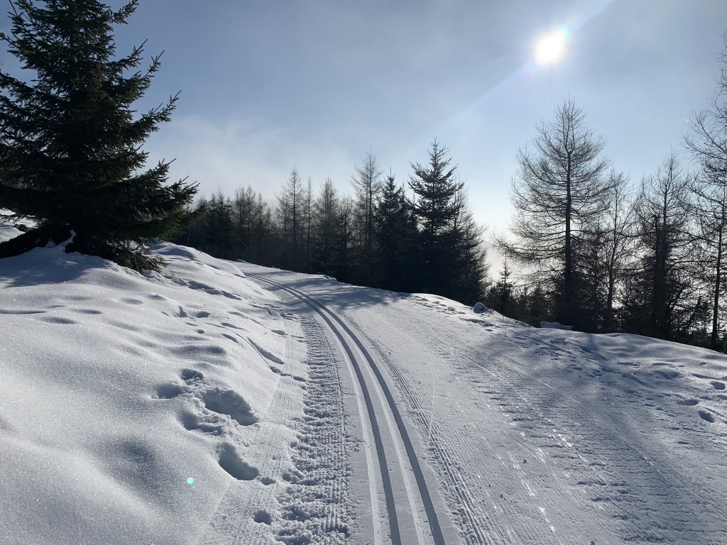 Da der Bus erst um halb drei zurückfährt, entscheide ich mich, den Rückweg auch noch mit den Skiern zu machen, obwohl ich weiß, dass insgesamt ca. 30 km Langlaufstrecke hart werden können. Die Eiszapfen spenden mir eine kleine Erfrischung und ich schiebe mich langsam weiter bergauf. Es ist eigentlich nicht so anstrengend aber die sehr monotone Bewegung verlangt den Oberschenkelmuskeln und der Hüftbeugung schon einiges ab, so dass ich doch richtig gefordert werde und kämpfen muss. Schließlich schaue ich auch noch einem anderen Langläufer hinterher und falle dann über meinen eigenen Stock nach vorne, natürlich auf die Knie. Das war schmerzhaft und ein Zeichen für eine Pause. Dennoch, die schöne Aussicht und das Wetter motivieren mich, weiter zu fahren und die Bergab-Abschnitte sind zwar fast zu schnell aber ersparen mir viel Kraft. Zum Ende steigt der Nebel aus dem Tal hoch, wir liegen in den Wolken. Da es nicht mehr weit ist und die Sicht ständig wechselt von total neblig zu leichtem Sonnenlichteinfall ist es allerdings auch schön abwechslungsreich und etwas mystisch. Mit letzter Energie erreiche ich durch den Wald meinen Parkplatz.