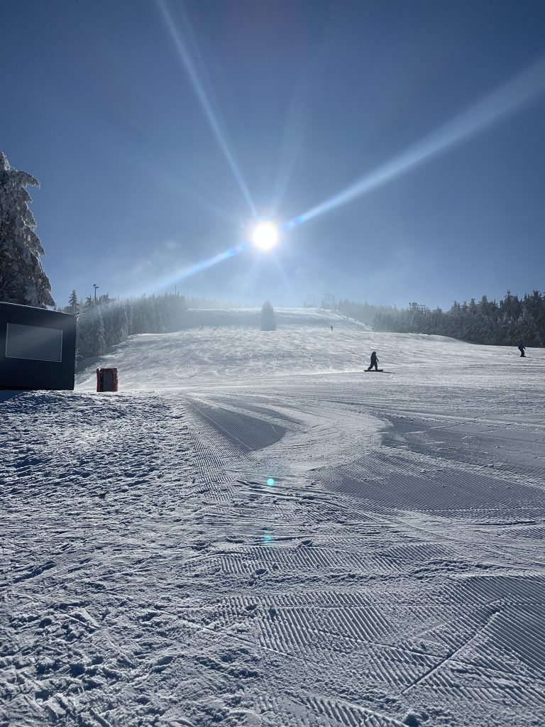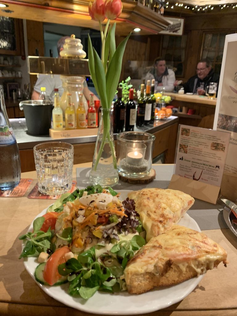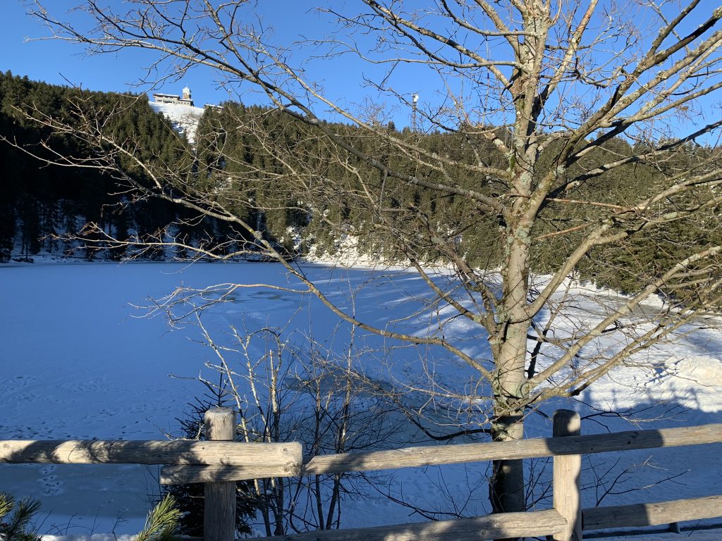 Da ich vergangenes Jahr keine Chance auf eine frisch gespurte, sonnige Loipe bekommen habe, will ich die Chance darauf, mir dieses Jahr nicht entgehen lassen. Der Wetterbericht für den Nordschwarzwald könnte von Montag bis Mittwoch nicht besser werden. Blauer Himmel und 9 Sonnenstunden sind angesagt. Ich suche mir ein nettes Hotel in Baiersbronn und buche kurzentschlossen für 2 Nächte das Hotel Petra in Baiersbronn. Das liegt in der Mitte des Hochschwarzwaldes, ca. 7 km von Freundenstadt. Mit dem Auto sind es nur 2 Stunden Fahrt von Frankfurt aus. Die Fahrt raus aus dem Nebel in die tief verschneite Winterlandschaft ist atemberaubend. Die Schwarzwaldhöhenstraße ist gut befahrbar und ich staune über die Schneemassen hier oben. Die Tannen sind tief verschneit, was für eine Landschaft. Um 11:00h stehe ich auf dem Winterparkplatz Seibelseckle. Hier ist sogar eine Skipiste, gar nicht mal unerheblich. Aber ich habe Langlaufen im Sinne und suche den Einstieg in die Schwarzkopfloipe, die mir von freundlichen Gleichgesinnten sofort aufgezeigt wird. Es ist wenig los und schon bin ich im Wintermärchen. Die ersten paar Kilometer geht es auf der Ostseite recht schattig leicht bergauf, immer wieder weite Aussichten auf den tief verschneiten Schwarzwald und dessen Hügel. Die erste Runde ist eine rote Abfahrt, diese führt mich leider nicht zur Darmstädter Hütte, sondern zurück zum Parkplatz, also drehe ich die Runde noch ein mal und komme dann über die schwarze Gaiskopfspur bergauf zur Darmstädter Hütte. Hier oben hat man eine mega Fernsicht, Richtung Süden. Die urige Hütte mit den rot-weiß schräg gestreiften Fensterlädchen hat einen Außenausschank und man sitzt gemütlich auf Holzbänken in der Sonne. Zum Mittagessen hole ich mir eine Erbsensuppe und ein alkoholfreies Weizen. Nach 11 km Langlaufen brauche ich dringend Flüssigkeiten. Die Ruhe und Sonne hier oben gefallen mir. Danach geht es auf der Sonnenseite wieder abwärts zurück zum Parkplatz. Insgesamt 16 km am ersten Tag. An der Hütte am Parkplatz hole ich mir eine heiße Schokolade und komme mit den anderen Langläufern ins Gespräch. Ein Baden Badener mit seinem thailändischen Freund sind auch schwer begeistert vom heutigen Tag. Sie machen Tagesausflüge hierauf. Mit einem Spaziergang um den naheliegenden Mummelsee und einem wunderschönen Ausblick ins Badische (=Rheinebene) schließe ich den aktiven Tagespart ab und fahre ins Tal nach Baiersbronn hinab. Nach ca. 25 Min. checke ich ins neu renovierte, gemütliche Hotel ein. Das Zimmer ist großzügig mit Sitzecke, Balkon, schickem Bad und hellen Möbeln. Warme und kalte Getränke sind sogar im Preis inbegriffen, wie nett. Zum Abendessen folge ich einer Empfehlung und gehe ins Schaukelpferd, dort gibt es leckere Salate und belegte Fladenbrote. Ich werde freundlich bedient und interessiert befragt, ob ich hier Urlaub mache und wo ich herkomme. Alleine reisen ist intensiv, erholsam und spannend, ich fühle mich eigentlich auch gar nicht allein. Im Gegenteil, überall bekommt man schnell Kontakt und führt dann interessante Gespräche.