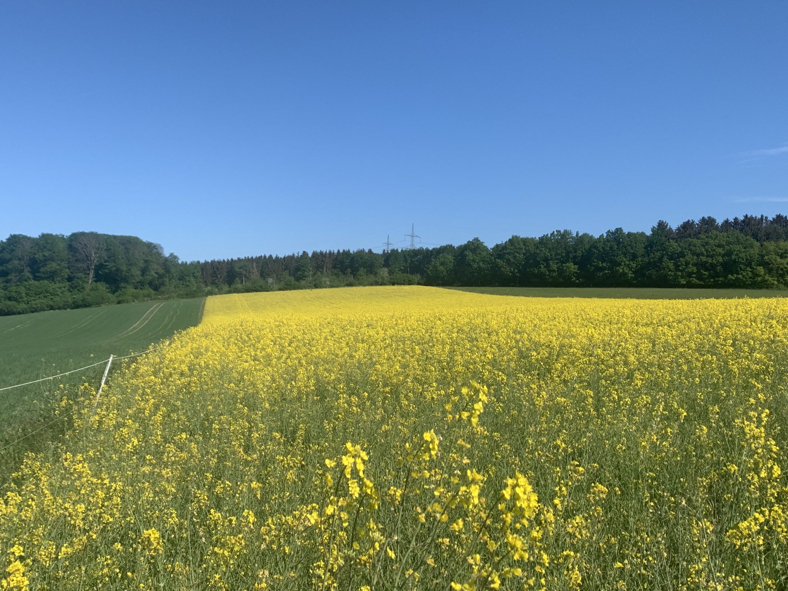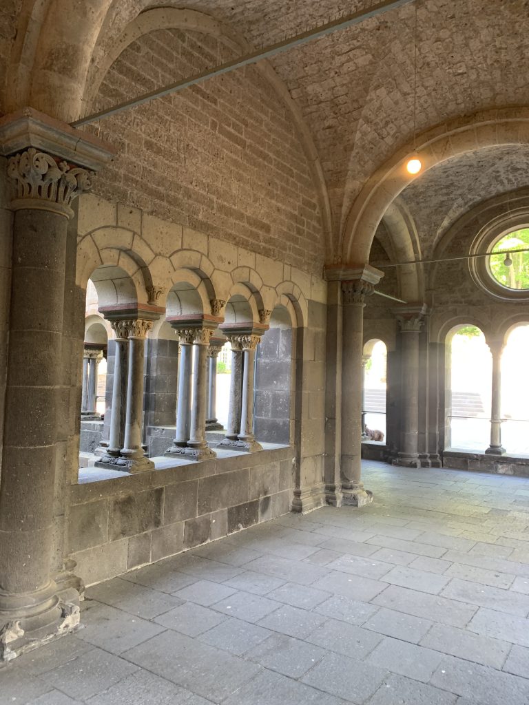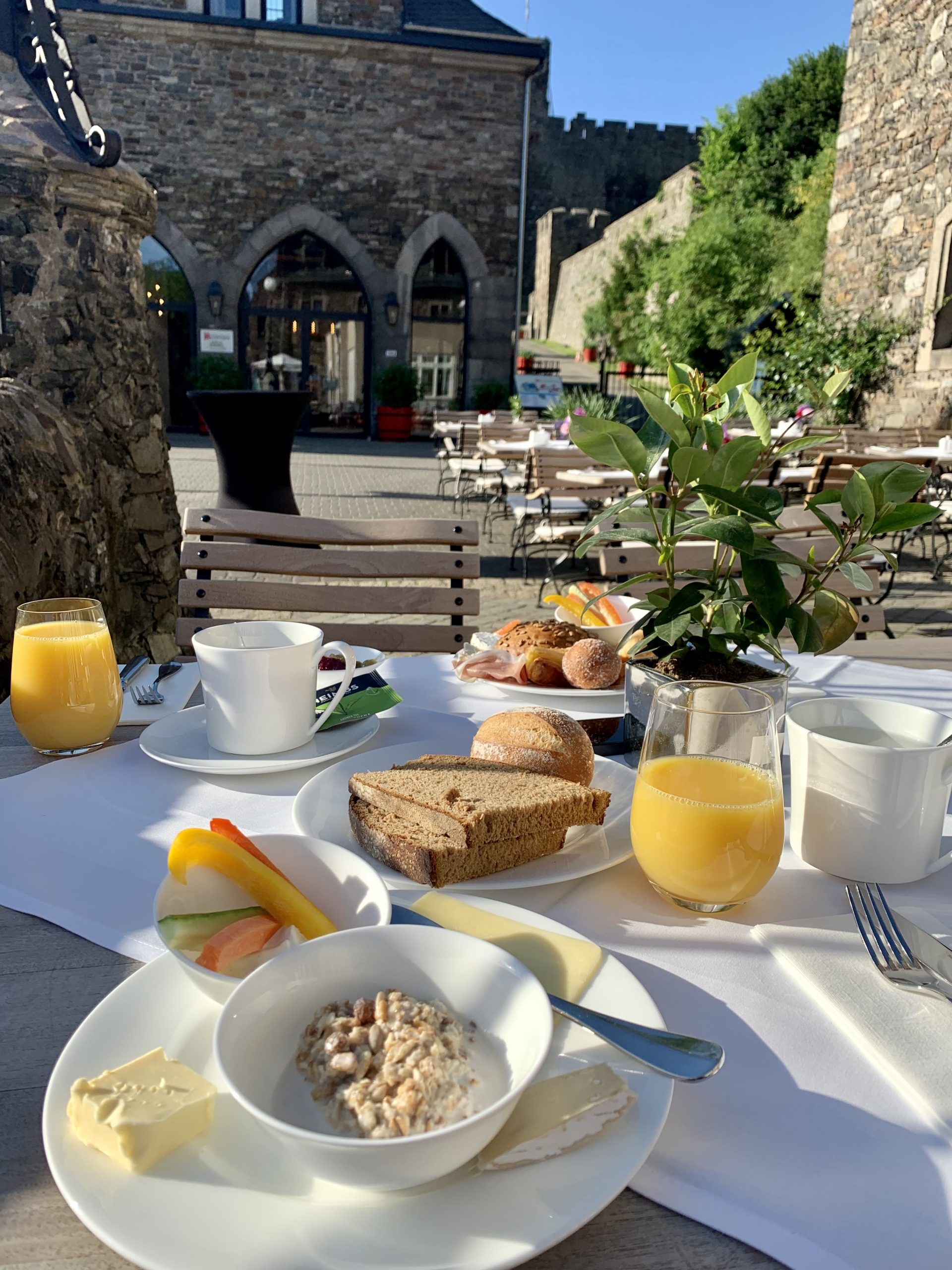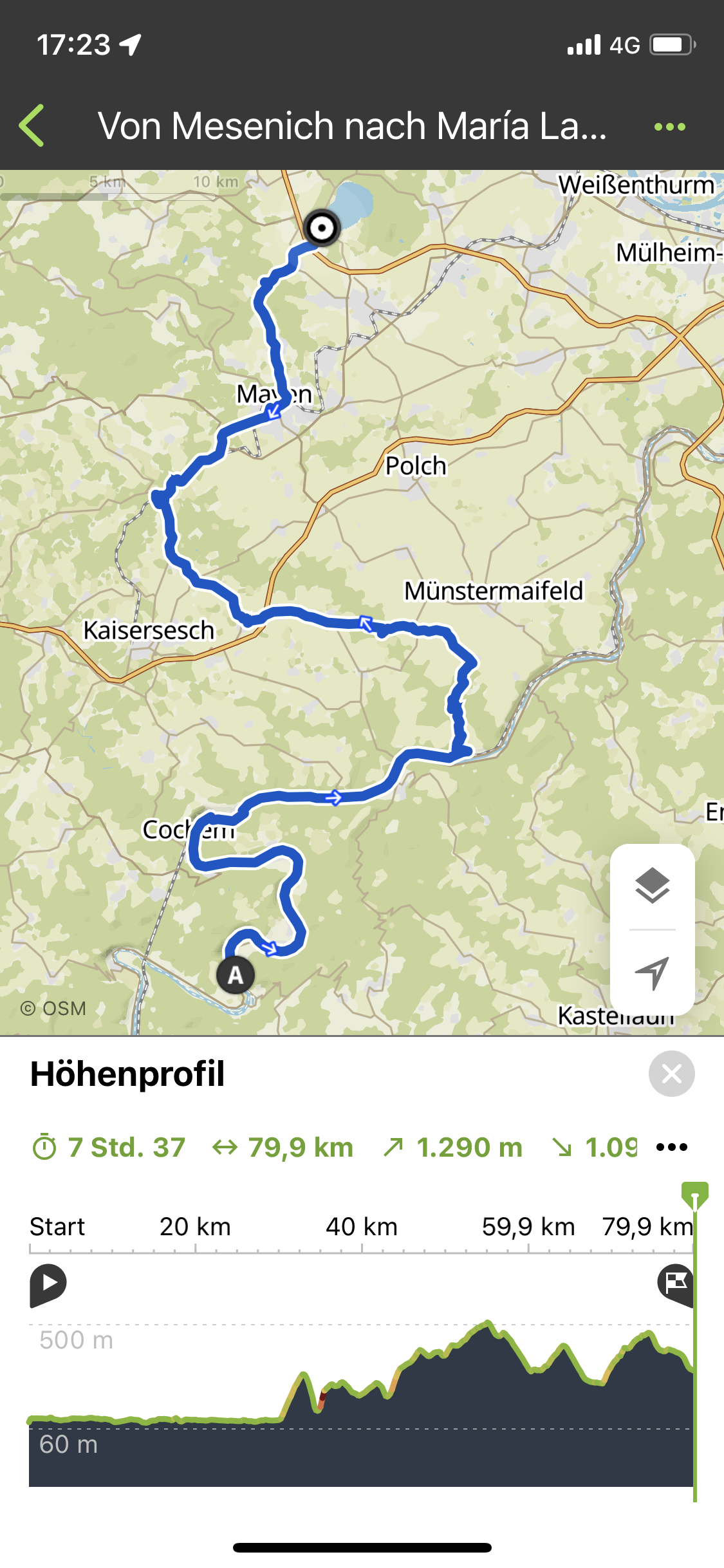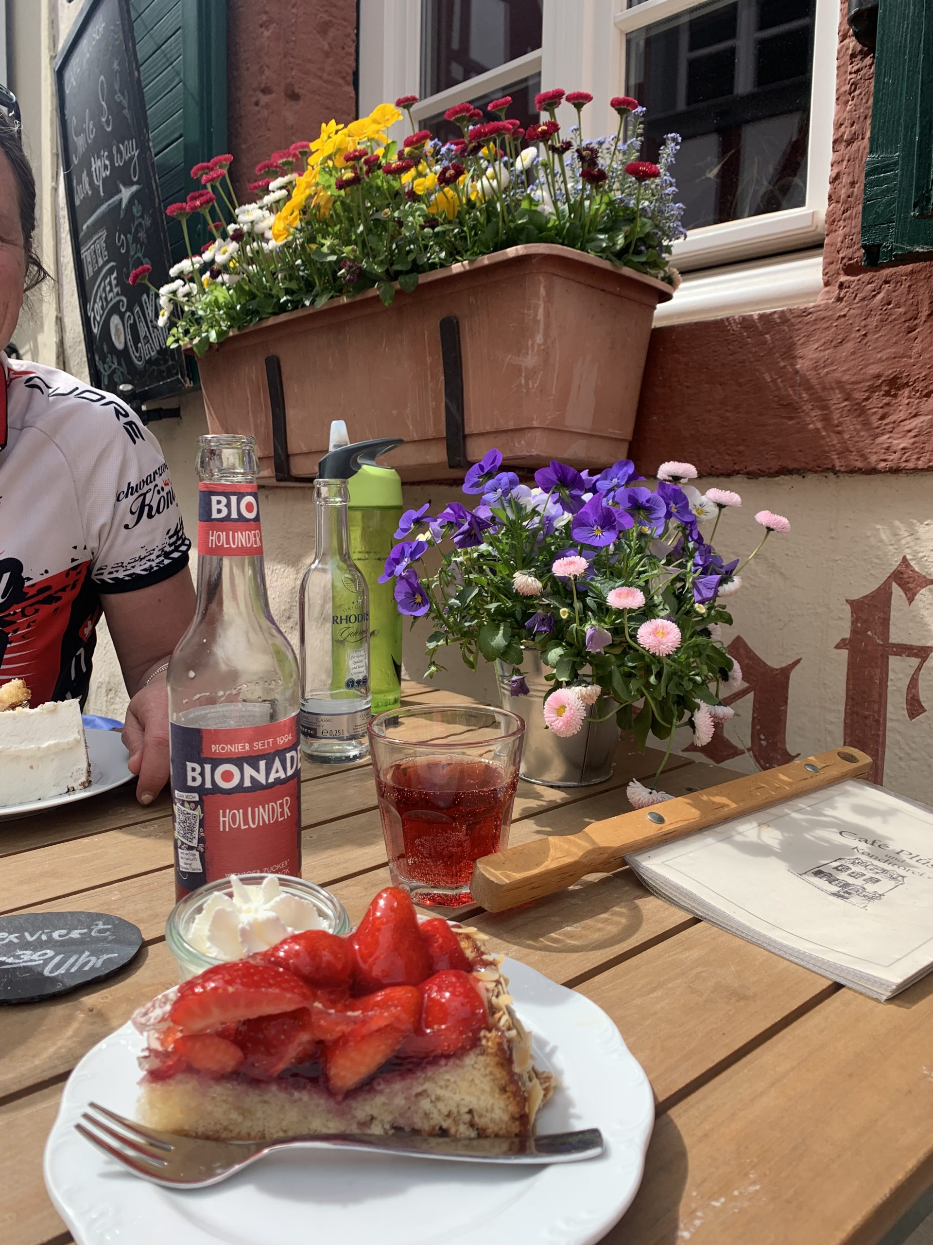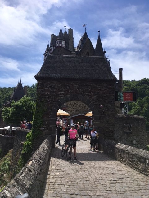 Beim Frühstück werden wir aufgefordert soviel wie möglich zu essen und dürfen uns auch was mitnehmen. Die Bikes haben in einer alten Scheune übernachtet, der Wirt zeigt uns sein altes Peugeot-Rennrad. Weiter geht es an der Mosel an Cochem vorbei bis Müden, wo wir den Aufstieg zur Burg Eltz wagen. Die Wein-Terrassen gehen in ein Wäldchen über, die asphaltierte Straße endet, Komoot leitet uns über die Gravelstrecke auf einen schmalen Wanderweg zur Burg Eltz. Eine geniale Aussicht auf die Burg erwartet uns, doch der unbefestigte Wandersteig wird zur Herausforderung. Wir müssen die Bikes über den steilen Abhang schieben und über alte Baumstämme tragen bis wir endlich unten am Eltzbach, der die Burg umrundet, stehen. Nach dem Aufstieg über die steilen Steintreppen dürfen wir den weltberühmten Blick über die alte Steinbrücke auf die hohe Burg genießen. Viele Besucher aus der ganzen Welt sind da. Wir holen uns Tickets, schließen die Räder hinter dem Einlass ab und besuchen die Schatzkammer. Für die Führung fehlt leider die Zeit, doch diese wäre mit den Tickets auch zukünftig noch einlösbar. Steil bergauf verlassen wir das Burggelände und fahren in die Vulkaneifel. Dani zählt sofort 7 Vulkane am Horizont. Mit vielen, teils recht steilen Anstiegen fahren wir in westlicher Richtung über die Felder bis Monreal, welches alz eins der schönsten Städtchen von RLP bezeichnet wird. Im Café der Altstadt tanken wir uns mit Erdbeerkuchen, Kaffee und Apfelschorle auf. Weiter via Mayen (schöner Marktplatz) erreichen wir nach 80 km und 1.300 Hm das Kloster Maria Laach am Laacher See, einem Vulkankratersee. Das Seehotel ist wunderschön, mit Terrasse und hübschen, modernen Zimmern. Wir machen einen Spaziergang zum Vulkansee und suchen die Badestelle, die etwa 2 km entfernt am Campingplatz liegt. Nach der Hitze sind wir dankbar für eine Abkühlung. Zum Abendessen auf der Hotelterrasse bestellen wir Vulkansee-Felchen mit Kartoffelpüree und einen frischen Pinot Blanc de Noirs.