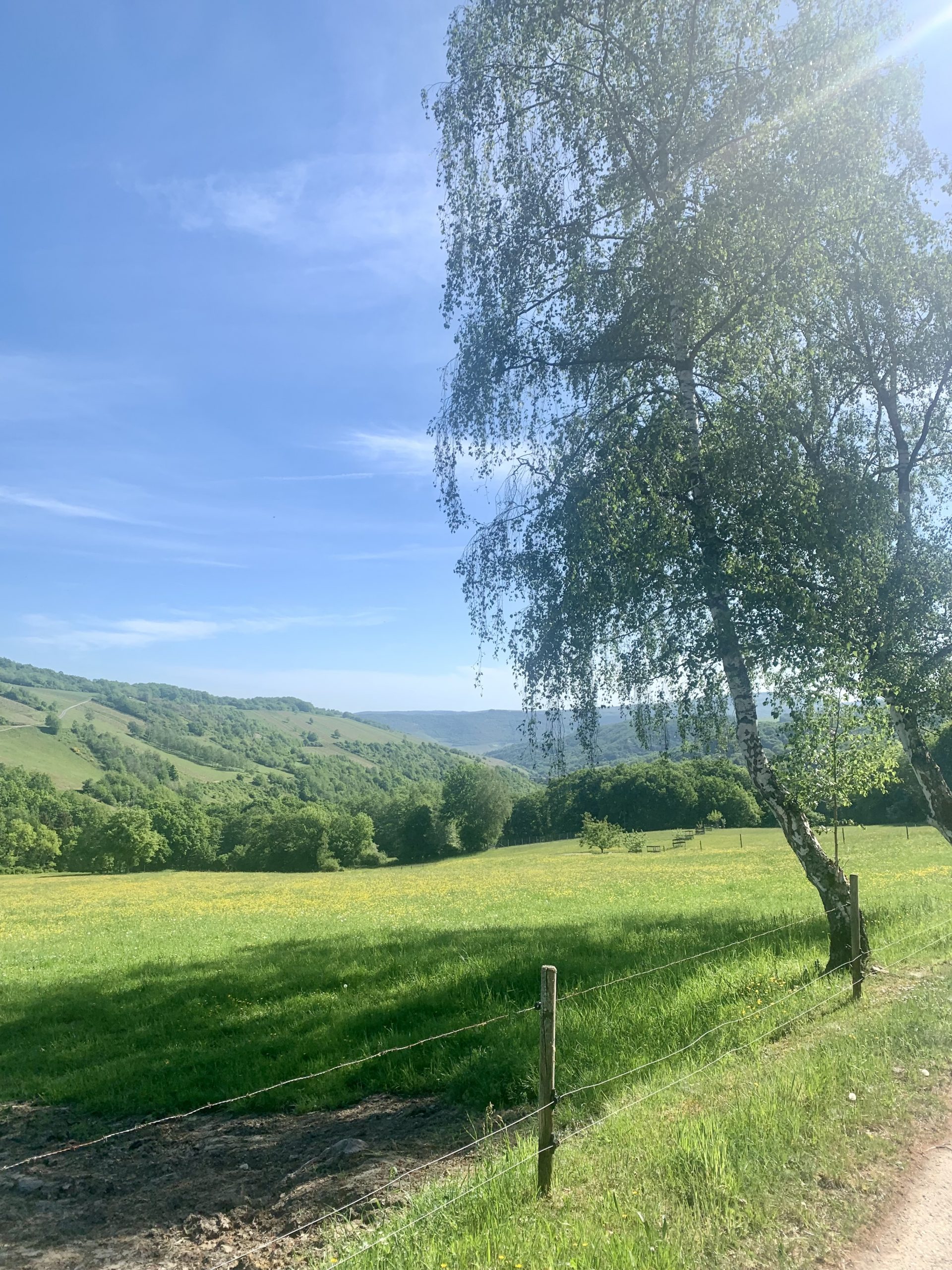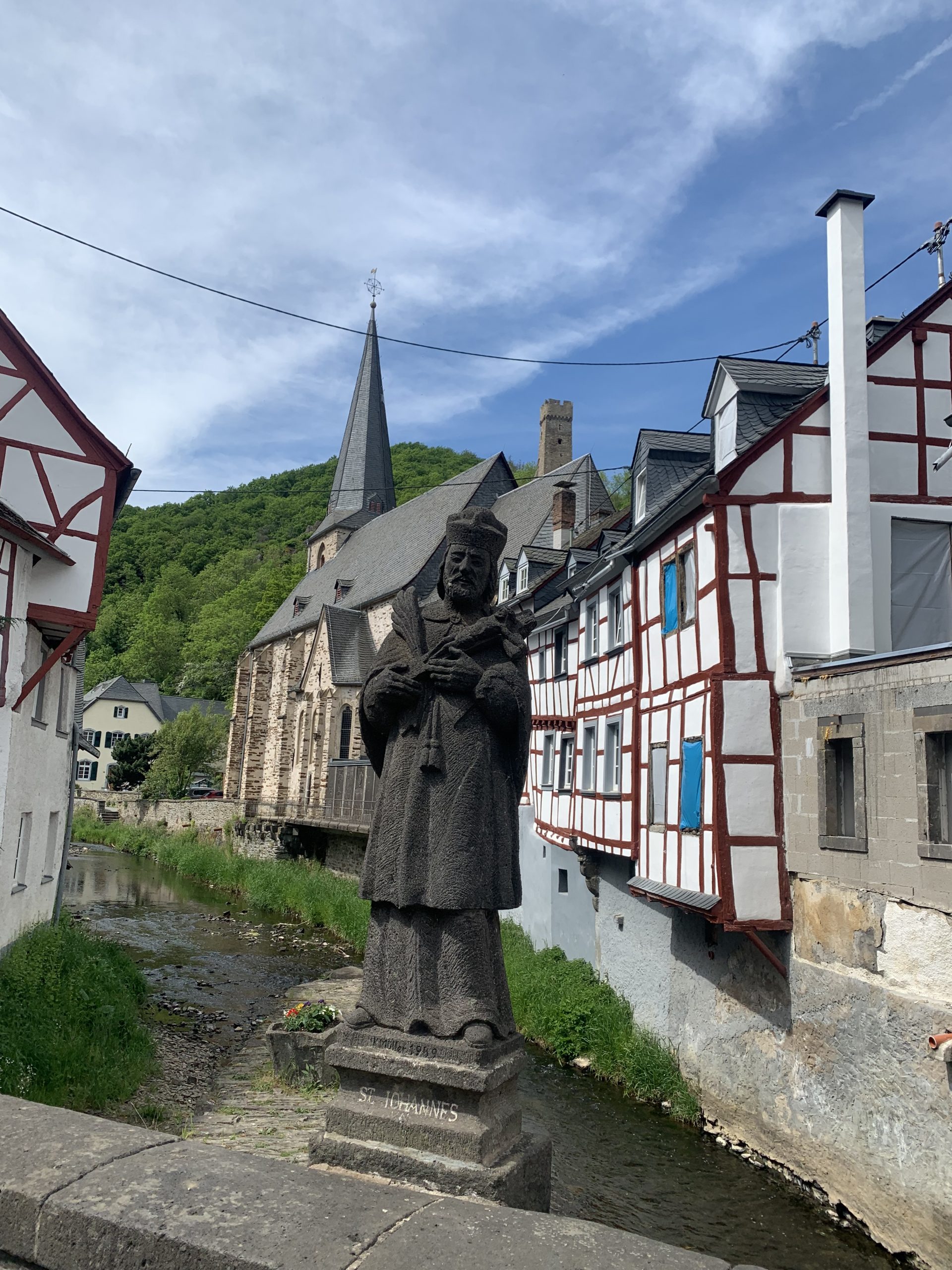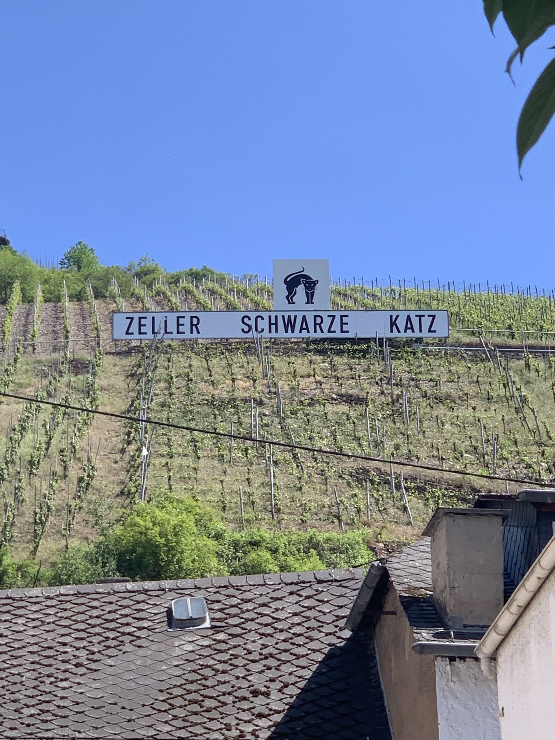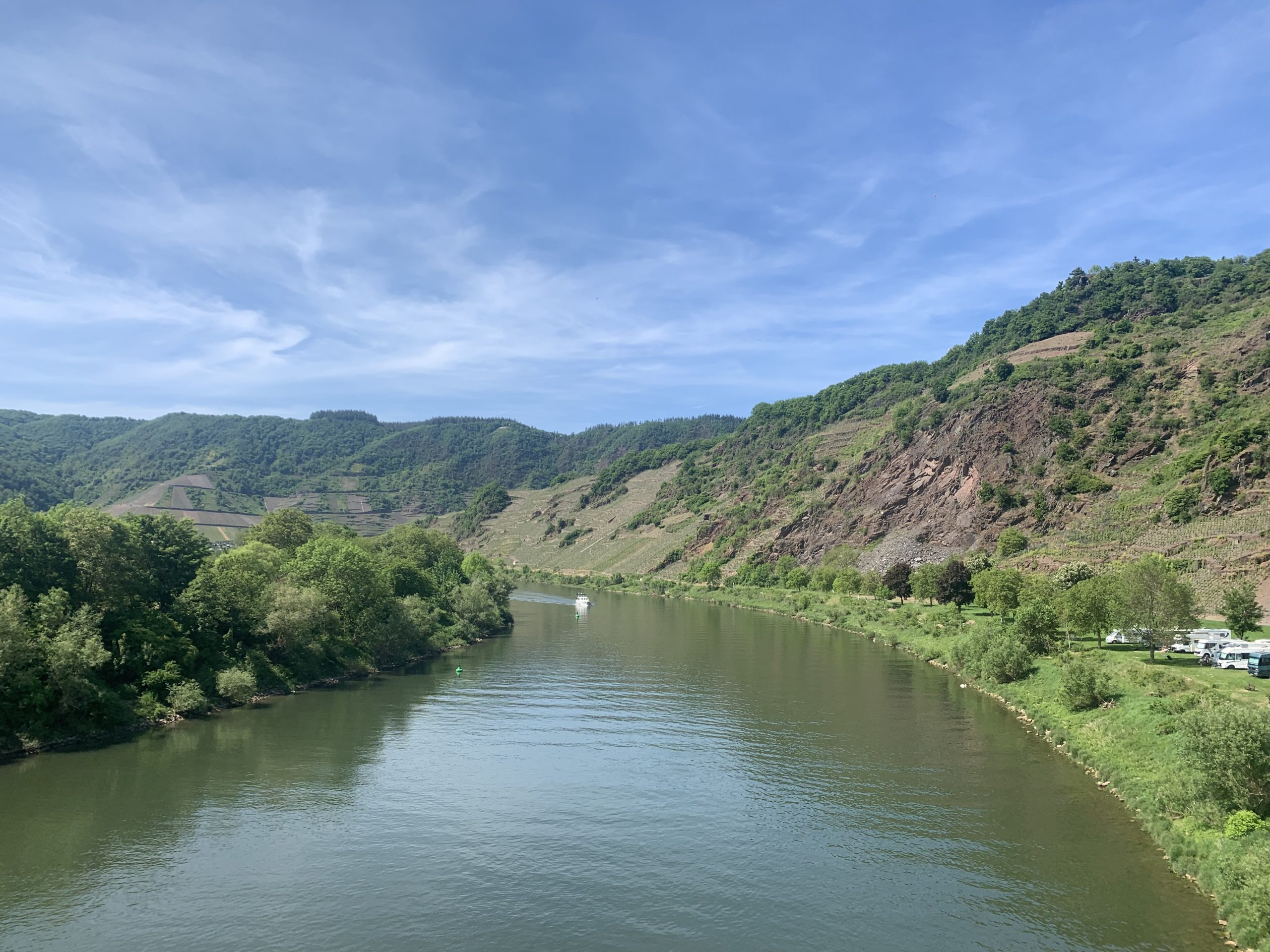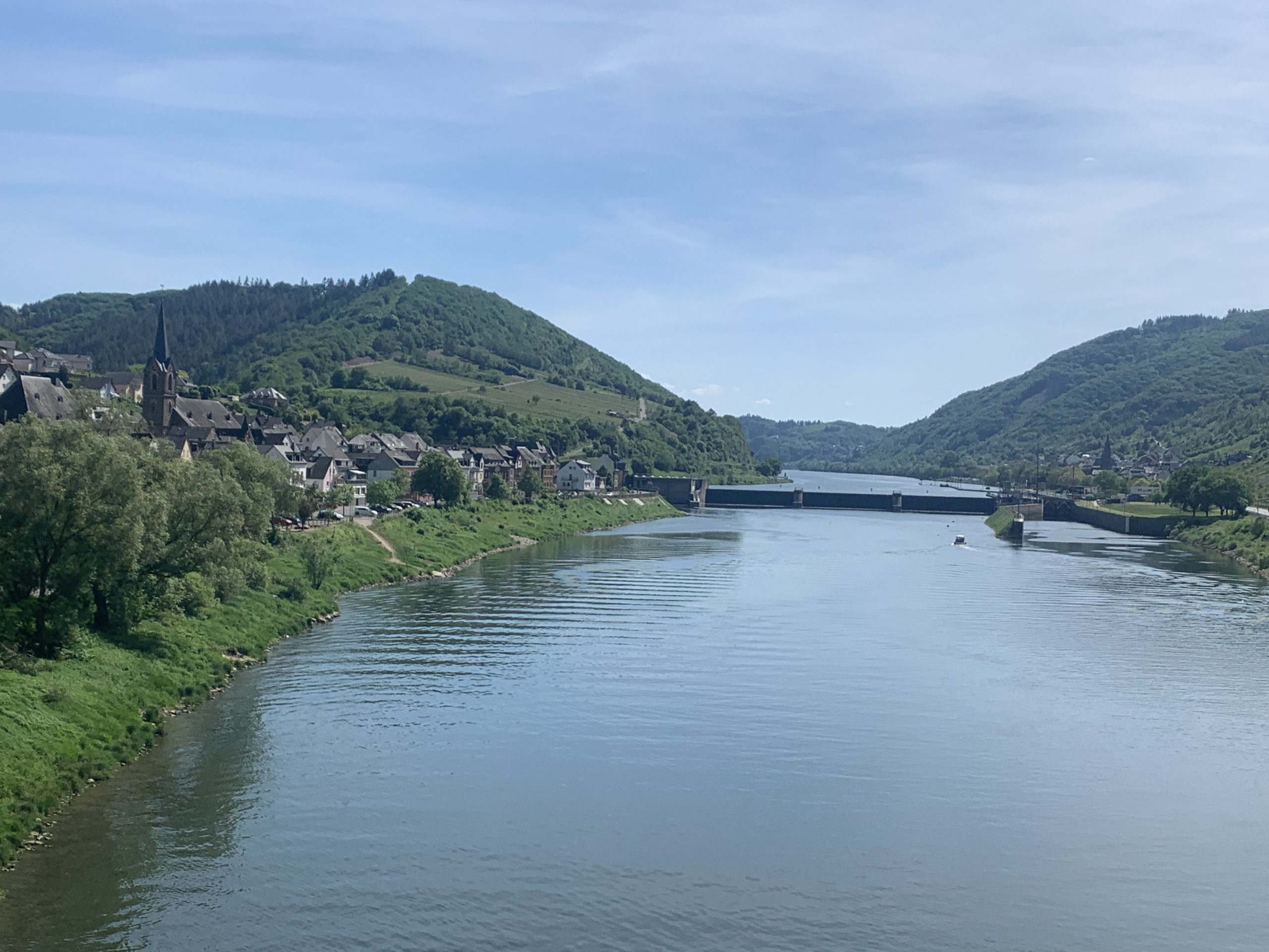 Am nächsten Morgen heißt es Höhenmeter einsammeln. Wir verlassen das Rheintal und biegen nach links über das Heimbachtal ab in den östlichen Hunsrück. Auf einer einsamen Asphaltstraße geht sanft bergauf bis wir auf ca. 400 m Höhe den Kamm erreichen. Wir passieren Rheinböllen und Simmern, es ist wenig Verkehr und pausieren an einem kleinem Kirchlein mit Blick über die grünen Hügel. Eine wunderschöne Strecke führt hinter Peterswald durch das Altlayer-Bachtal hinab direkt nach Zell an der Mosel und entschädigt uns tausendfach für die vielen Höhenmeter in der Mittagshitze. Über uns kreuzt eine Adlerfamilie, der Ginster blüht auf den Felsen. Im mittelalterlichen Weindorf Zell empfängt uns die “Schwarze Katz“ und die gemütliche Altstadt. Wir fahren moselabwärts via Neef (mit Kuchenpause im Café zur blauen Traube und Badestop in Nehren) an der berühmten Weinlage Calmont vorbei bis Mesenich, wo wir ein Zimmer in der Pension am Weinberg gebucht haben. Der Stadtrundgang dort überrascht mit vielen Details zur Vergangenheit des Dörfchens. Der ältere Gastgeber ist sehr freundlich und wir haben ein gemütliches Zimmer. Abends kehren wir in die Dorfgaststätte Serwazi-Zensen ein und testen den hiesigen Riesling. Insgesamt 87 km und 950Hm.