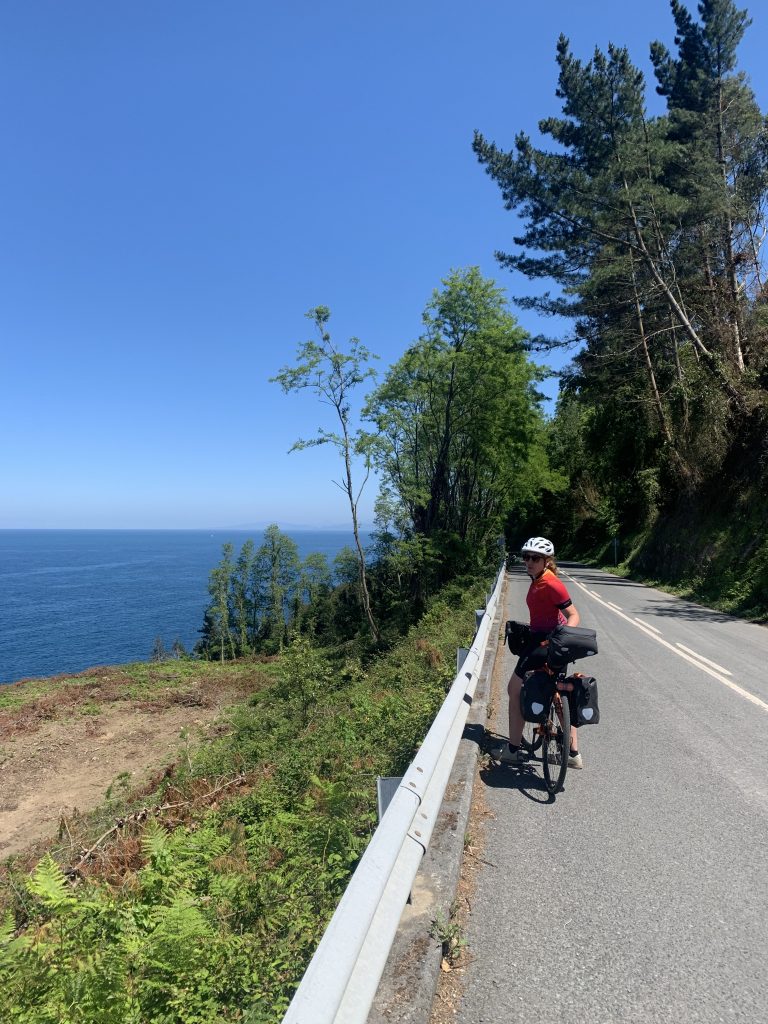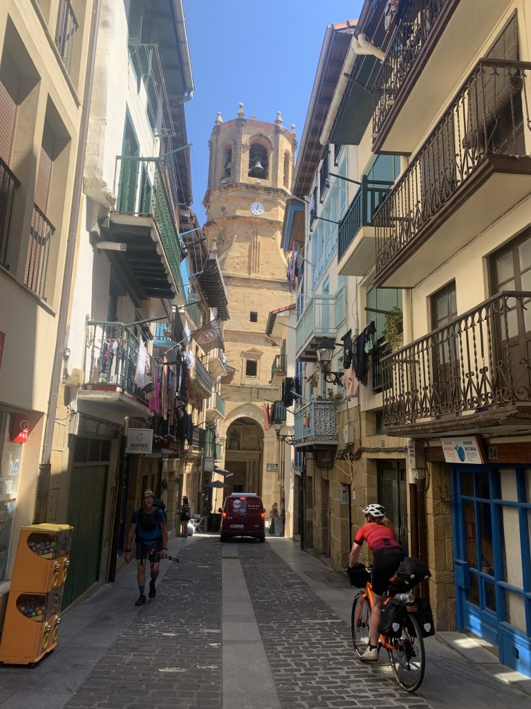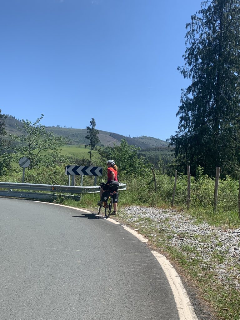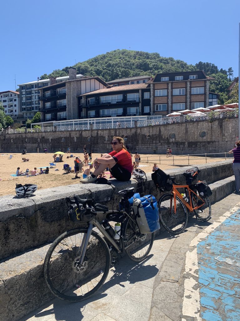 Nach einem ausgiebigen Stadtbummel durch die Altstadt mit Tapas auf der Plaza Nueva und einem kurzem Besuch beim Guggenheim Museum (war leider schon zu, geniale Lage am Flussufer mit glitzernder Fassade, die an ein Schiff erinnert) genießen wir die letzte Nacht in einem Bett. Ab Morgen zelten wir. Das Frühstück ist lecker, wir sprechen mit einem holländischen Pärchen, das den Camino von Irun bis Bilbao gelaufen ist. Schnell sind die Räder aufgesattelt und wir verlassen die Altstadt, kommen via Gewerbegebiet in die Vororte. Dann wird es idyllisch und wir kommen in die waldigen grünen Hügel östlich von Bilbao. Der Spaß endet, als unser Routenplaner Komoot uns einen schmalen Trail in die Wildnis hochschickt. Fahren unmöglich, so verwildert ist es hier. Wir schieben die Drahtesel mühsam und schimpfend den felsigen Pfad nach oben. Das kostet Kraft, ausgerechnet an einem Tag, der mit 1.300 Höhenmetern eh schon sehr herausfordernd geplant ist. Nach 2 km Schieben ist wieder Fahren möglich, doch Schlammlöcher stoppen uns und mein Schuh wird nass. Endlich gelangen wir wieder auf einen Karrenweg und verlassen erleichtert den Bergwald. Ich beschließe umzuplanen auf Rennrad-Wege, das ist mir sicherer. Endlich sind wir oben auf einer einsamen Asphaltstraße mit herrlicher Aussicht auf die umliegenden Wälder und Berge. Viele Rennradfahrer sind am Sonntag hier unterwegs, alle grüßen. Wir passieren Munitibar, Aulesti und gelangen in Lekeitio ans Meer. Nach einer Eispause gehts auf der schattigen Küstenstrasse nach Ondorroa, wo wir am sandigen Strand ins Meer abkühlen und in der Sonne erholen. Zum Campingplatz Gabona sind es nur noch 3 km, am Wegesrand wachsen Walderdbeeren. Heute 78 km und 1.225 Hm.