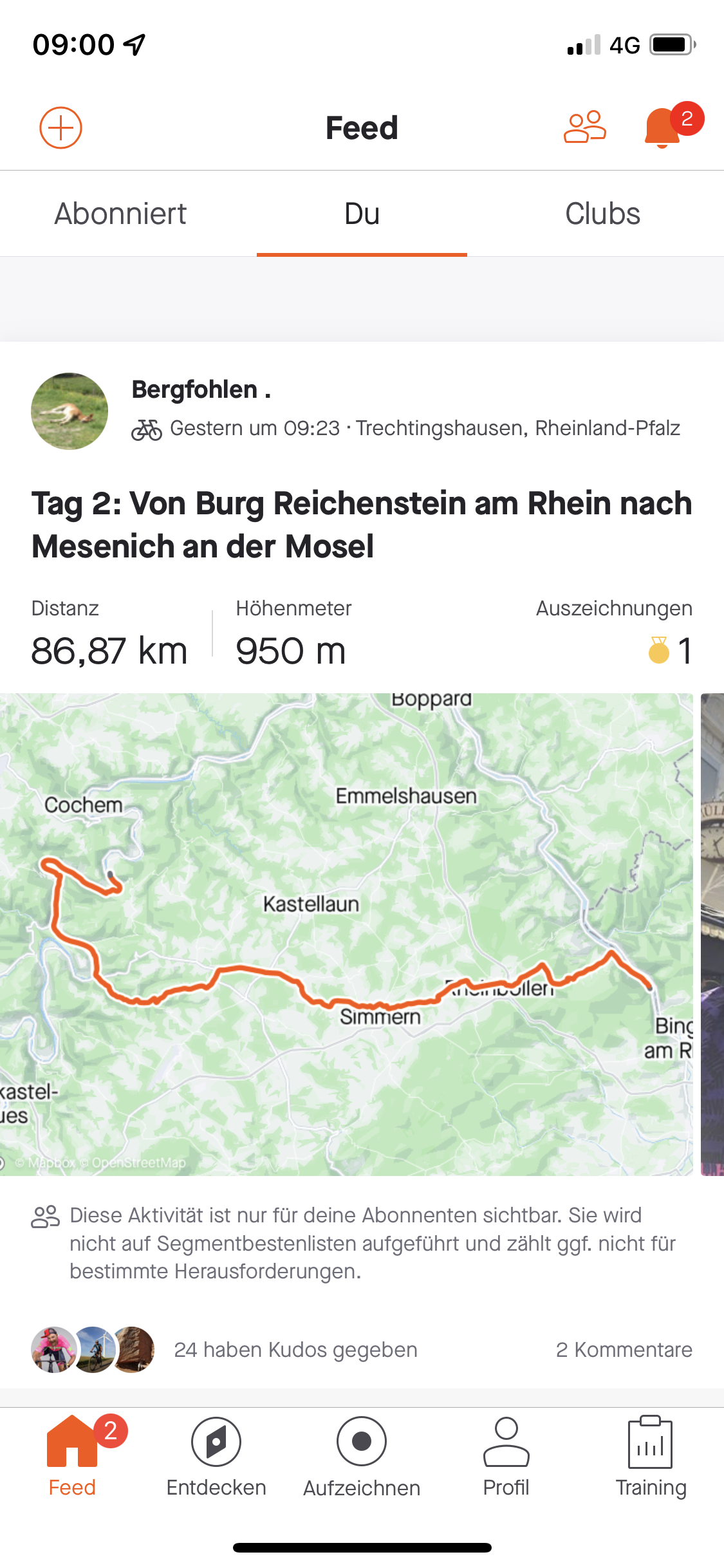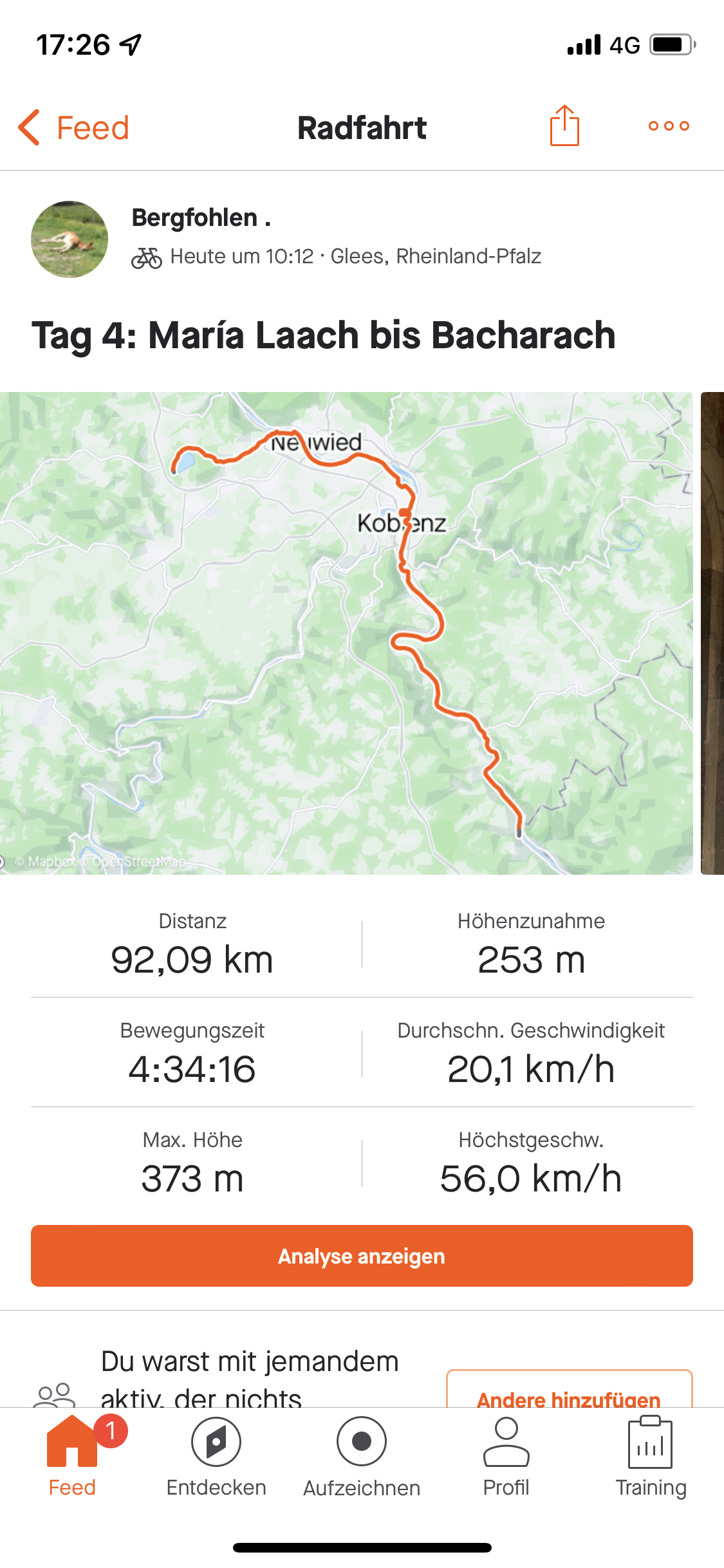 94 km und 250 Hm. Obwohl es heute kaum Bergauf-Meter waren, hat sich für mich diese Etappe am anstrengendsten angefühlt. Ich denke, neben der schwülen Hitze sind die Höhenmeter der beiden vorhergehenden Tage sind die Ursache :-). Eine wunderschöne Tour mit insgesamt rund 300 km haben wir in den vergangen vier Tagen verbracht, tolle Wegeindrücke, eine abwechslungsreiche Natur und ziemlich viel Historie haben uns begleitet. Ich persönlich finde es viel spannender nicht nur an der Mosel oder am Rhein zu fahren, sondern auch das hügelige Umland von Hunsrück und Mosel zu berücksichtigen, da es auch eine sehr interessante Abwechslung bietet und nicht so überlaufen ist.