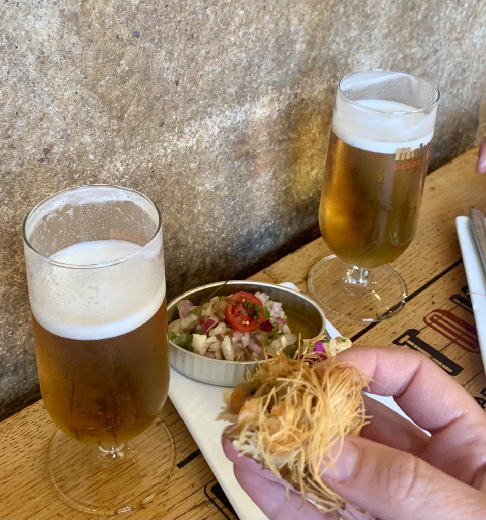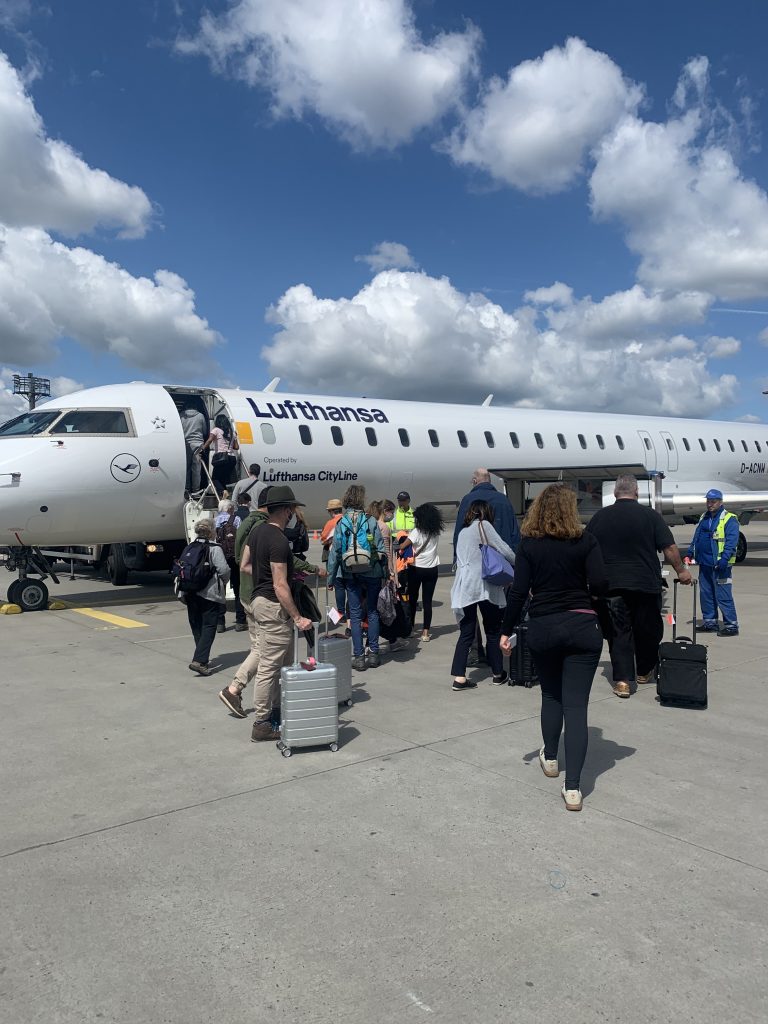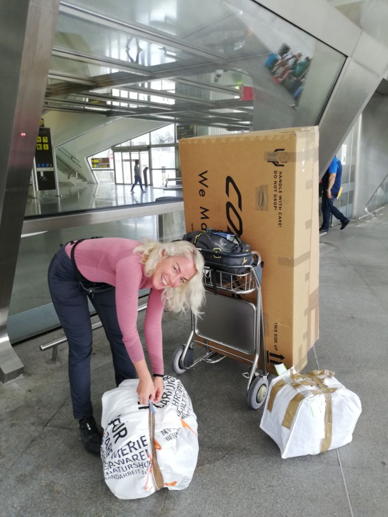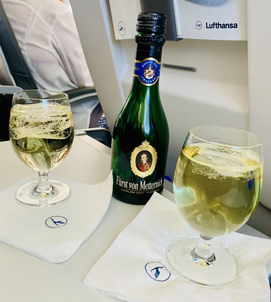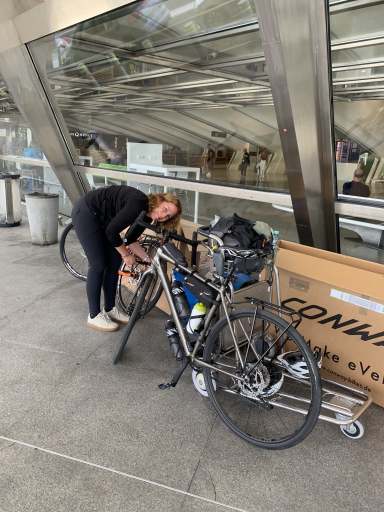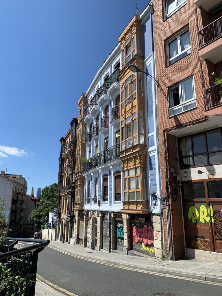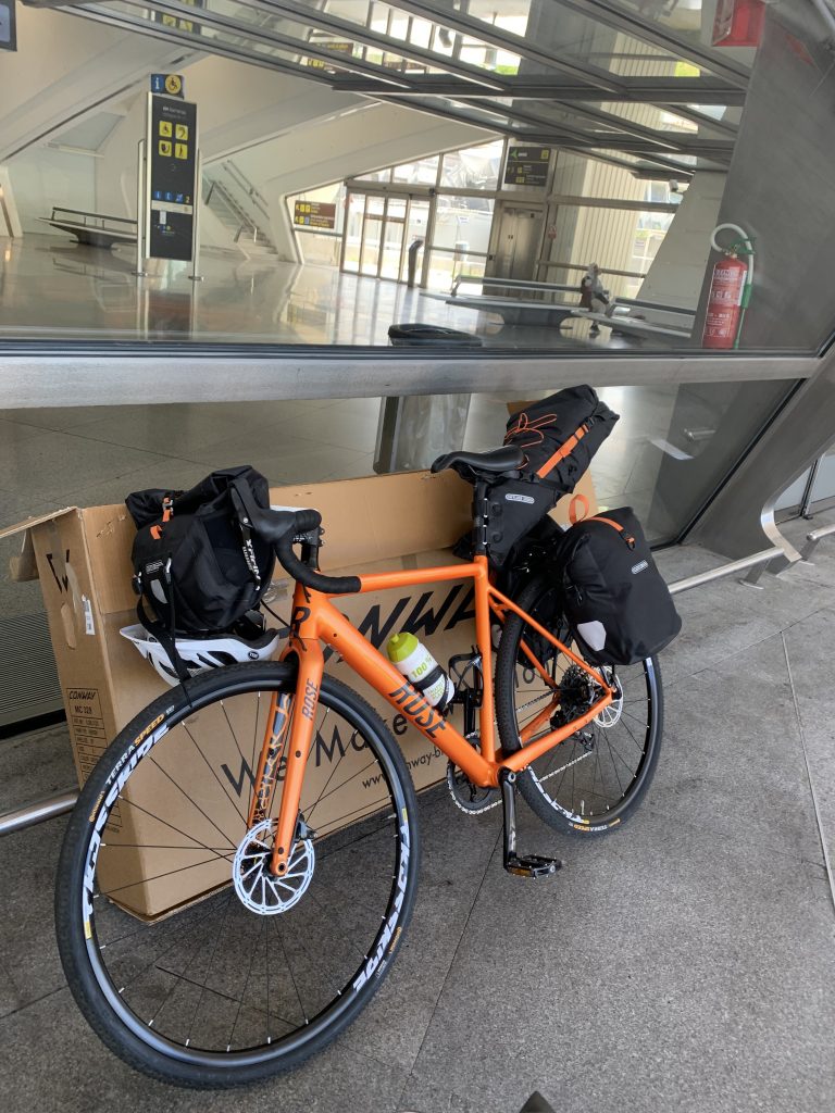 Die Lufthansa fliegt uns und unsere Bikes nach Bilbao. Leider mit mehr Stress als angenommen. Der Flieger wurde verkleinert, daher wollten sie zunächst nur ein Fahrrad annehmen. Für beide Bikes hatten wir eine Bestätigung für die Mitnahme als Sperrgepäck. Auch Lianes Powerbank war anfangs zu groß. Aber nach mehrmaligen Nachfragen beim Check-In ging es dann trotzdem. Im Flieger stoßen wir mit einem leckeren Riesling-Sekt auf die Reise an. Am Flughafen von Bilbao läuft alles perfekt, die Räder kommen sofort an einem Sonderband an und wir bauen sie schnell zusammen. Die Kisten lassen wir frecherweise einfach neben einem Mülleimer am Taxistand stehen. Wir bitten um Verzeihung, lieber Aeroporte Bilbao. Bis in die Altstadt von Bilbao sind es nur 11km. Unsere Bikes dürfen auch mit aufs Zimmer.