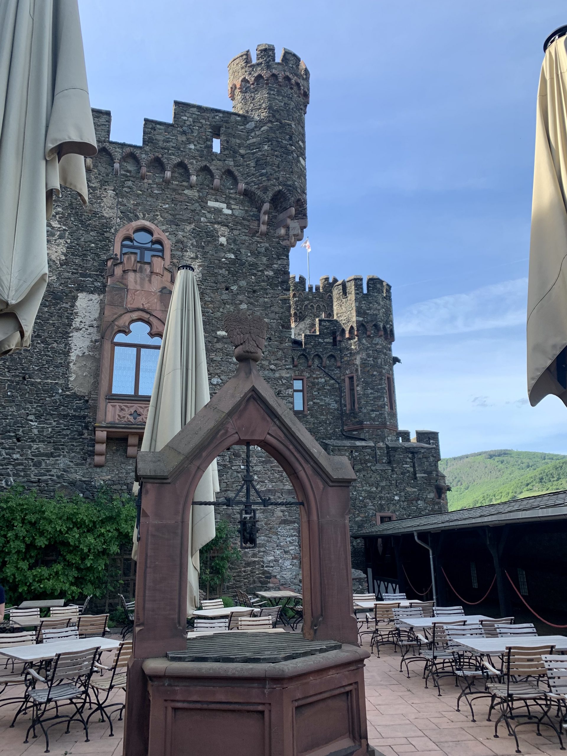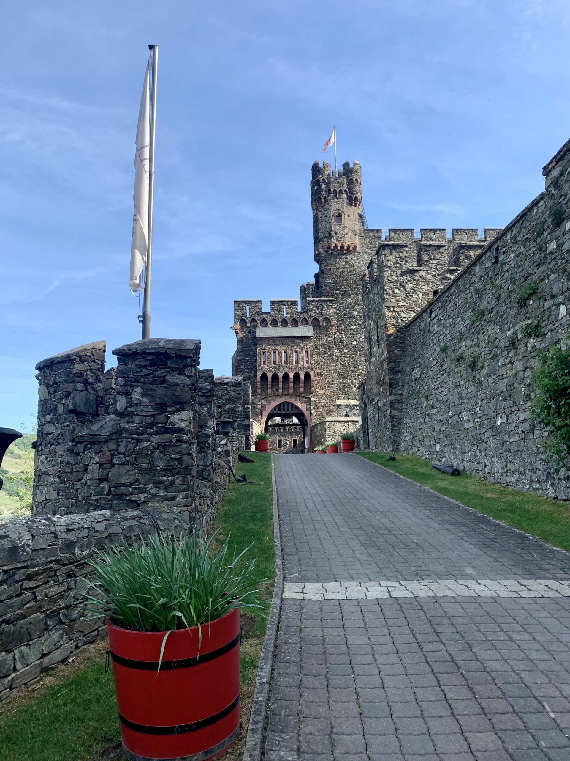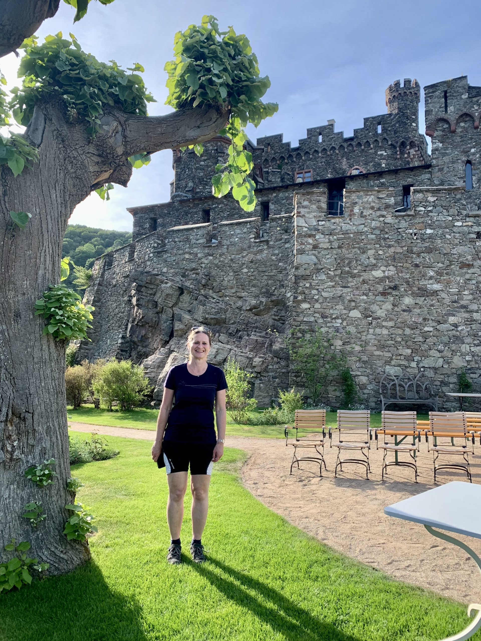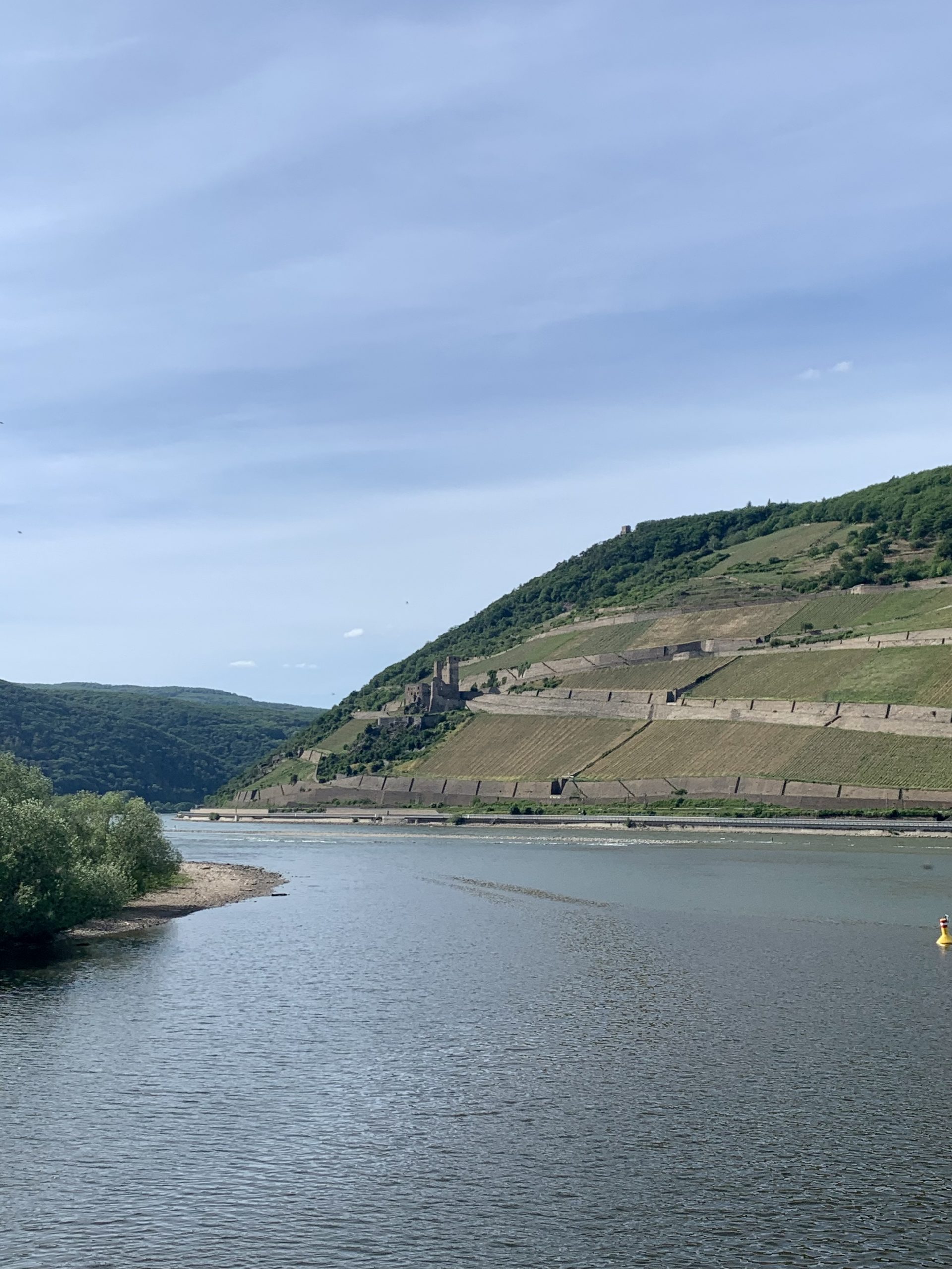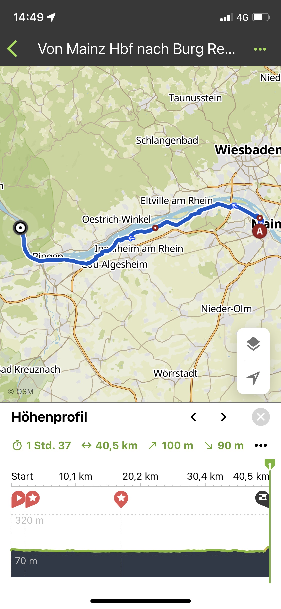 Ein Bike-Mosel-Eifel-Wochenende ist geplant. Am Freitag Nachmittag starten Dani und ich um 15h von Mainz am rheinhessischen Rheinufer entlang nach Trechtingshausen bei Bingen. Unser Ziel ist die sehr gute erhaltene Burg Reichenstein, die oberhalb des Rheintals thront. Nach 40 km erwartet uns ein wunderbar renoviertes Burghotel mit gratis Museumsbesuch. Reichenstein ist wirklich sehenswert, ein schöner Ausblick auf die Weinberge des Mittelrheintals. Abendessen und Frühstück genießen wir bei herrlichem Wetter auf der Terrasse.