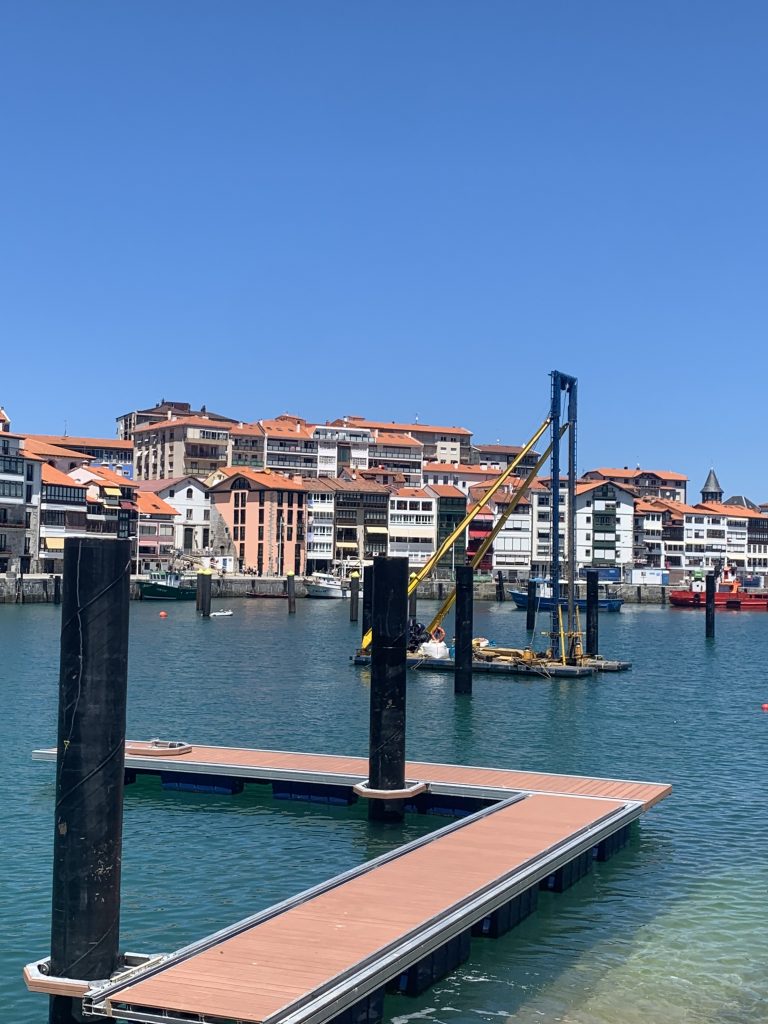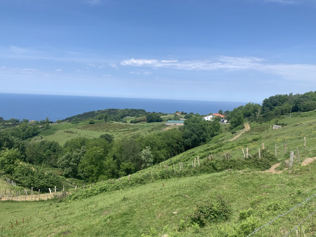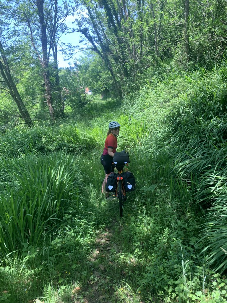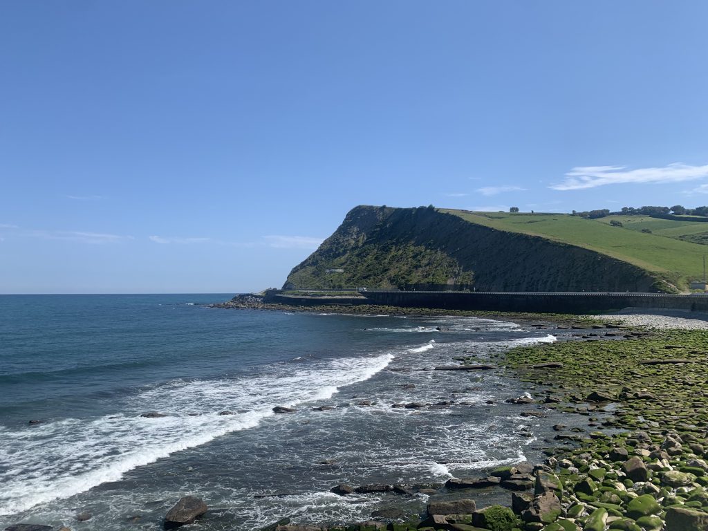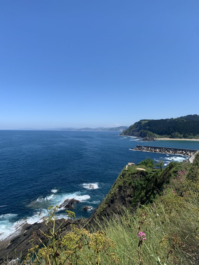 Die heutige Tour startet mit einem fiesen Anstieg, dann versucht ein älterer Herr mit uns im nächsten Dorf zu erzählen, er kann nur Spanisch, merkt aber nicht, dass wir nur ein bisschen verstehen. Er fragt uns, warum wir nicht den Zug nehmen, ist doch viel leichter…als wir dann gleich darauf Anstiege von über 21% haben, verstehen wir ihn. Aber wir sind halt “Animales“, wie uns die Bauarbeiter zurufen, die am Wegesrand stehen. Die weitere Komootplanung wird ausgeschlagen, es geht einfach nicht, mit dem ganzen Gepäck Moutainbikewege in der Pampa mit der Steigung zu fahren, es wird jetzt auf Rennrad-Profil umgestellt. Das führt uns auch zum hübschen Städtchen Getaria, wo wir auf einer Terrasse Kaffee trinken und zu cooler Musik aufs Meer schauen. Ein Rennradler begleitet uns ein Stück, er ist aus Frankreich und fährt in 10 Tagen von Bilbao nach Lyon zurück, nur etwas schneller als wir und ohne Zelt. Dann überredet uns Komoot doch wieder die Route zu verlassen und lockt uns ins Gelände. Eine Dame, die wir treffen, versucht uns vor einem steinigen Weg zur retten und schickt uns auf einen ihr bekannten Weg. Nur wird dieser ein immer dichter bewachsenen Dornenweg, der schließlich in den schönsten Sumpfpflanzen endet (siehe Foto unten)…Wahrscheinlich war sie dort in den letzten 20 Jahren nicht mehr.