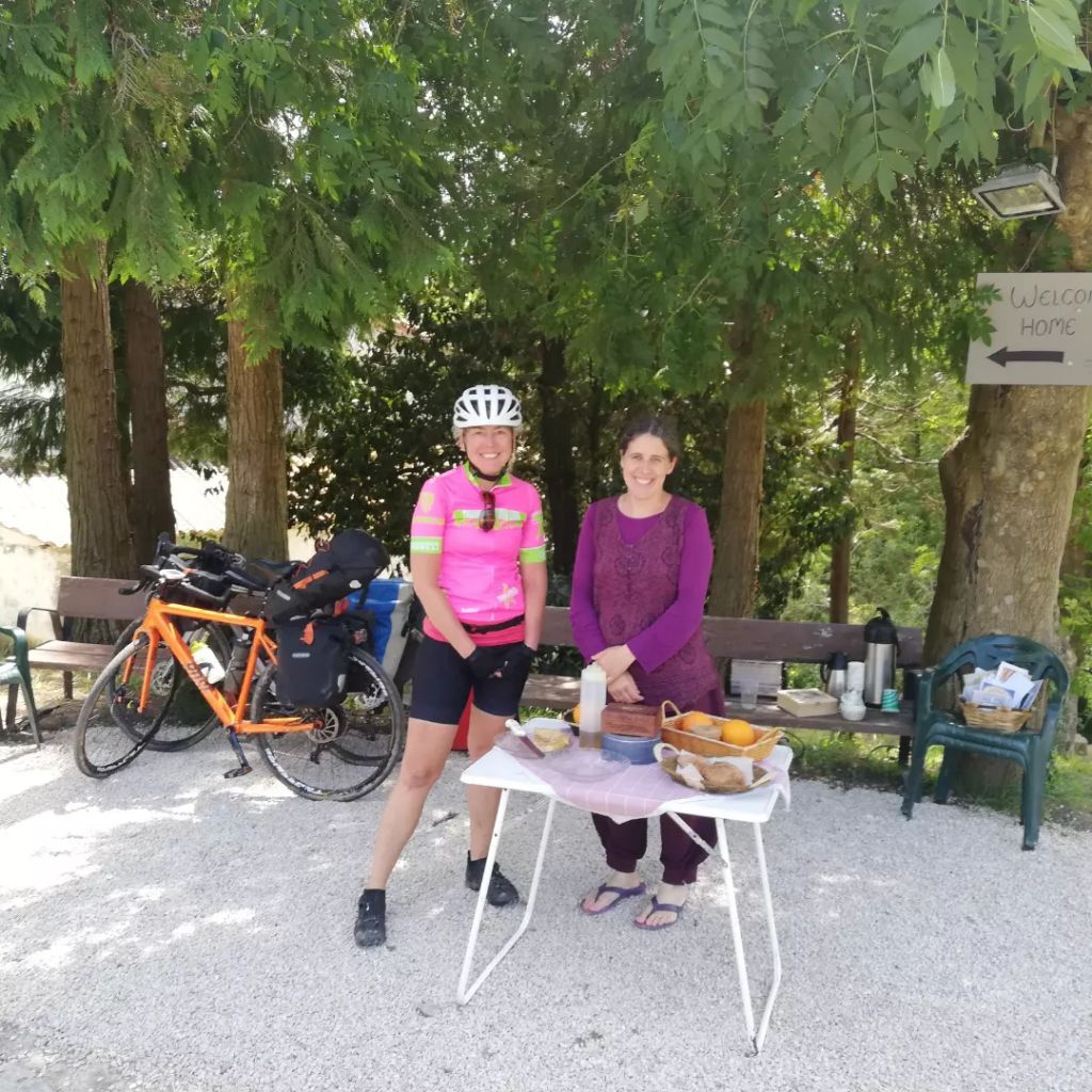 Heute schreibt die Zwillingsschwester den Blog…müssen ja die Arbeit aufteilen. Die erste Nacht im Zelt war ok. Es hat nur bis 13 Grad abgekühlt, Mary muss also ihren “Minusgrade“-Schlafsack nicht voll ausnutzen. Sie liegt aber trotzdem voll eingemummelt neben mir. Schlafgeräusche höre ich nicht, also sehr ruhig auf dem Platz. Sind aber auch die einzigen Camper, sonst nur feste Mobile. Frühstück gibt´s im Bett, Weißbrot mit Käse und Ceranoschinken. Mary überredet mich die quietschende Bremse von Möhrchen (mein oranges Gravelbike) zu checken, weil die beim Schieben extrem quietscht. Als die Vorderradbremse total aus- und wieder eingebaut ist, stellen wir fest, dass es die Hinterradbremse ist! Oh man! Da wir kein Bock haben, dass Prozedere zu wiederholen, drückt Mary nur mal kurz drauf, und siehe da, es hört auf zu quietschen!