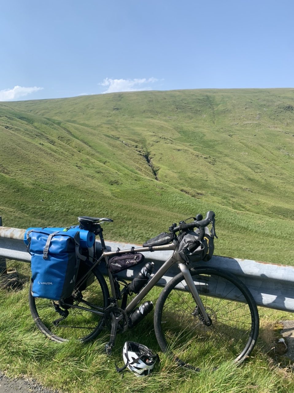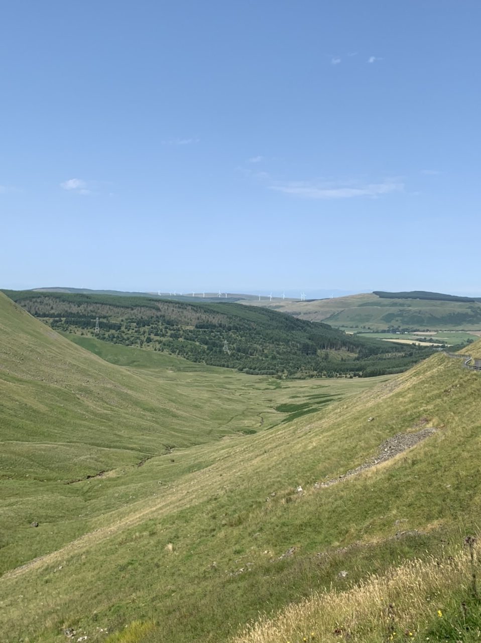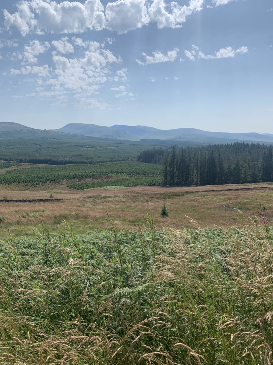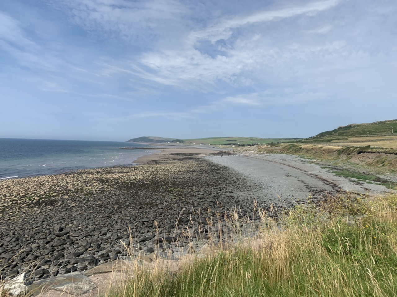 Am nächsten Morgen gehts nach einigen Plaudereien tiefer in die Berge. Endlich taucht die Sonne auf und es wird mal so richtig warm hier. Great. Wir schwitzen zwar aber beklagen uns garantiert nicht. Die Ausblicke in die Berge sind gigantisch schön, weite Wiesen, dann Wälder und obendrüber ein paar Felsen. Alles unbewohnt und frei. Und wieder nahezu kein Verkehr. Mir gefällt hier in den Bergen (unser Pass war nur 380 m hoch und kam uns vor wie in den Alpen). Es ist ein Traum. Wir fahren happy bergab, durch zwei kleine Dörfer, holen uns ein Eis und weiter geht es ordentlich bergauf bis wir irgendwann wieder am Kamm des Berges ankommen und auf der anderen Seite das blaue Meer mit der schottischen Insel Arran sehen. In Ayr finden wir keinen Campingplatz aber wir werden weitergeleitet bis Prestwick. Dort gibt es einen Caravanpark der auch Zelte aufnimmt, direkt an den Dünen. Wir kriegen vin der Mitarbeiterin Brot und ein einheimisches Getränk in der Dose geschenkt. Liane springt ins Meer und ich mache einen Spaziergang am Meer. Endlich mal Sommer hier, er kann gerne noch bleiben. Abends setzt sich der Pubbesitzer zu uns und gibt Tipps, wo wir hinfahren sollen. Er ist etwas überdreht, hat aber Witz und gibt uns einen Babyguinness aus. Das ist ein Bailey’s mit Tiamaria. 😅😋