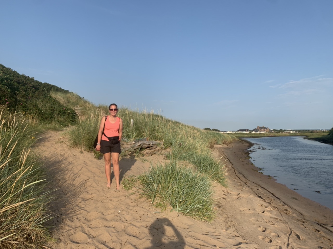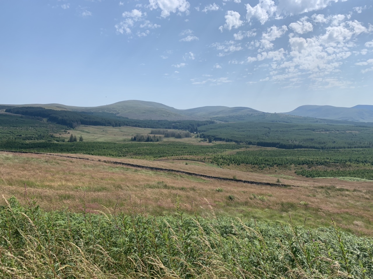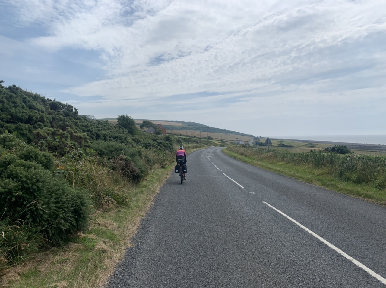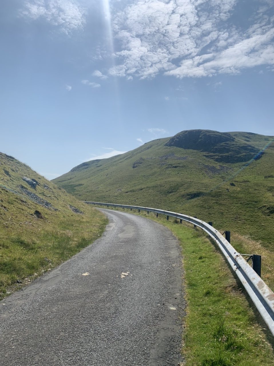 Am nächsten Morgen gehts nach einigen Plaudereien tiefer in die Berge. Endlich taucht die Sonne auf und es wird mal so richtig warm hier. Great. Wir schwitzen zwar aber beklagen uns garantiert nicht. Die Ausblicke in die Berge sind gigantisch schön, weite Wiesen, dann Wälder und obendrüber ein paar Felsen. Alles unbewohnt und frei. Und wieder nahezu kein Verkehr. Mir gefällt hier in den Bergen (unser Pass war nur 380 m hoch und kam uns vor wie in den Alpen). Es ist ein Traum. Wir fahren happy bergab, durch zwei kleine Dörfer, holen uns ein Eis und weiter geht es ordentlich bergauf bis wir irgendwann wieder am Kamm des Berges ankommen und auf der anderen Seite das blaue Meer mit der schottischen Insel Arran sehen. In Ayr finden wir keinen Campingplatz aber wir werden weitergeleitet bis Prestwick. Dort gibt es einen Caravanpark der auch Zelte aufnimmt, direkt an den Dünen. Wir kriegen vin der Mitarbeiterin Brot und ein einheimisches Getränk in der Dose geschenkt. Liane springt ins Meer und ich mache einen Spaziergang am Meer. Endlich mal Sommer hier, er kann gerne noch bleiben. Abends setzt sich der Pubbesitzer zu uns und gibt Tipps, wo wir hinfahren sollen. Er ist etwas überdreht, hat aber Witz und gibt uns einen Babyguinness aus. Das ist ein Bailey’s mit Tiamaria. 😅😋