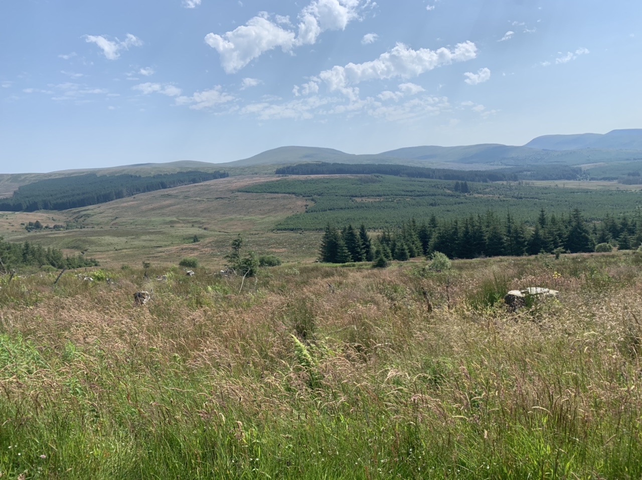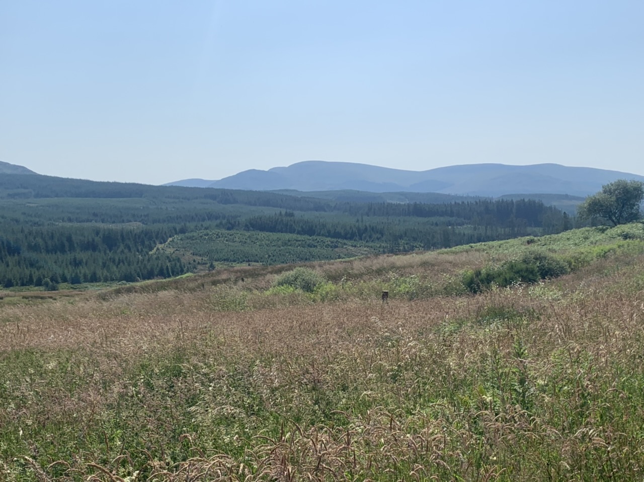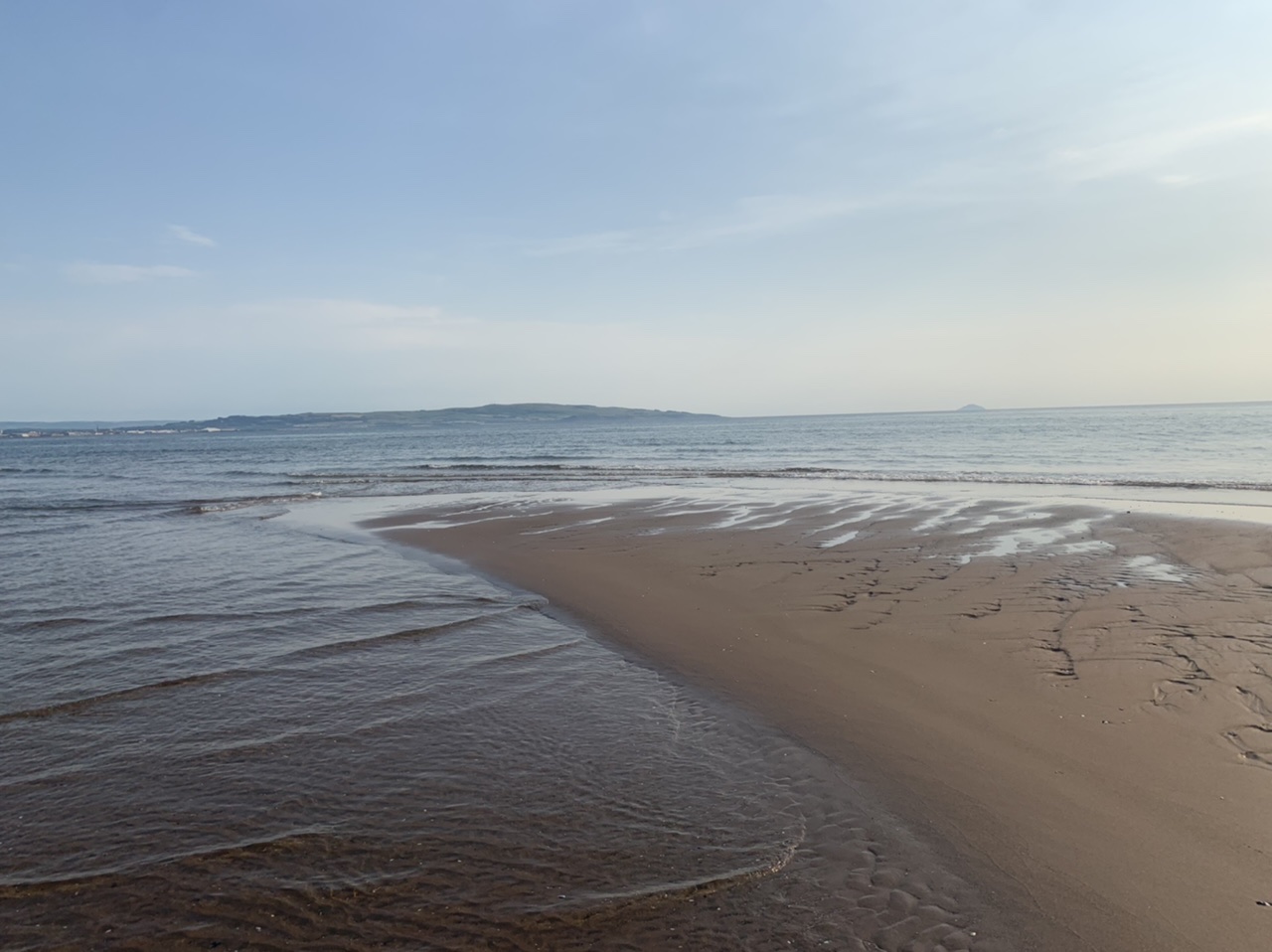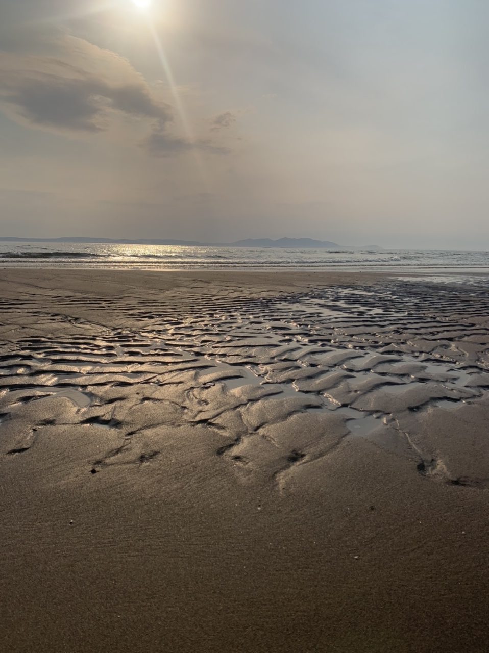 Am nächsten Morgen gehts nach einigen Plaudereien tiefer in die Berge. Endlich taucht die Sonne auf und es wird mal so richtig warm hier. Great. Wir schwitzen zwar aber beklagen uns garantiert nicht. Die Ausblicke in die Berge sind gigantisch schön, weite Wiesen, dann Wälder und obendrüber ein paar Felsen. Alles unbewohnt und frei. Und wieder nahezu kein Verkehr. Mir gefällt hier in den Bergen (unser Pass war nur 380 m hoch und kam uns vor wie in den Alpen). Es ist ein Traum. Wir fahren happy bergab, durch zwei kleine Dörfer, holen uns ein Eis und weiter geht es ordentlich bergauf bis wir irgendwann wieder am Kamm des Berges ankommen und auf der anderen Seite das blaue Meer mit der schottischen Insel Arran sehen. In Ayr finden wir keinen Campingplatz aber wir werden weitergeleitet bis Prestwick. Dort gibt es einen Caravanpark der auch Zelte aufnimmt, direkt an den Dünen. Wir kriegen vin der Mitarbeiterin Brot und ein einheimisches Getränk in der Dose geschenkt. Liane springt ins Meer und ich mache einen Spaziergang am Meer. Endlich mal Sommer hier, er kann gerne noch bleiben. Abends setzt sich der Pubbesitzer zu uns und gibt Tipps, wo wir hinfahren sollen. Er ist etwas überdreht, hat aber Witz und gibt uns einen Babyguinness aus. Das ist ein Bailey’s mit Tiamaria. 😅😋