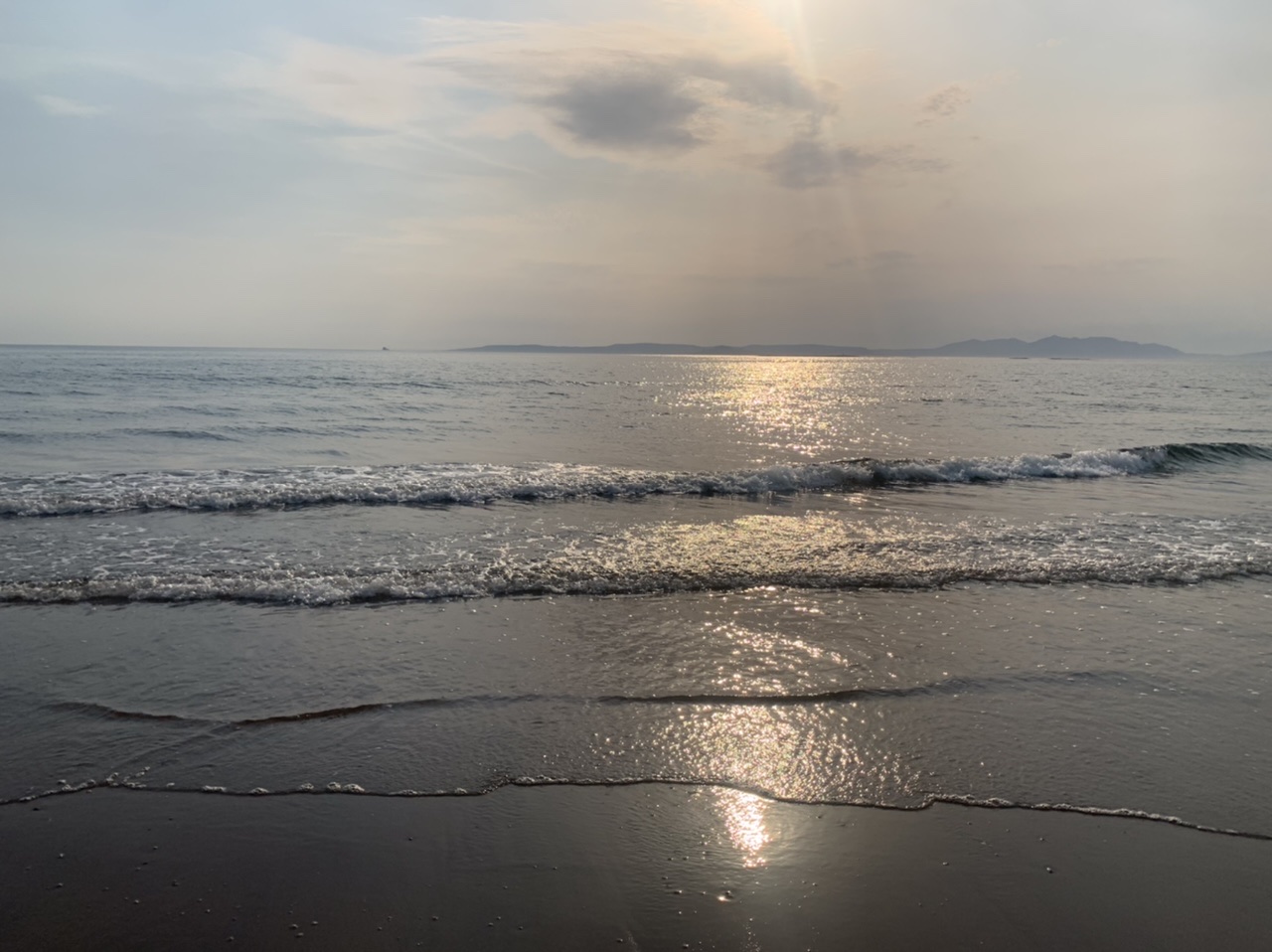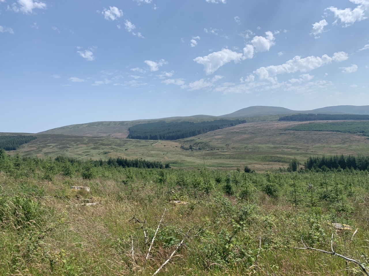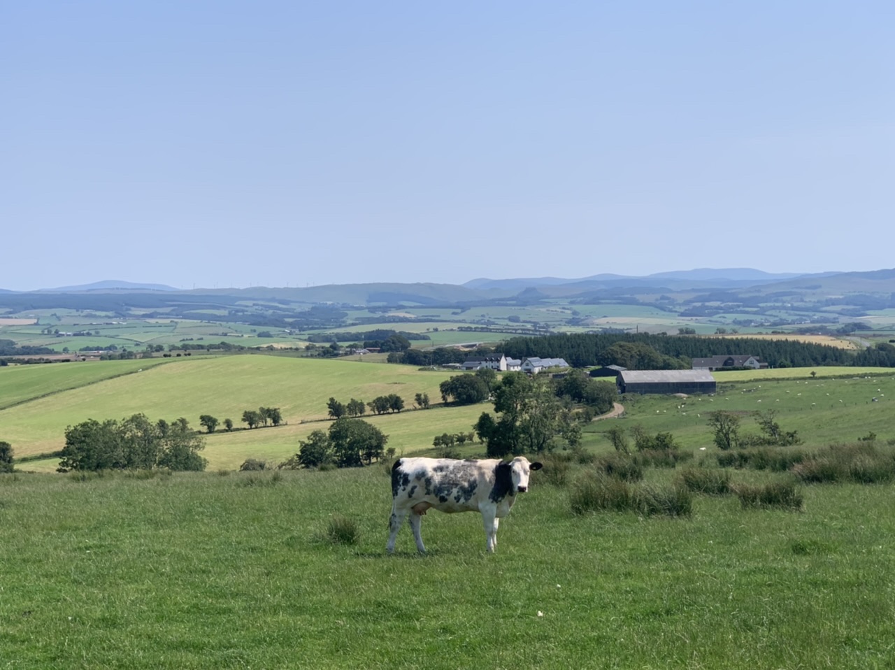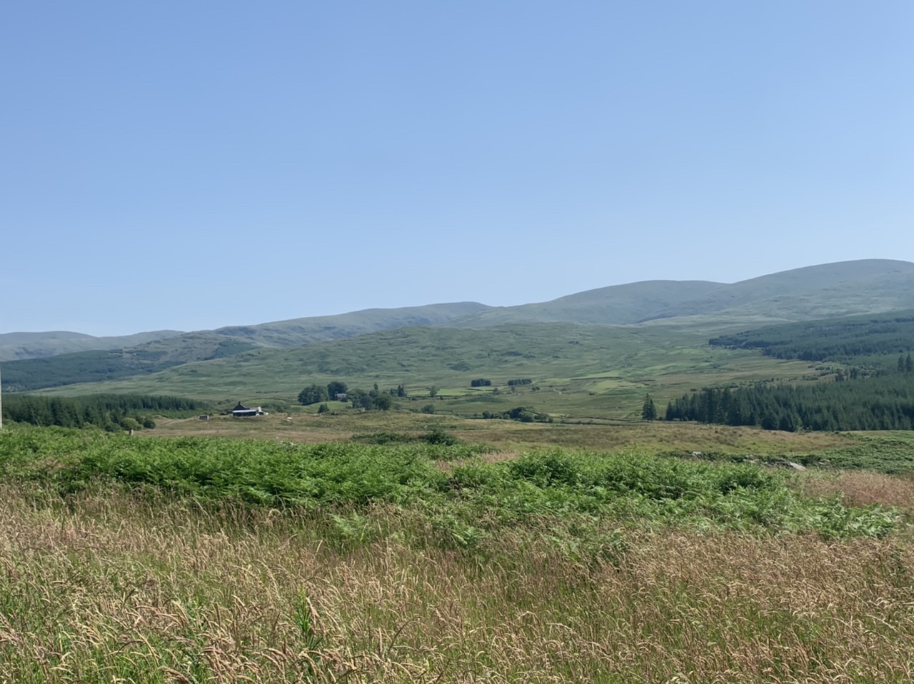 Am nächsten Morgen gehts nach einigen Plaudereien tiefer in die Berge. Endlich taucht die Sonne auf und es wird mal so richtig warm hier. Great. Wir schwitzen zwar aber beklagen uns garantiert nicht. Die Ausblicke in die Berge sind gigantisch schön, weite Wiesen, dann Wälder und obendrüber ein paar Felsen. Alles unbewohnt und frei. Und wieder nahezu kein Verkehr. Mir gefällt hier in den Bergen (unser Pass war nur 380 m hoch und kam uns vor wie in den Alpen). Es ist ein Traum. Wir fahren happy bergab, durch zwei kleine Dörfer, holen uns ein Eis und weiter geht es ordentlich bergauf bis wir irgendwann wieder am Kamm des Berges ankommen und auf der anderen Seite das blaue Meer mit der schottischen Insel Arran sehen. In Ayr finden wir keinen Campingplatz aber wir werden weitergeleitet bis Prestwick. Dort gibt es einen Caravanpark der auch Zelte aufnimmt, direkt an den Dünen. Wir kriegen vin der Mitarbeiterin Brot und ein einheimisches Getränk in der Dose geschenkt. Liane springt ins Meer und ich mache einen Spaziergang am Meer. Endlich mal Sommer hier, er kann gerne noch bleiben. Abends setzt sich der Pubbesitzer zu uns und gibt Tipps, wo wir hinfahren sollen. Er ist etwas überdreht, hat aber Witz und gibt uns einen Babyguinness aus. Das ist ein Bailey’s mit Tiamaria. 😅😋