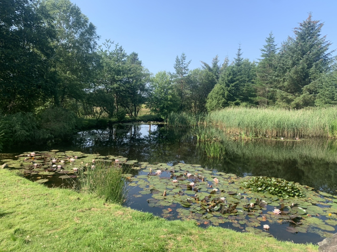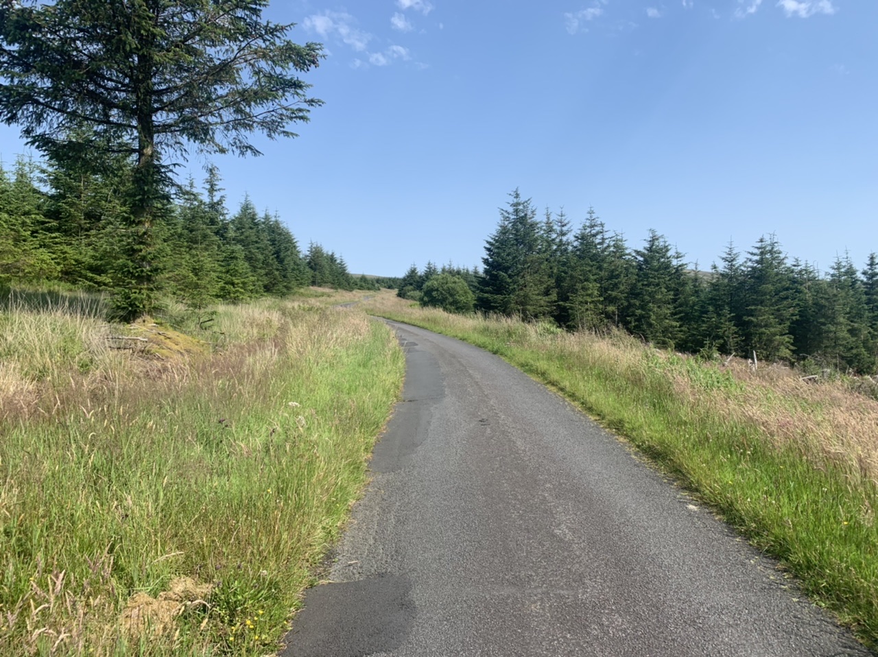 Wir erwachen in Sandhead auf dem Bauplatz am Strand mit Sprühregen, der sich aber zum Glück dann verp…st. Es war witzig, abseits der Mobilehomes auf dem zukünftigen Bauplatz des jungen Betreibers zu schlafen. Wir packen und machen uns auf dem Weg am Meer entlang, erst mit Mitwind aber bald mit heftigen Gegenwind. Gemütlich schiebe ich mich die Hügel hoch, schöne Wiesen mit schwarzen Kuhherden, ein paar Schafe, viele alte Steinhäuser am Meer. Schließlich verlassen wir das Meer und fahren quer durch Wälder und übers Land. Der Radweg ist super, kaum Verkehr und gute Straßen. Wir kommen nach Wigtown, kaufen im Coop Cola und O-Saft zur Stärkung. Dann gehts weiter aufwärts durch endlose Kiefernwälder, die leider auch unter der Trockenheit leiden mussten. Wieder ein toller Weg, kaum Verkehr, schöne Flüsse und kleine Dörfer. Unser Ziel Glentrool liegt mitten im Wald. Der Campingplatz bevölkert sich auch mit ein paar Radlern. Ein Niederländer und ein Engländer aus London sind mit dem Rad allein unterwegs. Abends gehen wir ins nächste Pub und bestellen einen Glendall Whiskey. Der Weg zum Pub ist mit bunten Steinen verschönert worden. Eine tolle Gegend. Manchmal habe ich das Gefühl schonmal hier gewesen zu sein. Ich habe vielleicht zu viele Bücher gelesen, die Schottland gehandelt haben.