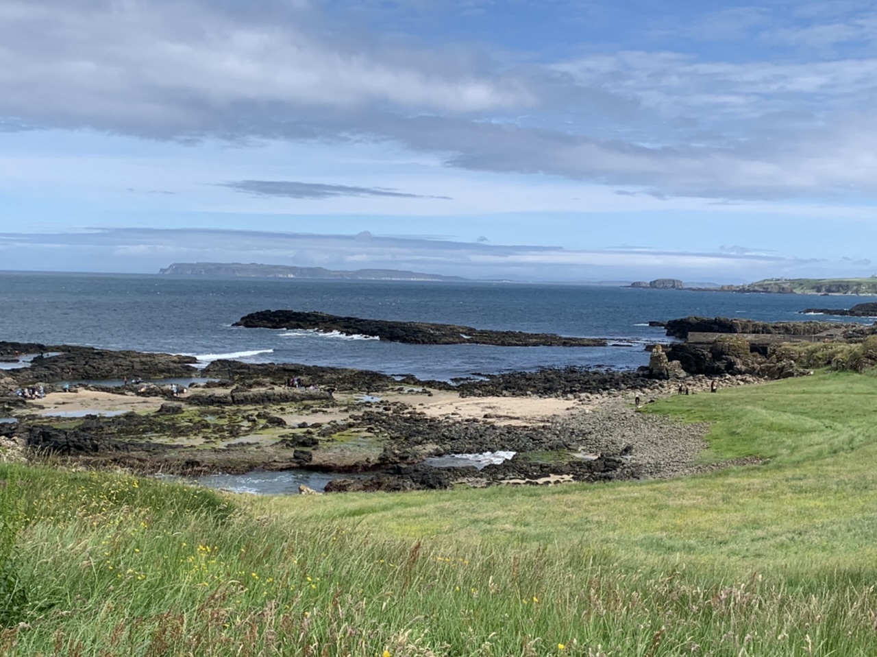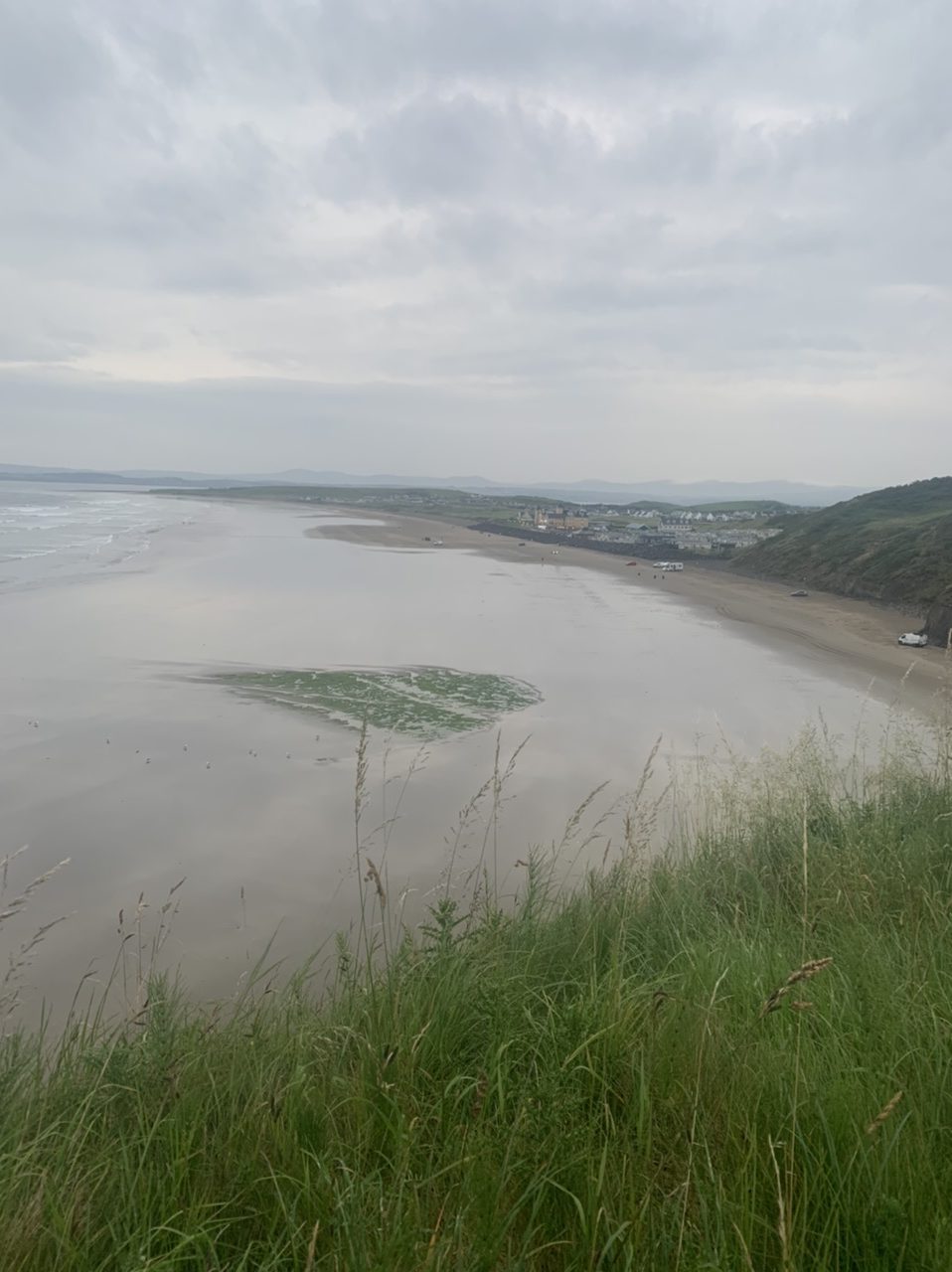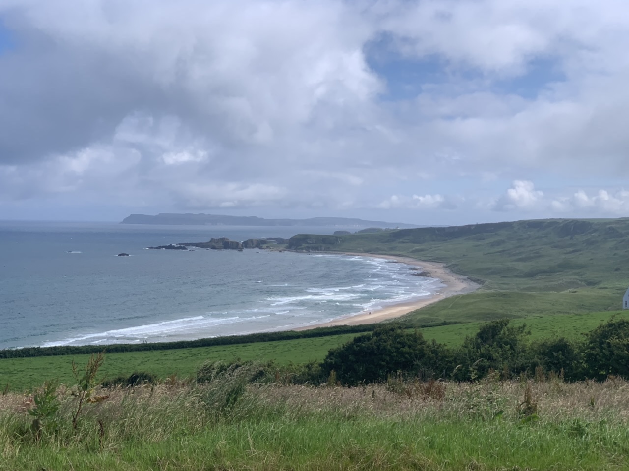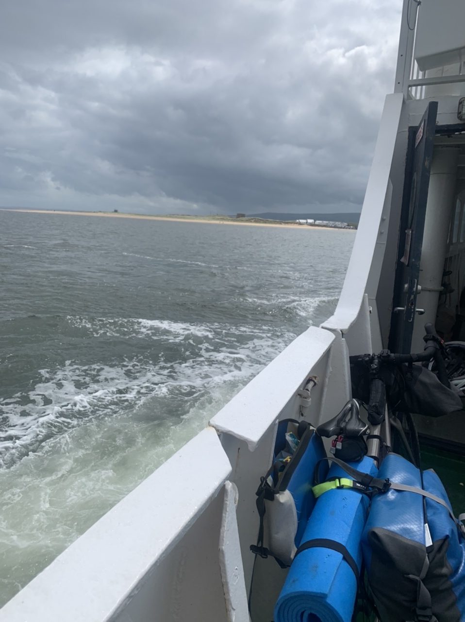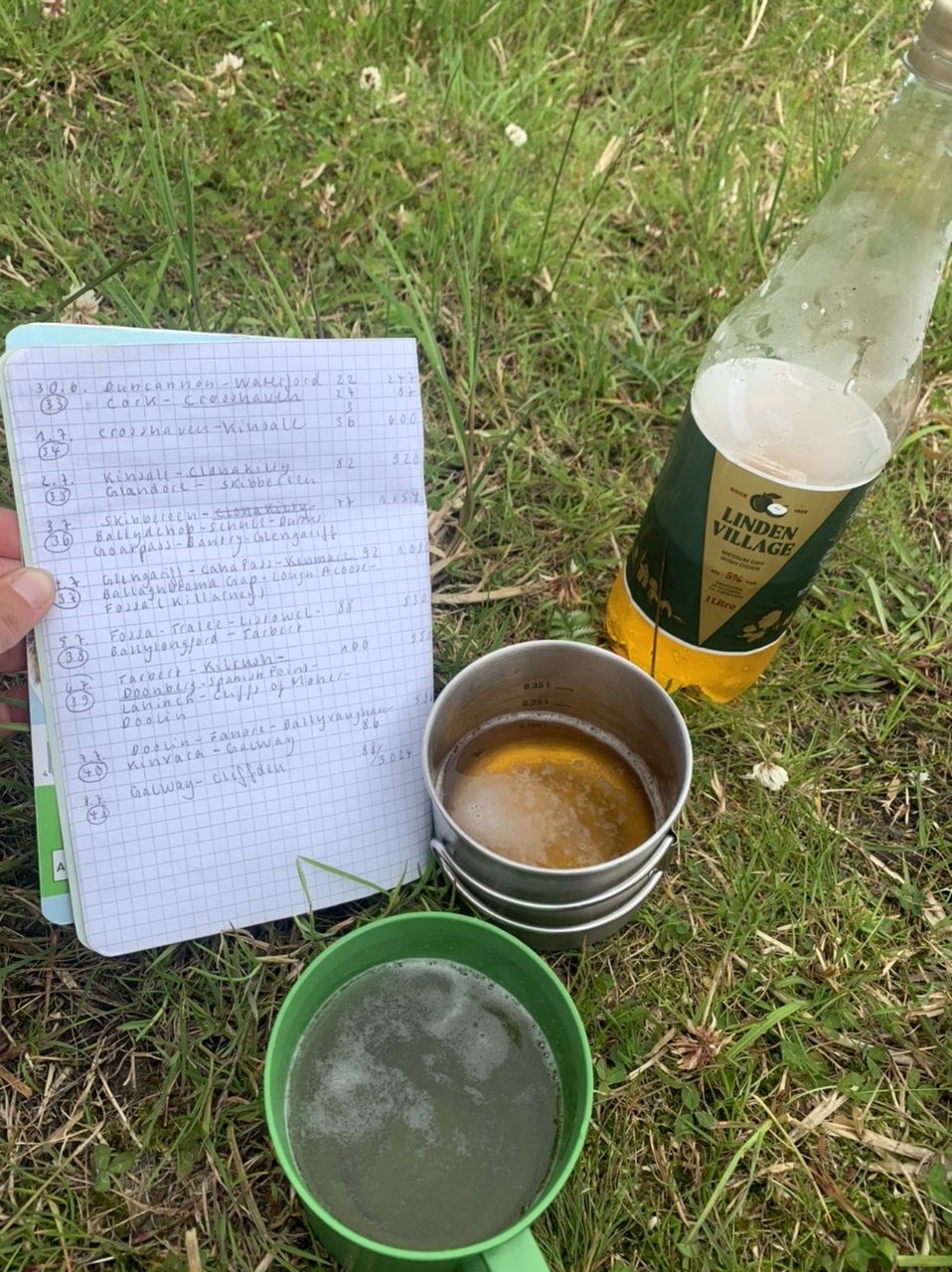 Am nächsten Morgen gehts nach einigen Plaudereien tiefer in die Berge. Endlich taucht die Sonne auf und es wird mal so richtig warm hier. Great. Wir schwitzen zwar aber beklagen uns garantiert nicht. Die Ausblicke in die Berge sind gigantisch schön, weite Wiesen, dann Wälder und obendrüber ein paar Felsen. Alles unbewohnt und frei. Und wieder nahezu kein Verkehr. Mir gefällt hier in den Bergen (unser Pass war nur 380 m hoch und kam uns vor wie in den Alpen). Es ist ein Traum. Wir fahren happy bergab, durch zwei kleine Dörfer, holen uns ein Eis und weiter geht es ordentlich bergauf bis wir irgendwann wieder am Kamm des Berges ankommen und auf der anderen Seite das blaue Meer mit der schottischen Insel Arran sehen. In Ayr finden wir keinen Campingplatz aber wir werden weitergeleitet bis Prestwick. Dort gibt es einen Caravanpark der auch Zelte aufnimmt, direkt an den Dünen. Wir kriegen vin der Mitarbeiterin Brot und ein einheimisches Getränk in der Dose geschenkt. Liane springt ins Meer und ich mache einen Spaziergang am Meer. Endlich mal Sommer hier, er kann gerne noch bleiben. Abends setzt sich der Pubbesitzer zu uns und gibt Tipps, wo wir hinfahren sollen. Er ist etwas überdreht, hat aber Witz und gibt uns einen Babyguinness aus. Das ist ein Bailey’s mit Tiamaria. 😅😋