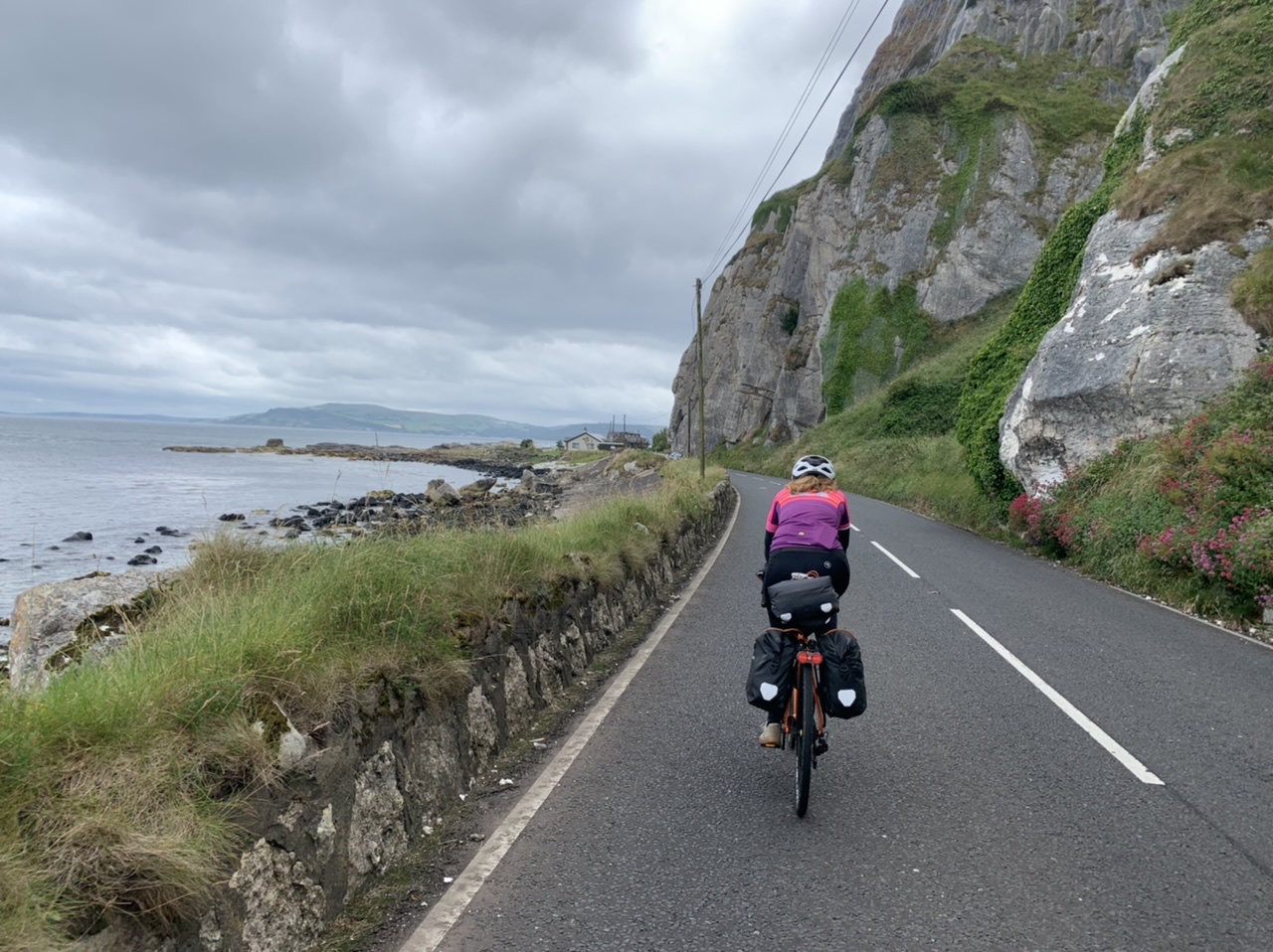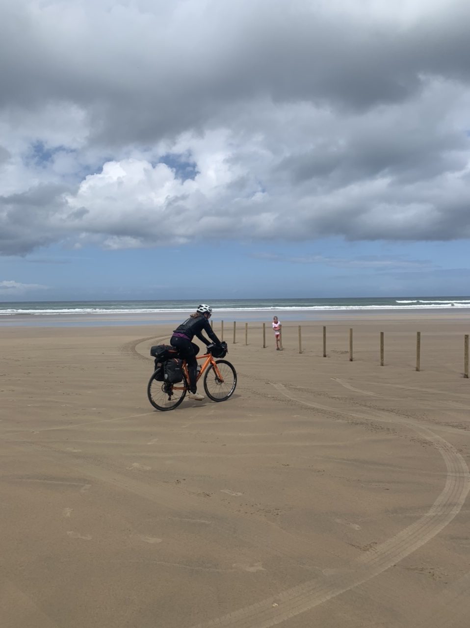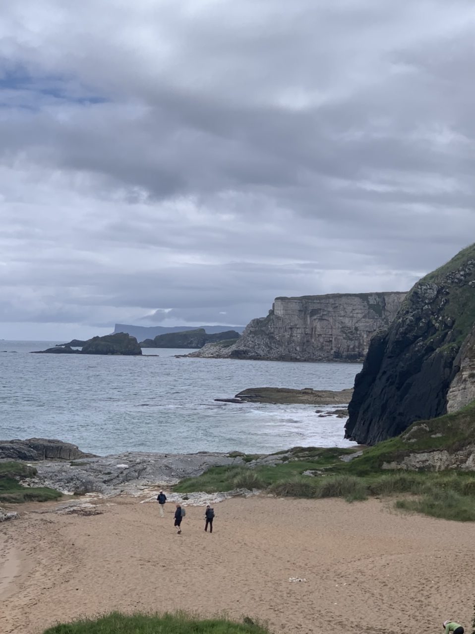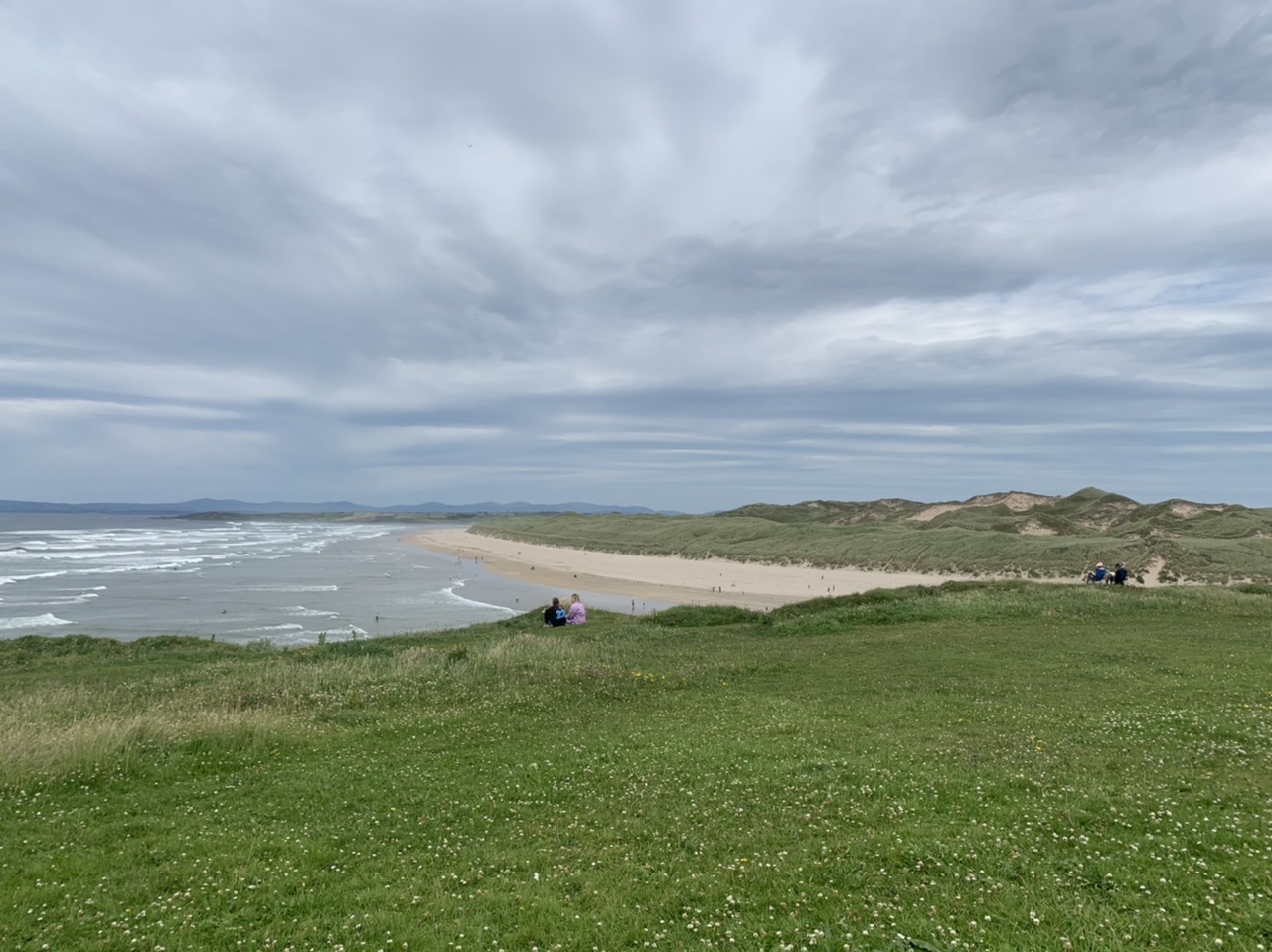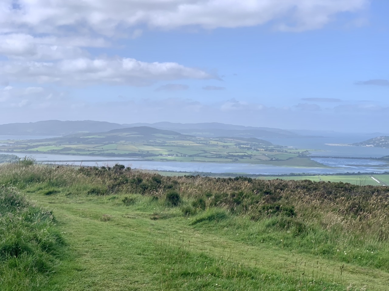 Am nächsten Morgen gehts nach einigen Plaudereien tiefer in die Berge. Endlich taucht die Sonne auf und es wird mal so richtig warm hier. Great. Wir schwitzen zwar aber beklagen uns garantiert nicht. Die Ausblicke in die Berge sind gigantisch schön, weite Wiesen, dann Wälder und obendrüber ein paar Felsen. Alles unbewohnt und frei. Und wieder nahezu kein Verkehr. Mir gefällt hier in den Bergen (unser Pass war nur 380 m hoch und kam uns vor wie in den Alpen). Es ist ein Traum. Wir fahren happy bergab, durch zwei kleine Dörfer, holen uns ein Eis und weiter geht es ordentlich bergauf bis wir irgendwann wieder am Kamm des Berges ankommen und auf der anderen Seite das blaue Meer mit der schottischen Insel Arran sehen. In Ayr finden wir keinen Campingplatz aber wir werden weitergeleitet bis Prestwick. Dort gibt es einen Caravanpark der auch Zelte aufnimmt, direkt an den Dünen. Wir kriegen vin der Mitarbeiterin Brot und ein einheimisches Getränk in der Dose geschenkt. Liane springt ins Meer und ich mache einen Spaziergang am Meer. Endlich mal Sommer hier, er kann gerne noch bleiben. Abends setzt sich der Pubbesitzer zu uns und gibt Tipps, wo wir hinfahren sollen. Er ist etwas überdreht, hat aber Witz und gibt uns einen Babyguinness aus. Das ist ein Bailey’s mit Tiamaria. 😅😋
