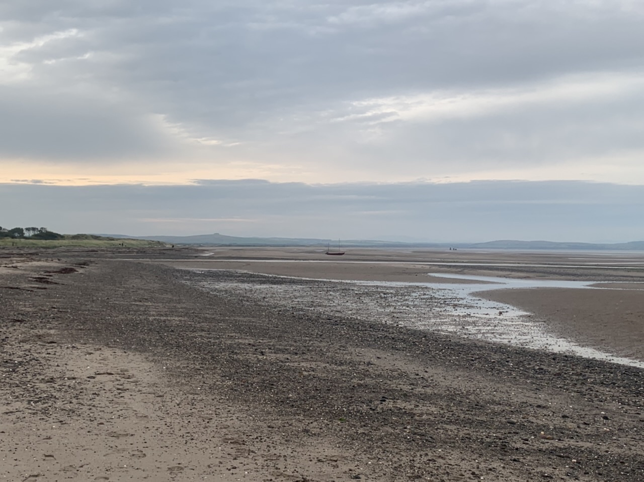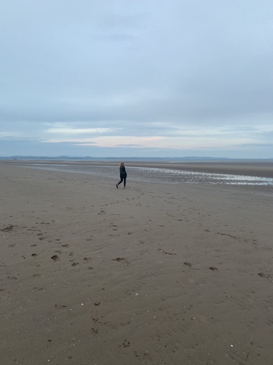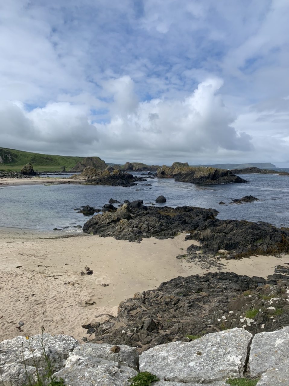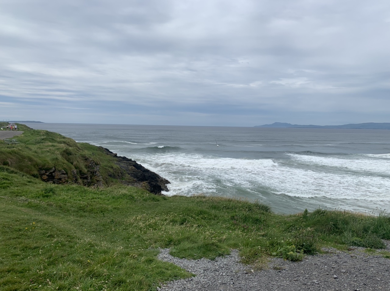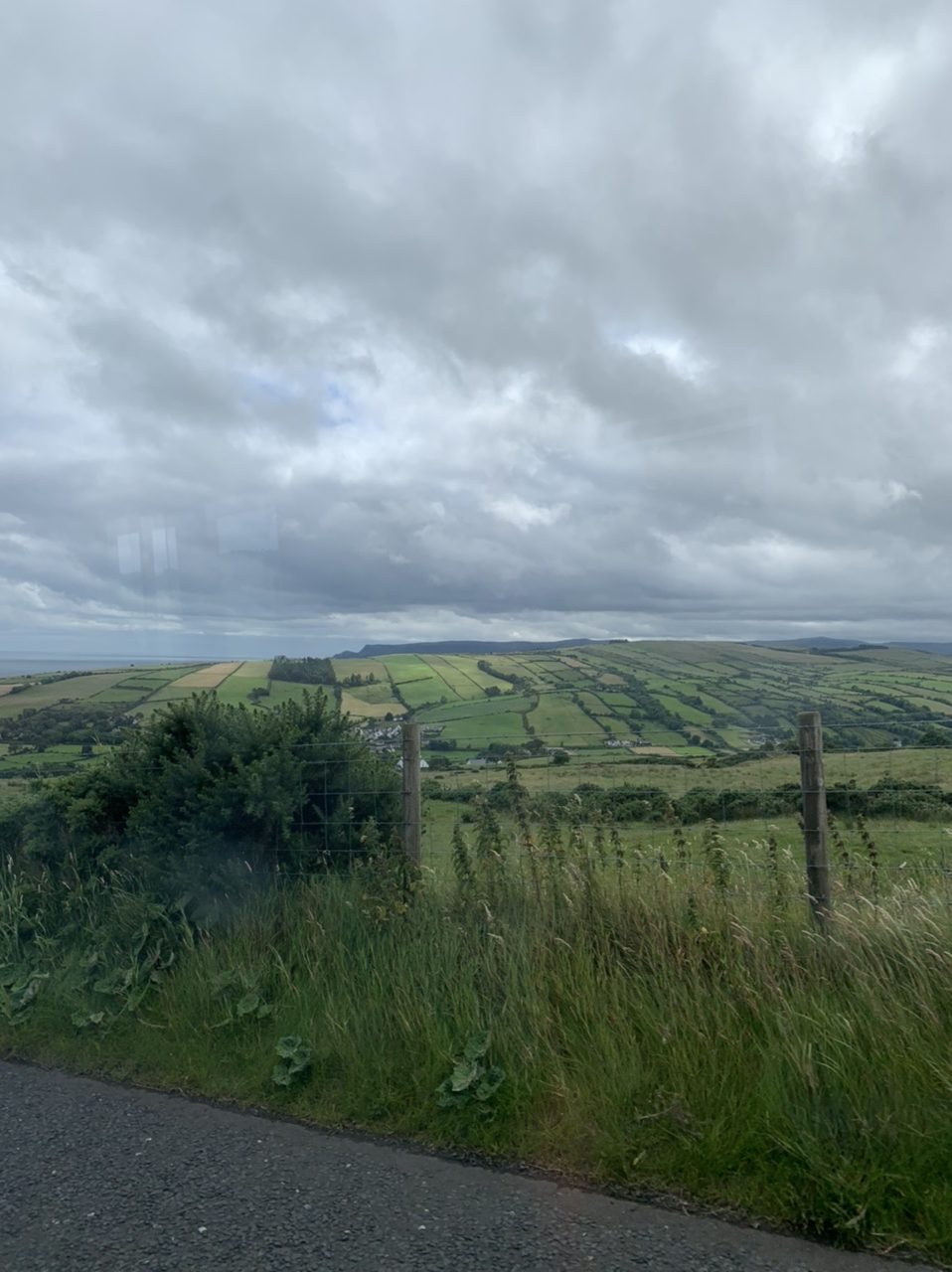 Am nächsten Morgen gehts nach einigen Plaudereien tiefer in die Berge. Endlich taucht die Sonne auf und es wird mal so richtig warm hier. Great. Wir schwitzen zwar aber beklagen uns garantiert nicht. Die Ausblicke in die Berge sind gigantisch schön, weite Wiesen, dann Wälder und obendrüber ein paar Felsen. Alles unbewohnt und frei. Und wieder nahezu kein Verkehr. Mir gefällt hier in den Bergen (unser Pass war nur 380 m hoch und kam uns vor wie in den Alpen). Es ist ein Traum. Wir fahren happy bergab, durch zwei kleine Dörfer, holen uns ein Eis und weiter geht es ordentlich bergauf bis wir irgendwann wieder am Kamm des Berges ankommen und auf der anderen Seite das blaue Meer mit der schottischen Insel Arran sehen. In Ayr finden wir keinen Campingplatz aber wir werden weitergeleitet bis Prestwick. Dort gibt es einen Caravanpark der auch Zelte aufnimmt, direkt an den Dünen. Wir kriegen vin der Mitarbeiterin Brot und ein einheimisches Getränk in der Dose geschenkt. Liane springt ins Meer und ich mache einen Spaziergang am Meer. Endlich mal Sommer hier, er kann gerne noch bleiben. Abends setzt sich der Pubbesitzer zu uns und gibt Tipps, wo wir hinfahren sollen. Er ist etwas überdreht, hat aber Witz und gibt uns einen Babyguinness aus. Das ist ein Bailey’s mit Tiamaria. 😅😋