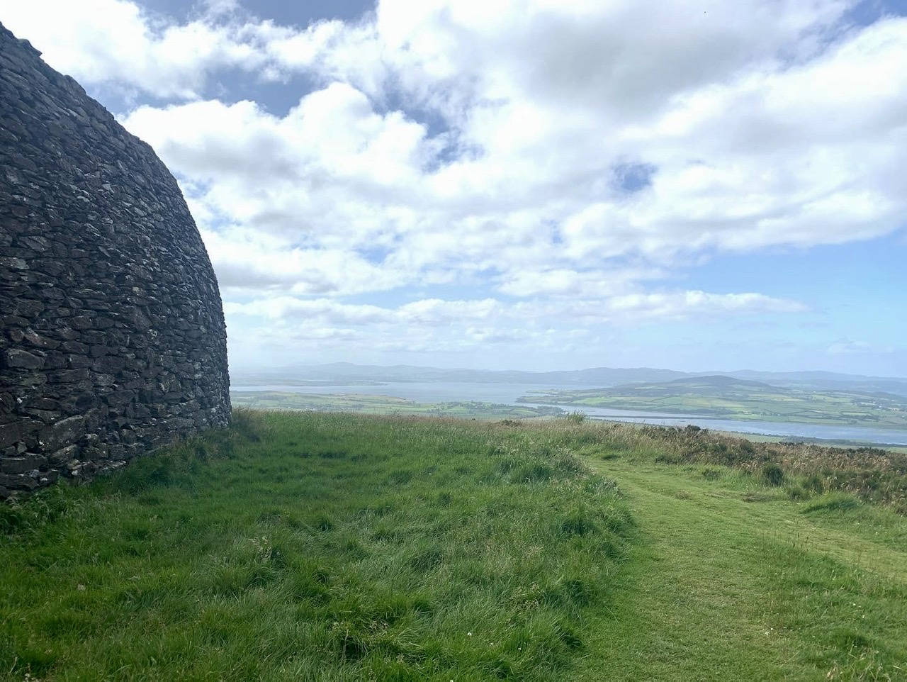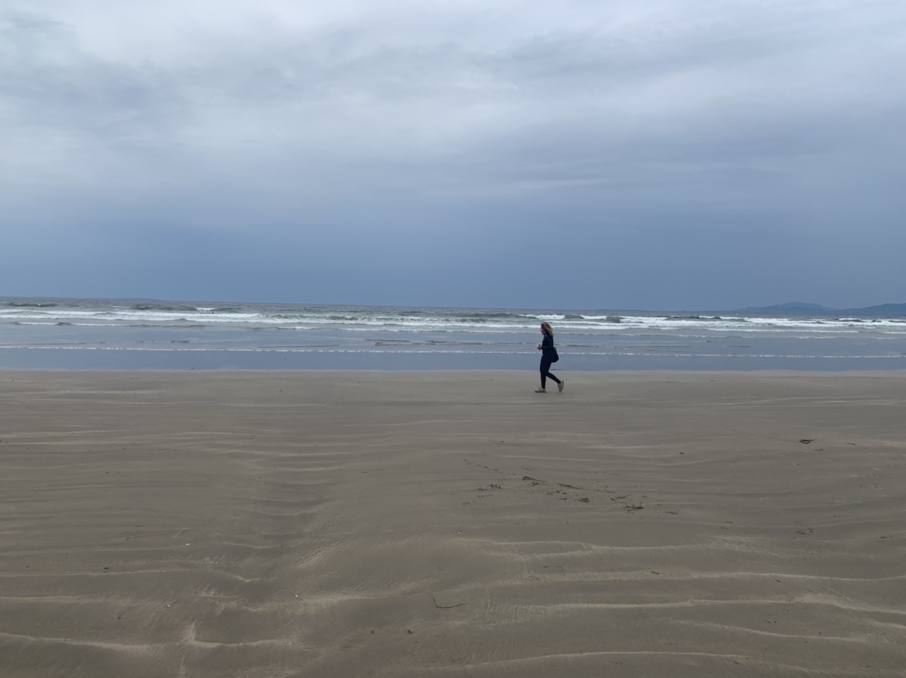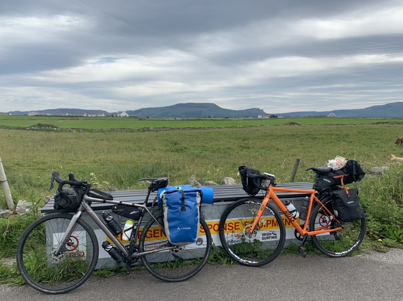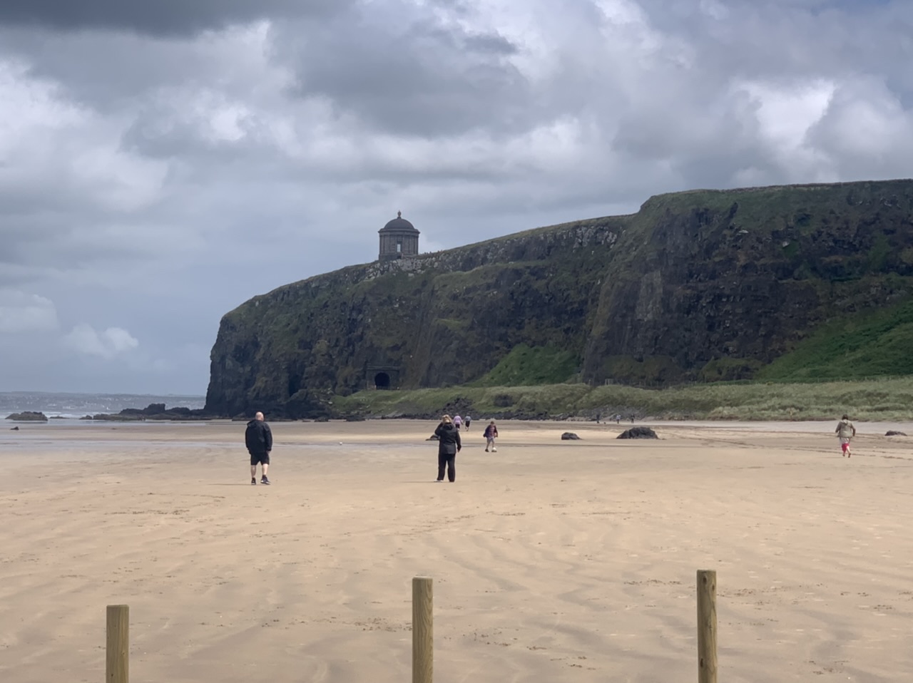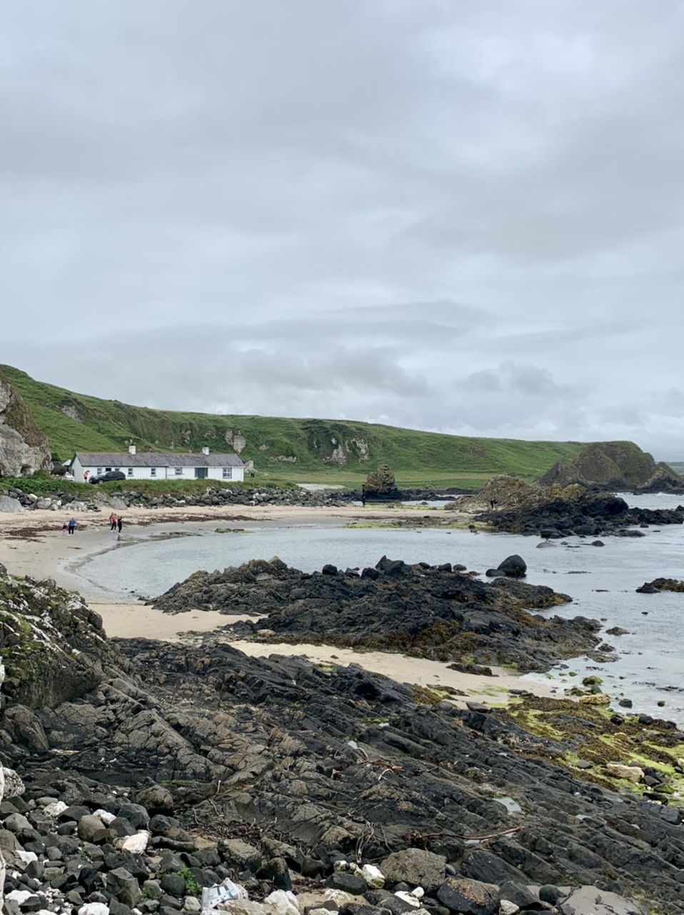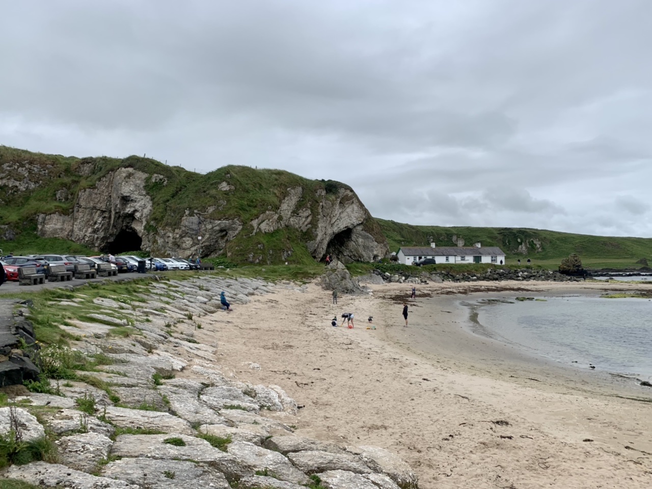 Am nächsten Morgen gehts nach einigen Plaudereien tiefer in die Berge. Endlich taucht die Sonne auf und es wird mal so richtig warm hier. Great. Wir schwitzen zwar aber beklagen uns garantiert nicht. Die Ausblicke in die Berge sind gigantisch schön, weite Wiesen, dann Wälder und obendrüber ein paar Felsen. Alles unbewohnt und frei. Und wieder nahezu kein Verkehr. Mir gefällt hier in den Bergen (unser Pass war nur 380 m hoch und kam uns vor wie in den Alpen). Es ist ein Traum. Wir fahren happy bergab, durch zwei kleine Dörfer, holen uns ein Eis und weiter geht es ordentlich bergauf bis wir irgendwann wieder am Kamm des Berges ankommen und auf der anderen Seite das blaue Meer mit der schottischen Insel Arran sehen. In Ayr finden wir keinen Campingplatz aber wir werden weitergeleitet bis Prestwick. Dort gibt es einen Caravanpark der auch Zelte aufnimmt, direkt an den Dünen. Wir kriegen vin der Mitarbeiterin Brot und ein einheimisches Getränk in der Dose geschenkt. Liane springt ins Meer und ich mache einen Spaziergang am Meer. Endlich mal Sommer hier, er kann gerne noch bleiben. Abends setzt sich der Pubbesitzer zu uns und gibt Tipps, wo wir hinfahren sollen. Er ist etwas überdreht, hat aber Witz und gibt uns einen Babyguinness aus. Das ist ein Bailey’s mit Tiamaria. 😅😋