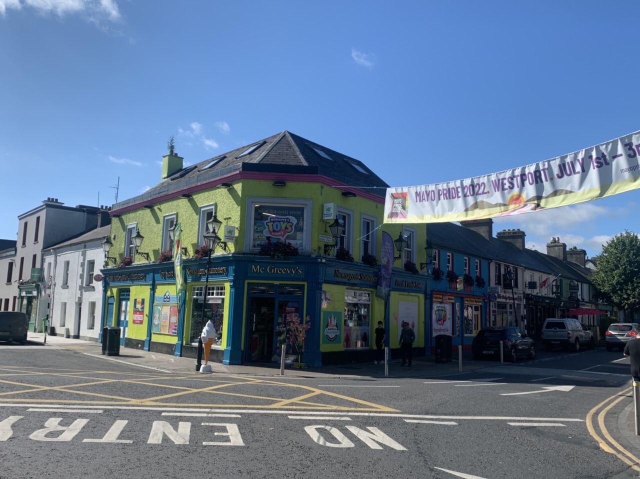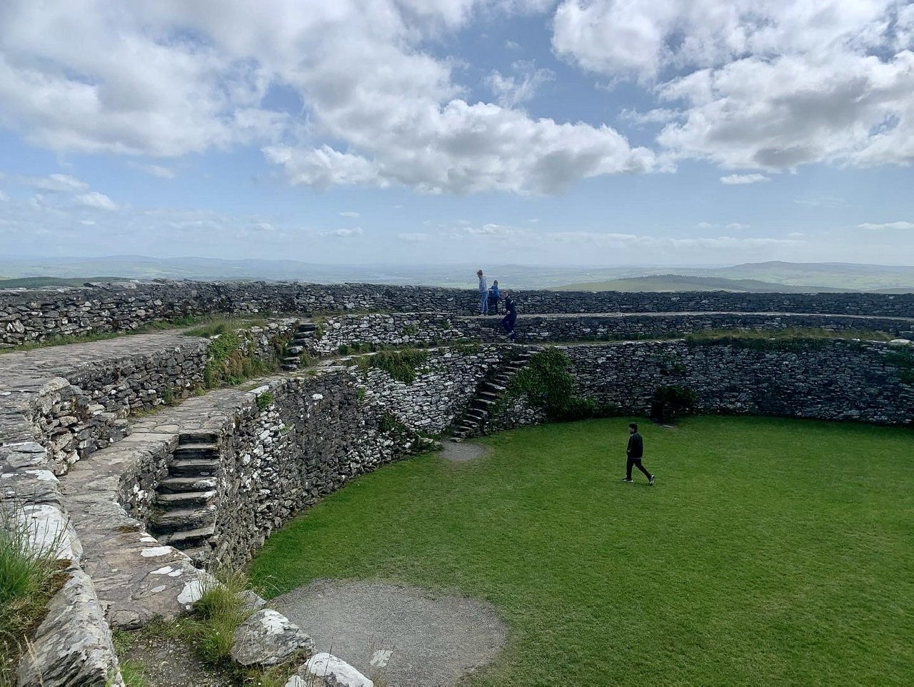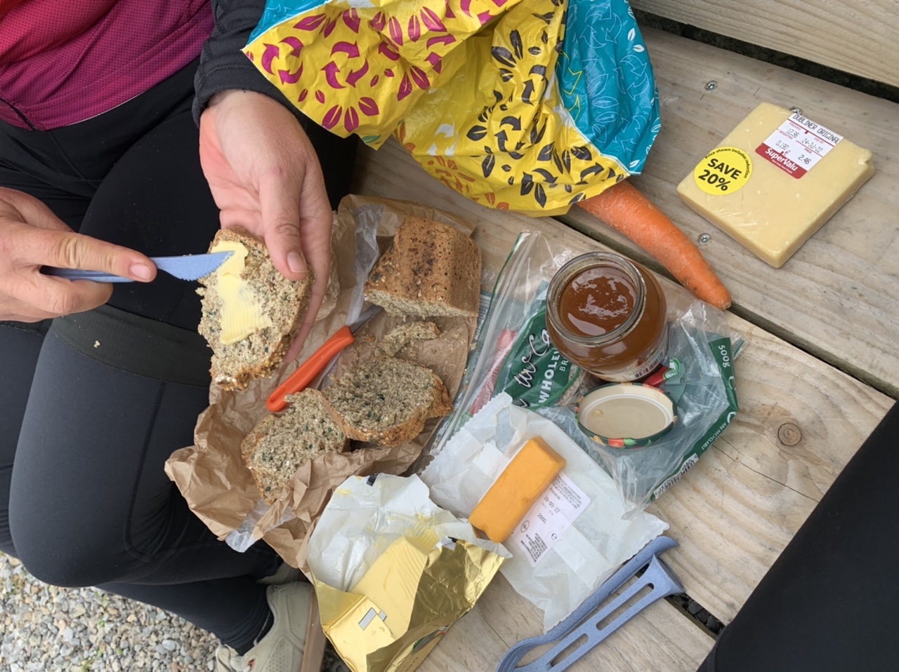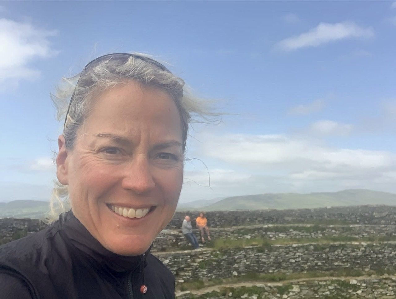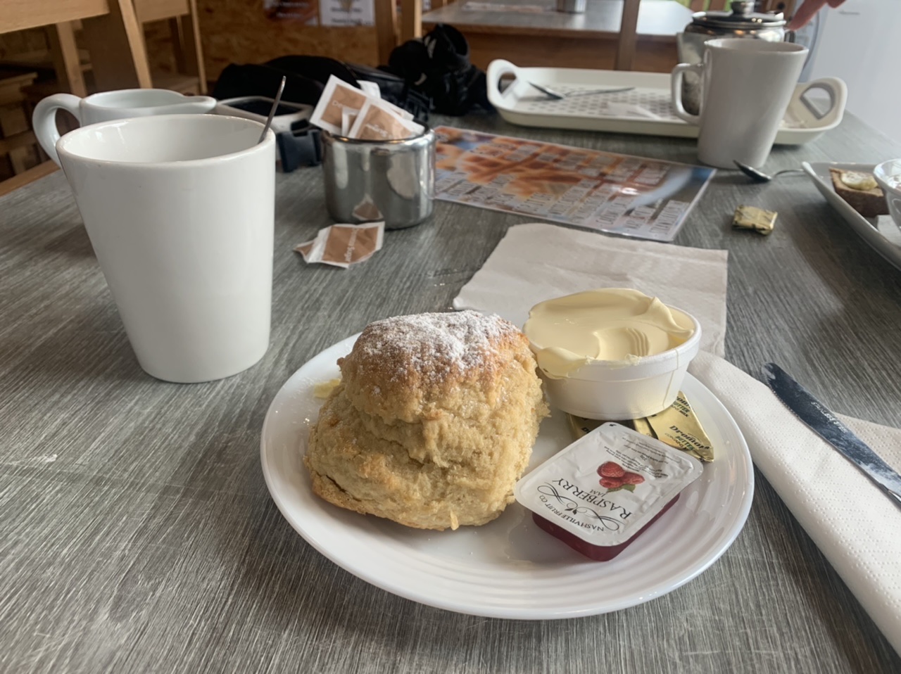 Am nächsten Morgen gehts nach einigen Plaudereien tiefer in die Berge. Endlich taucht die Sonne auf und es wird mal so richtig warm hier. Great. Wir schwitzen zwar aber beklagen uns garantiert nicht. Die Ausblicke in die Berge sind gigantisch schön, weite Wiesen, dann Wälder und obendrüber ein paar Felsen. Alles unbewohnt und frei. Und wieder nahezu kein Verkehr. Mir gefällt hier in den Bergen (unser Pass war nur 380 m hoch und kam uns vor wie in den Alpen). Es ist ein Traum. Wir fahren happy bergab, durch zwei kleine Dörfer, holen uns ein Eis und weiter geht es ordentlich bergauf bis wir irgendwann wieder am Kamm des Berges ankommen und auf der anderen Seite das blaue Meer mit der schottischen Insel Arran sehen. In Ayr finden wir keinen Campingplatz aber wir werden weitergeleitet bis Prestwick. Dort gibt es einen Caravanpark der auch Zelte aufnimmt, direkt an den Dünen. Wir kriegen vin der Mitarbeiterin Brot und ein einheimisches Getränk in der Dose geschenkt. Liane springt ins Meer und ich mache einen Spaziergang am Meer. Endlich mal Sommer hier, er kann gerne noch bleiben. Abends setzt sich der Pubbesitzer zu uns und gibt Tipps, wo wir hinfahren sollen. Er ist etwas überdreht, hat aber Witz und gibt uns einen Babyguinness aus. Das ist ein Bailey’s mit Tiamaria. 😅😋