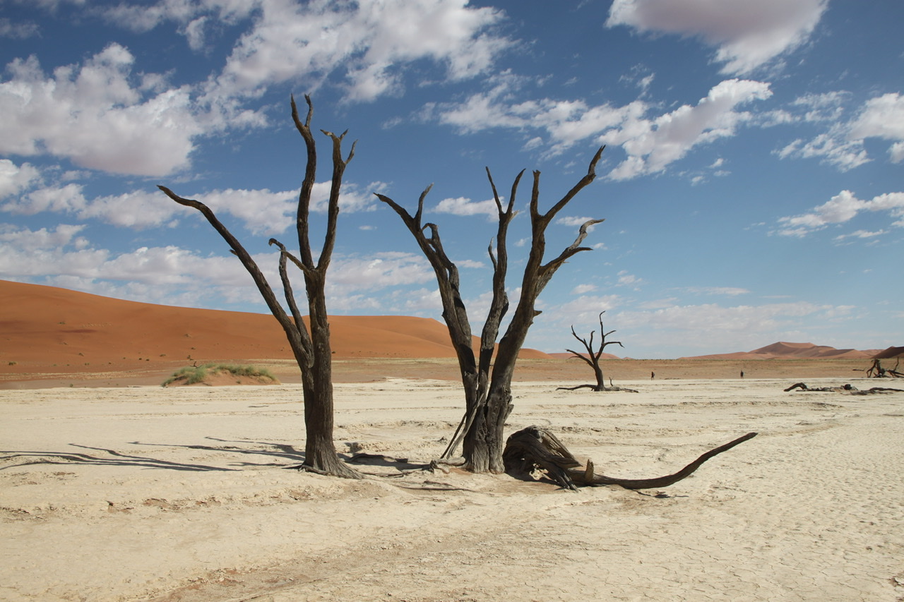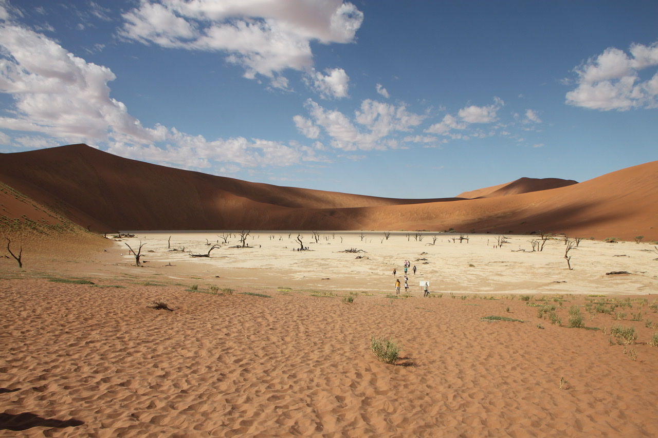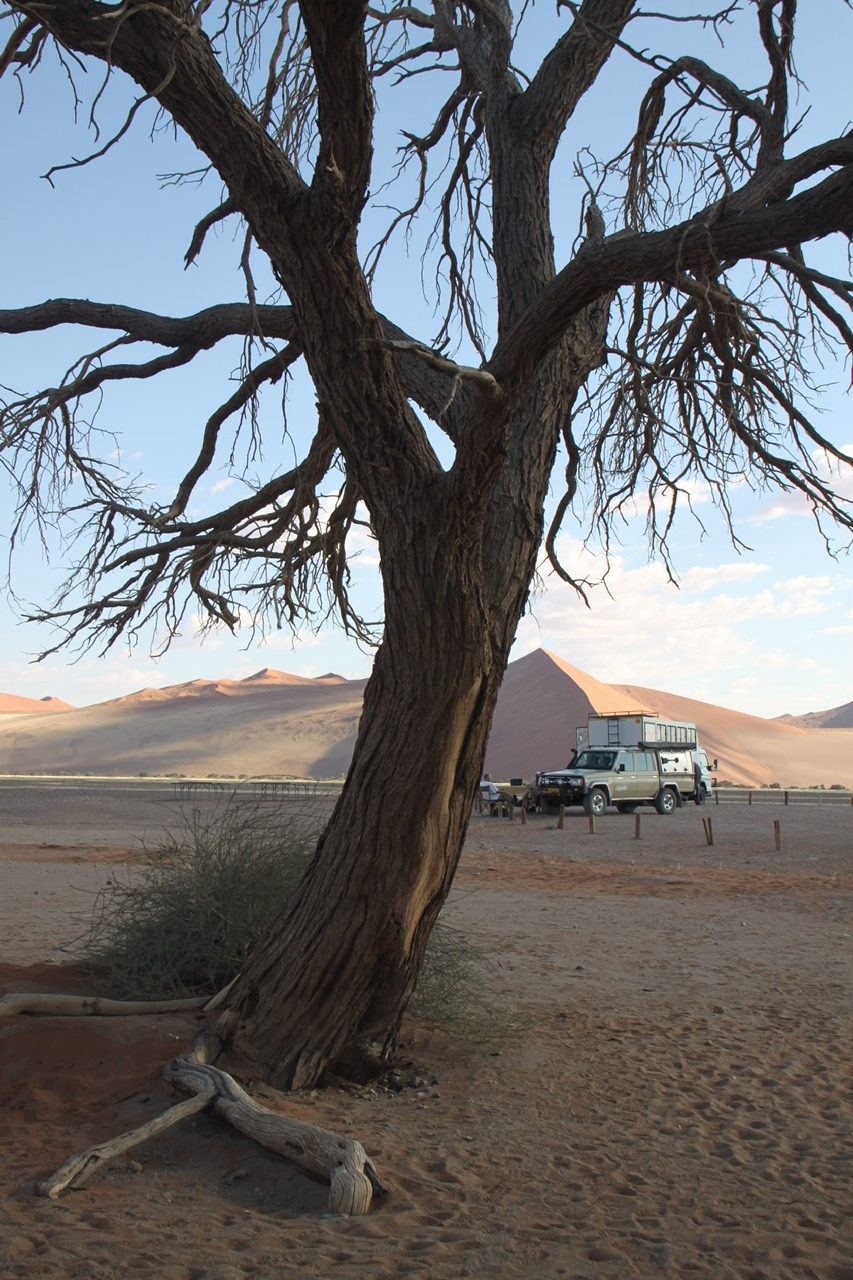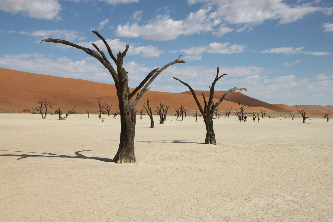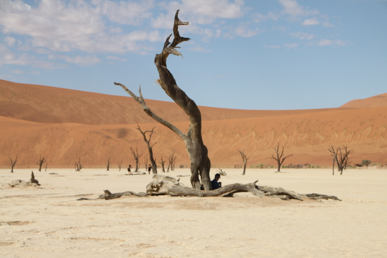Wenn man von Namibia hört, kommt immer wieder das schöne Wort Sossusvlei ins Spiel. Was kann ich mir darunter vorstellen? Sossusvlei liegt ca. 4 Fahrtstunden südlich von Winkhoek. Hier floss vor 2,5 Millionen Jahren ein Fluss (der Tsauchab River) von den großen Bergen im Landesinneren in westlicher Richtung ins Meer. Irgendwann breitete sich die Namib Wüste so weit aus, dass sie den Fluss zum Stop brachte. Das Wasser versickerte in einer Senke, einer sog. Salz-Ton-Pfanne mitten in den roten Dünen. Am Ende des Tals (Dead Vlei) stehen im hellen Sand uralte abgestorbene Kameldornbäume, die aufgrund des trockenen Klimas nur super langsam verrotten. Big Daddy, die größte Düne der Welt grenzt daran. Es sind sehr auffällige intensive Farben und eine wunderschöne, stimmungsvolle Kulisse.