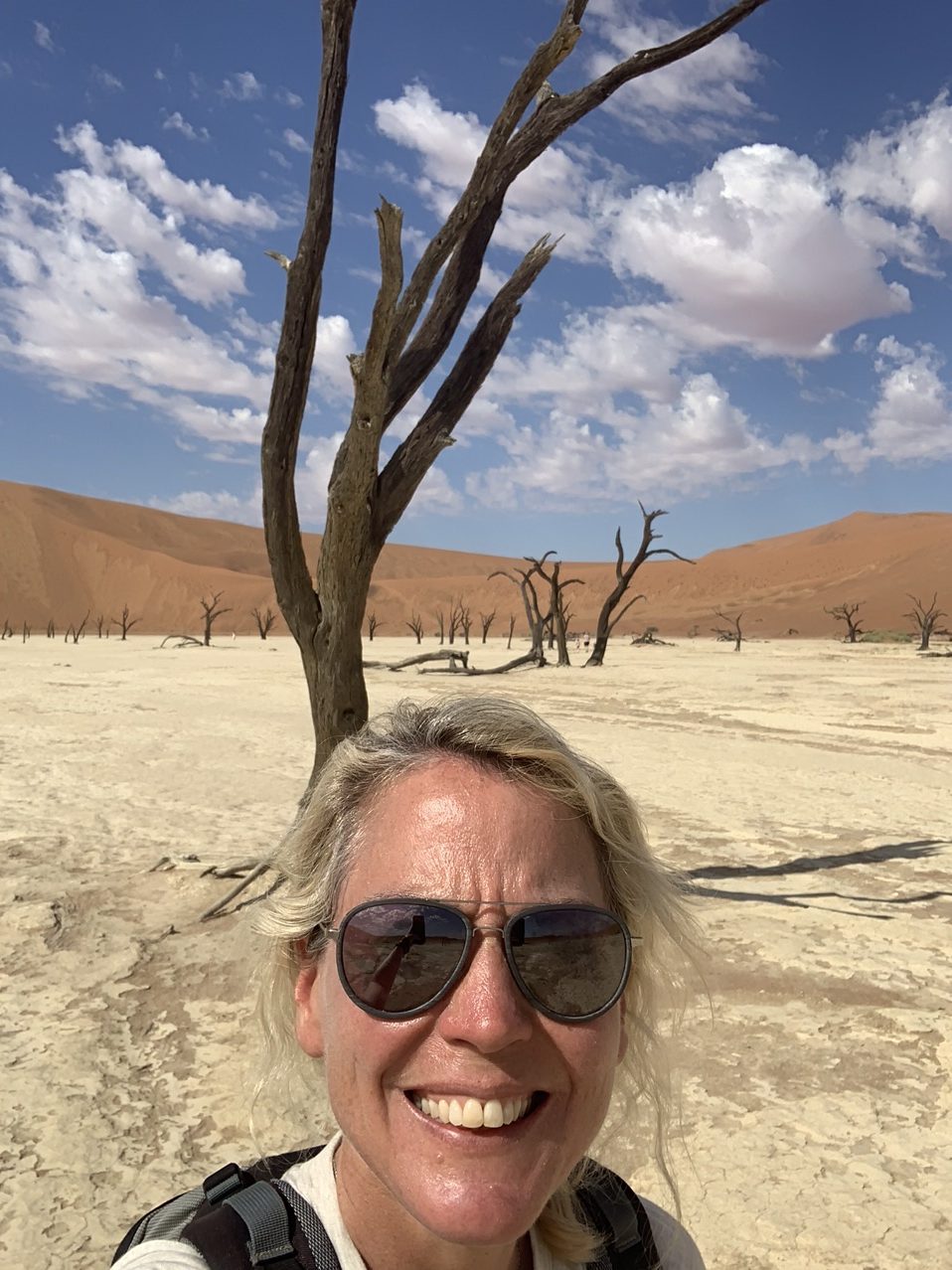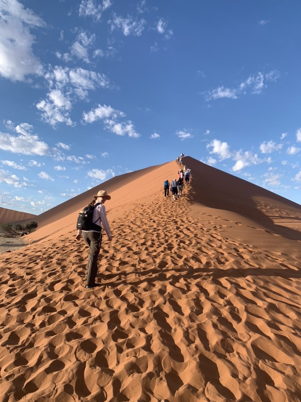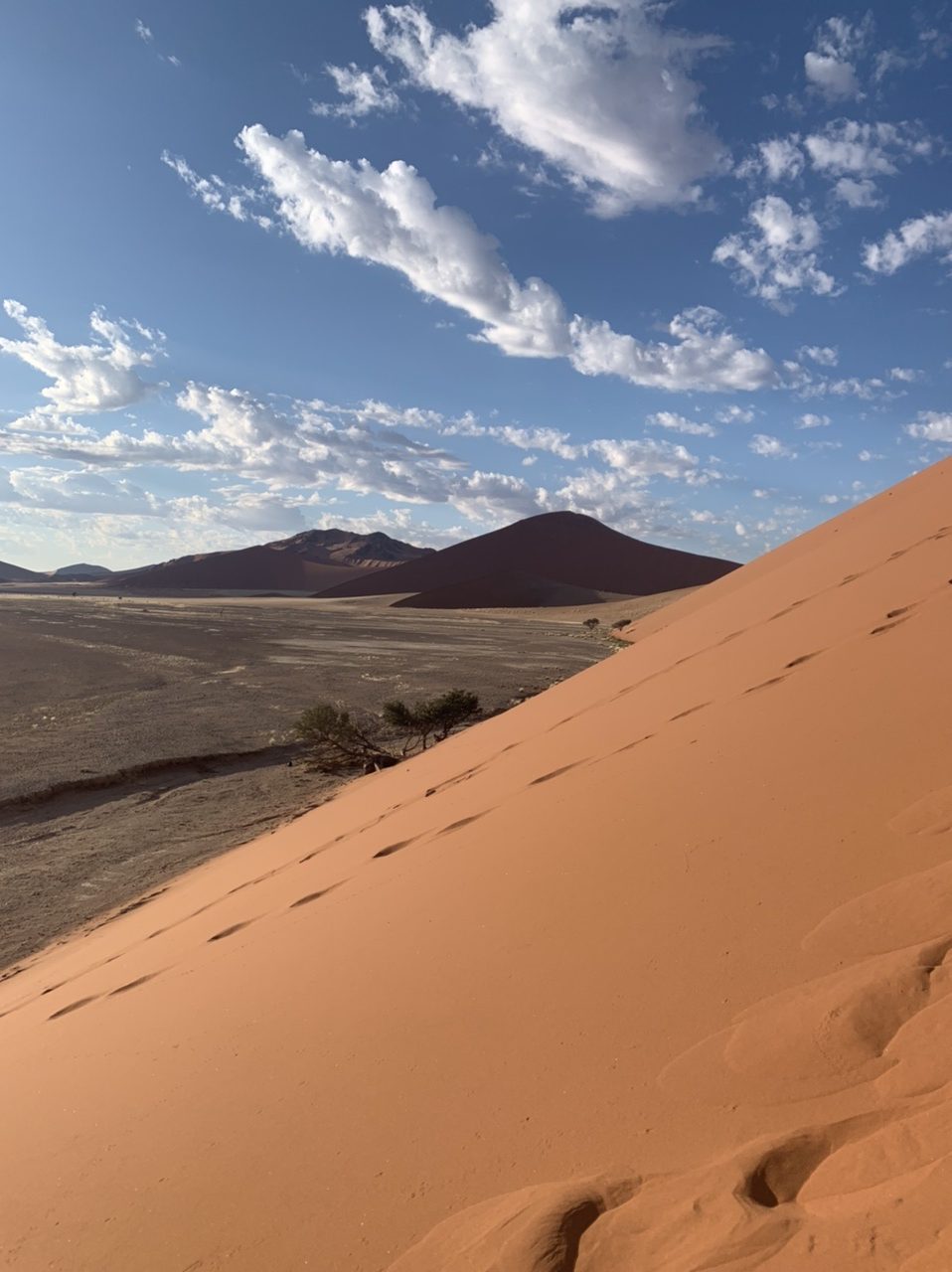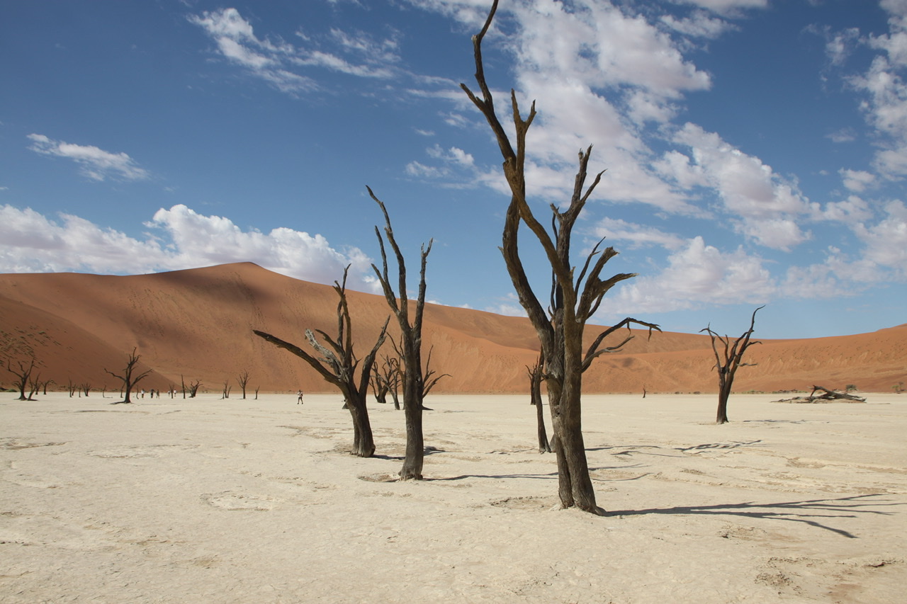 Wenn man von Namibia hört, kommt immer wieder das schöne Wort Sossusvlei ins Spiel. Was kann ich mir darunter vorstellen? Sossusvlei liegt ca. 4 Fahrtstunden südlich von Winkhoek. Hier floss vor 2,5 Millionen Jahren ein Fluss (der Tsauchab River) von den großen Bergen im Landesinneren in westlicher Richtung ins Meer. Irgendwann breitete sich die Namib Wüste so weit aus, dass sie den Fluss zum Stop brachte. Das Wasser versickerte in einer Senke, einer sog. Salz-Ton-Pfanne mitten in den roten Dünen. Am Ende des Tals (Dead Vlei) stehen im hellen Sand uralte abgestorbene Kameldornbäume, die aufgrund des trockenen Klimas nur super langsam verrotten. Big Daddy, die größte Düne der Welt grenzt daran. Es sind sehr auffällige intensive Farben und eine wunderschöne, stimmungsvolle Kulisse.