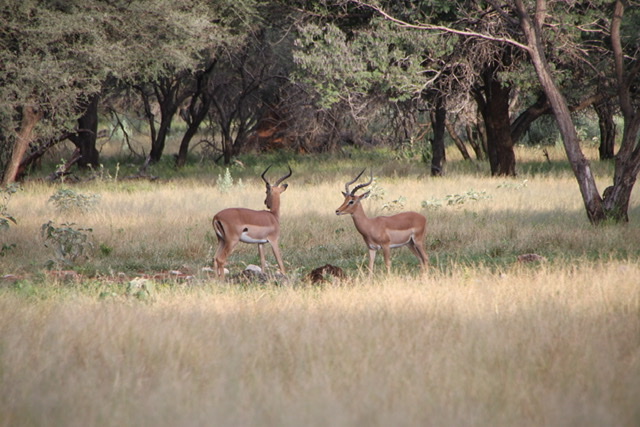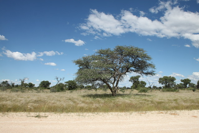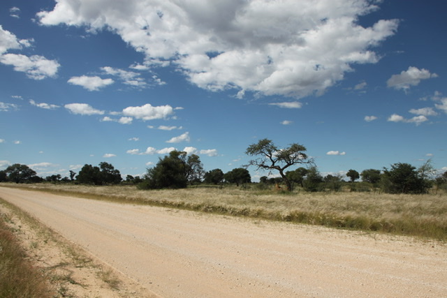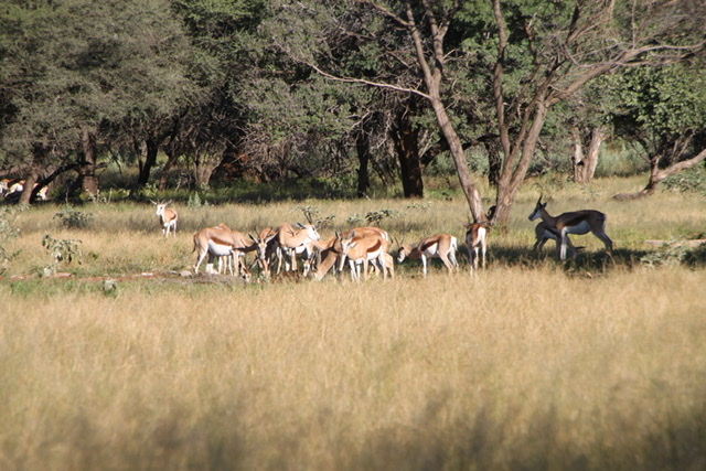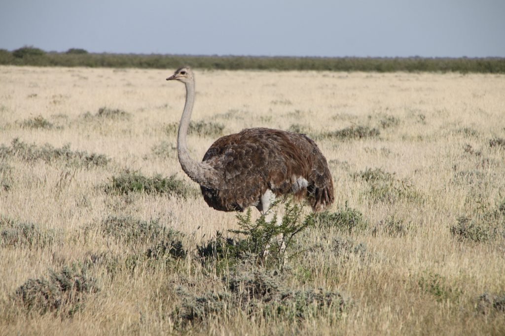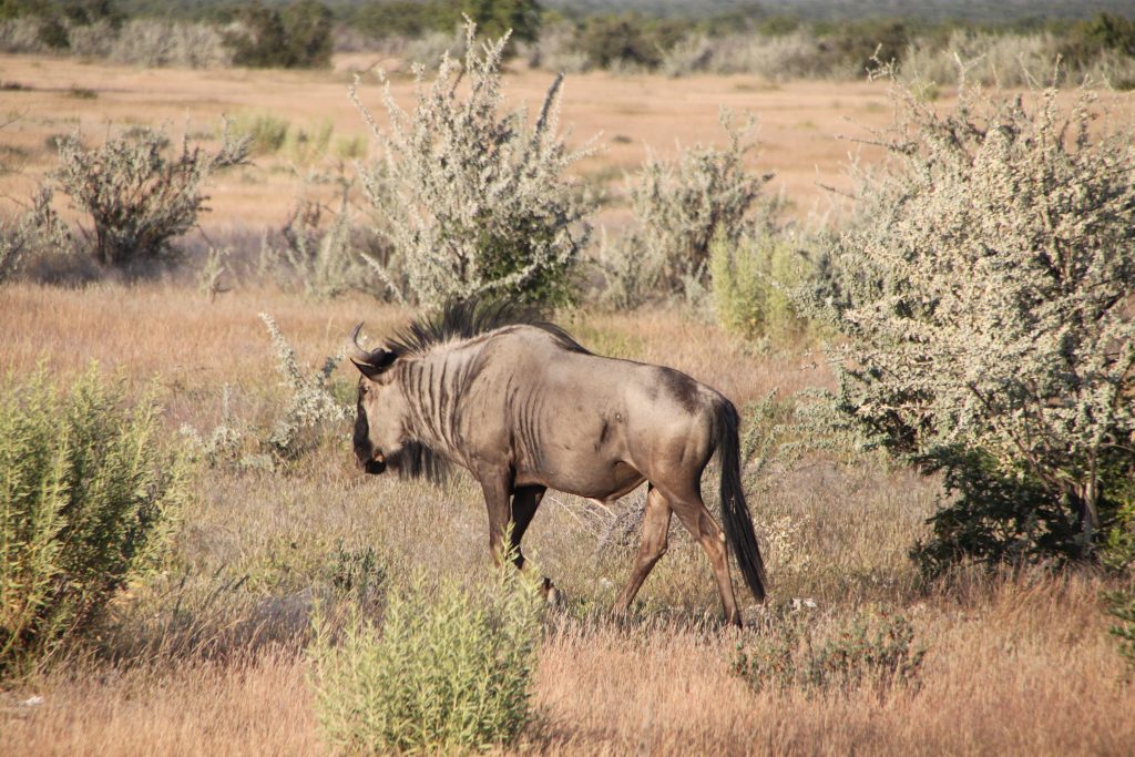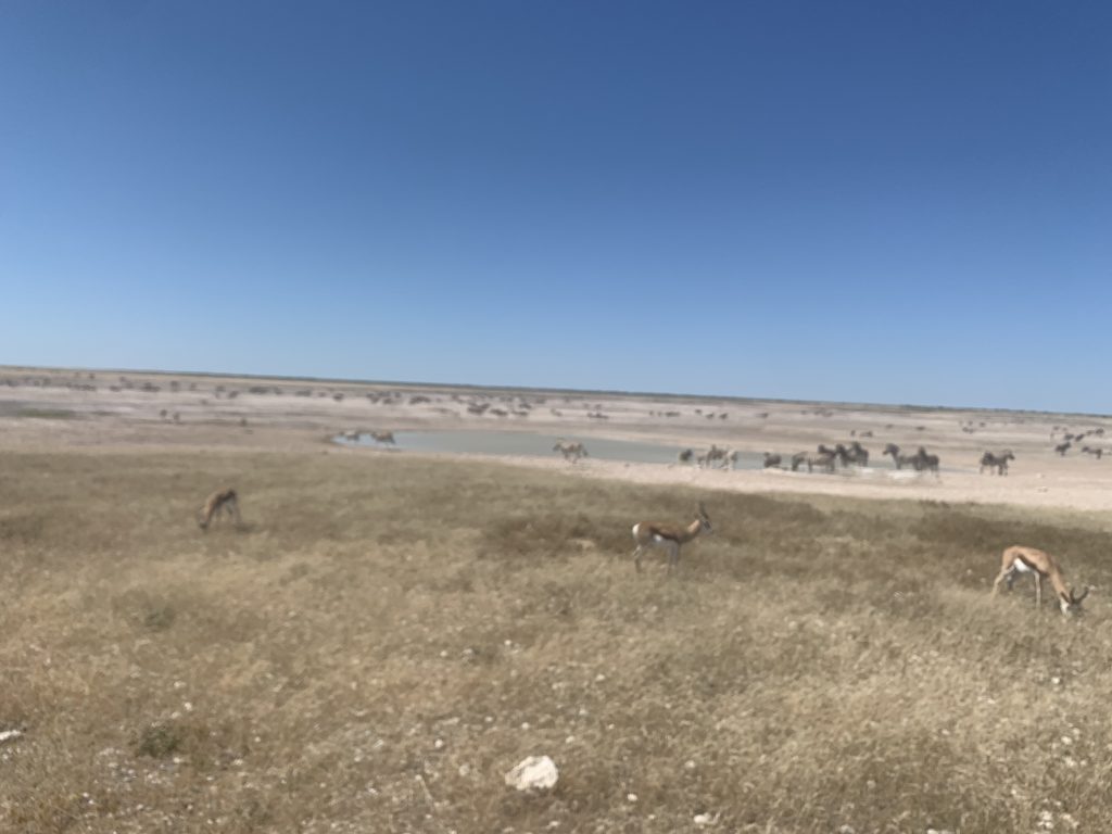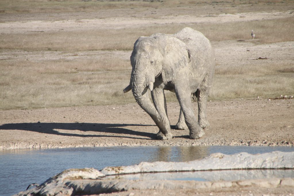 Wir sehen eine Oryxherde, zwei Kudus, eine Herde mit Impalas, einen Schlangenadler auf der Baumkrone, Straußenpaare, einen Raubadler, Springböcke, einen Sekretär (eine Greifvogelart), einen Marabou, Streifengnus, Impalas und Zebras an der Wasserstelle. Plötzlich läuft ein ein weißer Elefantenbulle langsam auf eine Wasserstelle zu. Er spielt im Wasser, trinkt und entfernt sich wieder. Sehr majestätisch. Die alten Bullen leben alleine, erklärt uns Klaus. In der Ferne sehen wir fünf Löwen im Gras dösen, sie sind mit der Kamera kaum einzufangen und auch mit dem Fernglas nur schwer zu entdecken.