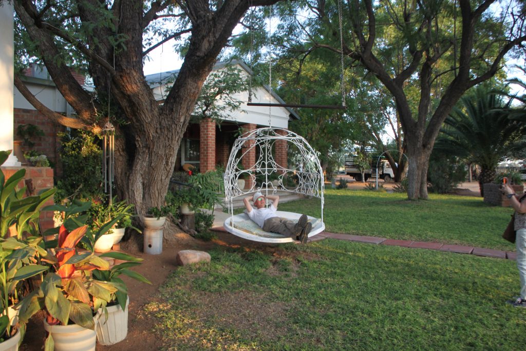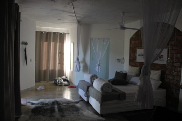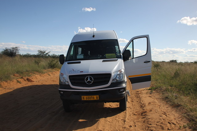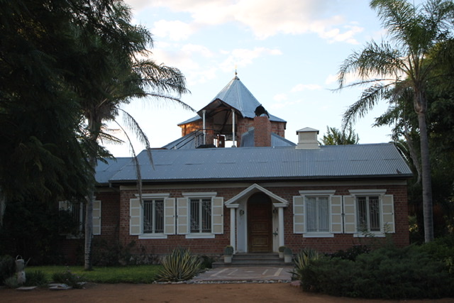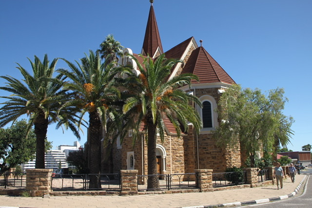 Nach 10 Stunden Flug erreichen wir Windhoek. Die Landebahn glitzert umsäumt von Palmen in der Sonne. Der Check-In dauert wegen dem erforderlichen Impfnachweis leider lang, einfach war früher… Endlich ist unser Gepäch durchleuchtet und ich sehe das gelbe Chamäleon Schild und werde von unserem Reiseleiter Klaus gefragt, ob ich Marion bin. Die Gruppe ist schon komplett versammelt. Jeder soll sich am Flughafen noch mit mind. 2.000 NAD Cash eindecken und schon steigen wir in unseren weißen Mercedes Kleinbus. Wir holen noch drei weitere Gäste ab, die bereits gestern gelandet sind und bekommen auf der Etango Ranch ein Frühstücks-Päckchen sowie Wasserflaschen. Insgesamt sind wir 11 Gäste + Reiseleiter Klaus, der in Namibia geboren ist und sich bestens auskennt. Unser Ziel ist die Ouhave Ranch, ca. 3 Fahrtstunden nord-östlich von Windhoek. Zunächst über breite asphaltierte Straßen kreuzen wir kurz nach Windhoek rein, besuchen dort die Christuskirche und fahren zu einem Holzmarkt, wo man hübsche Schnitzereien kaufen kann. Danach gehts aufs weite Feld an recht grünen Weideländern, Kameldornbäumen und Akazien vorbei. Den asphaltierten Weg verlassen wir nach der Hälfte der Strecke und fahren auf roten Sandpisten mit erstaunlich schnellem Tempo weiter. An einem Termitenhügel halten wir an und Klaus erklärt uns mit viel Geduld alles, was die Natur zu bieten. Er kennt sich richtig gut aus. Gegen vier Uhr erreichen wir unsere Ranch Ouhave Country Lodge. Die Besitzer empfangen uns freundlich, ein Pool unter Palmen glitzert verlockend im Garten. Die Bungalows sind neu, großzügig und mit einer Veranda mit Blick über die weiten Savannen- und Buschlandschaften. Sehr schöne Möbel und Design, vor dem Bett liegt ein Kuhfell. Ich springe zur Abkühlung in den Pool, dann treffen wir uns zum Sundowner und Abendessen in der Lodge. Hier glimmt ein Feuerchen, ein großer gedeckter Holztisch wartet auf uns, es duftet herrlich. Wir dürfen uns aus einem großen Kühlschrank bedienen und es wird Onyxfilet gegrillt. Bianca und Horst, die Ranchbesitzer essen mit uns. Das Essen ist sehr lecker, als Beilagen gibt es selbstangebautes Gemüse, Zwiebelsalat, gemischten Salat und Kartoffeln. Zum Nachtisch einen Zitronenkuchen. Schnell entsteht eine entspannte Offenheit zwischen uns und muntere Gespräche entwickeln sich.