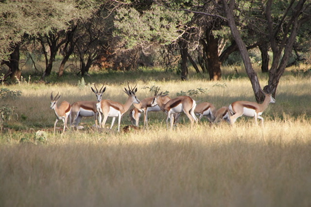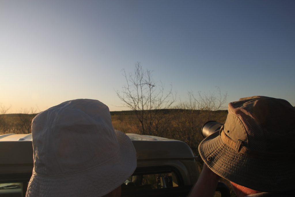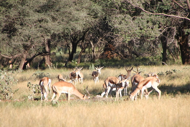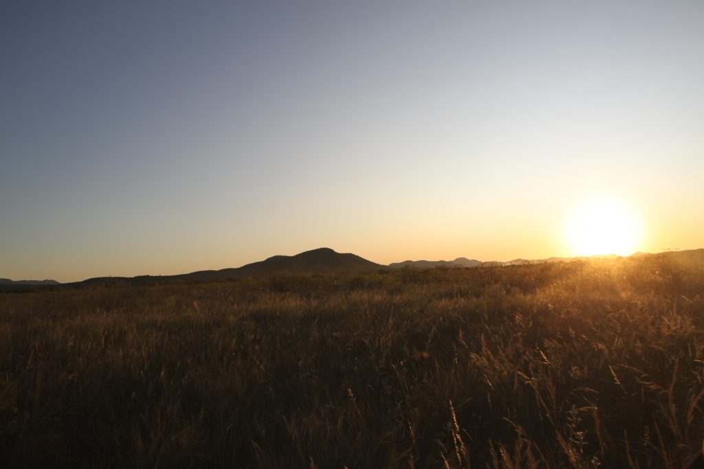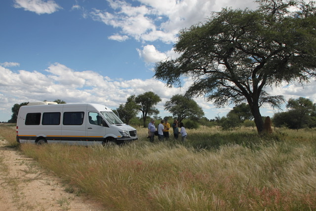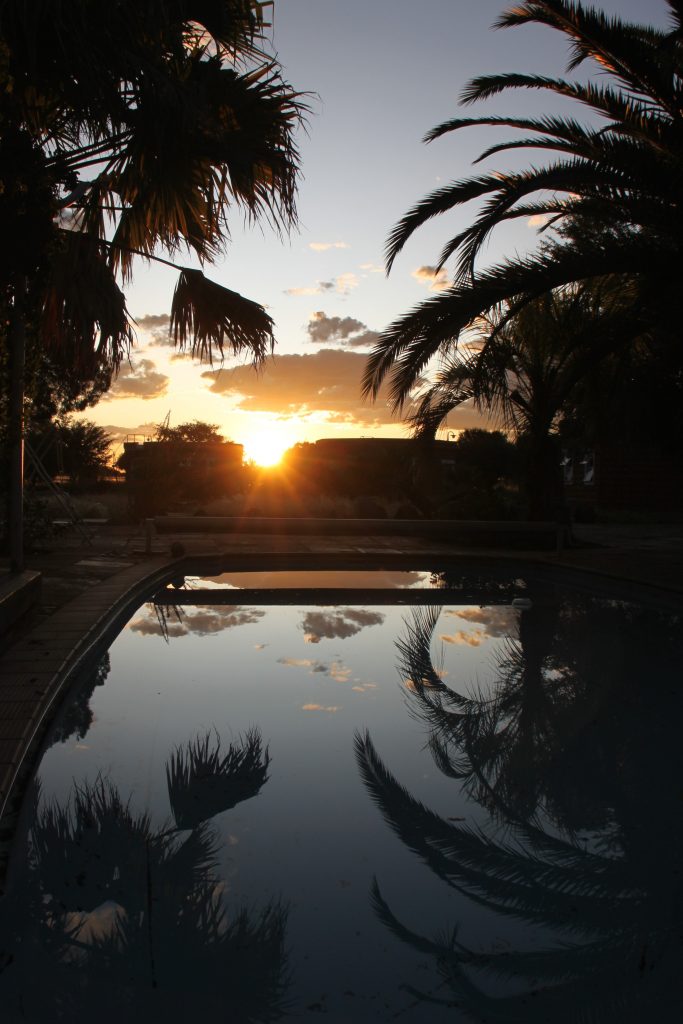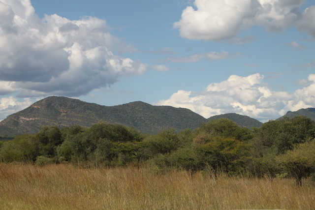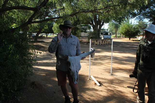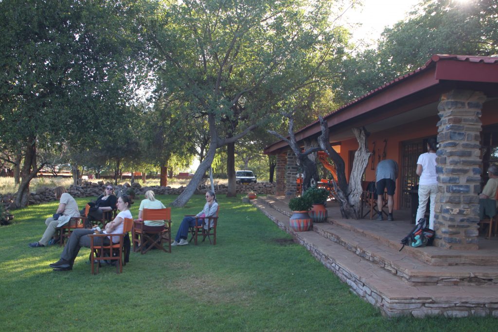 Wir fahren weiter nördlich am Waterberg Hochplateu vorbei über Otjiwarongo in die Otaviberge zur Ohange Lodge. Dort erwarten und Carla und Justus Brits in einem schönen Resort mit Wasserstelle, wo man abends Gazellen, Impalas und Springböcke grasen sehen kann. Wir haben kleine reetgedeckte Hütten und einen sonnigen Pool. Zum Abendessen unter freiem Himmel bekommen wir das Menu zunächst in der Landessprache erklärt, was ein wenig wie finnisch klingt. Es gibt Boeff Stroganoff mit Lechwe (eine Antilopenart) mit Wildreis. Am nächsten Morgen treffen wir uns bereits um 6:45 zur Morgensafari per Pedes. Unser Guide Bony erklärt uns die einheimischen Pflanzen (u.a. einen Brandybaum mit kleinen orangefarbenen Beeren, den Ahnenbaum). Nach einer Weile springen in der Ferne 2 Zebras über unseren Weg. Ihr Getrappel hört sich an wie der Hufschlag von Pferden. Über die Bäume haben wir von der Höhe eine schöne Fernsicht auf die nahen Otaviberge und über die grüne Ebene. Die Bäume färben sich allmählich gelb, aber dieses Jahr gab es ausreichend Regen, so dass das Gras noch ziemlich hoch steht. Dies erschwert wiederum Tiere zu entdecken. Nach 7 Kilometern erreichen wir wieder unsere Ranch. Abends machen wir eine Jeepsafari und sehen viele Vögelarten von Hühnern bis Raubvögel, die ziemlich relaxt auf uns drauf blicken. Eine Baumschlange hängt nach ihrer augenscheinlichen Jagd mit dicken Bauch träge in einem Baum und rührt sich ebenfalls nicht, als sich 11 Kameras auf sie richten. Unser Guide sagt, sie wäre sehr giftig und zu 98 % tödlich. Traditionell machen wir einen Sundowner am höchsten Punkt mit einem Drink der Wahl. Die Sonne geht gerade unter und es herrscht ausgelassene Stimmung nach der schaukelnden Tour über die steinigen Pfade. Bony ist begeisterter Fahrer und erzählt stolz, dass er den Toyota super gerne fährt und sein Wagen einen sehr starken Motor hat, der Anhöhen und Unebenheiten ohne Probleme bewältigt. Zum heutigen Abendessen bekommen wir Oryxschnitzel mit süßem Kürbisgemüse und gelben Süßkartoffeln. Zum Nachtisch: Brandykuchen: sehr saftig und noch ein bisschen warm. Alles sehr lecker. Unser Gastgeber Justus erklärt uns, dass man nach jedem Namibia-Besuch mit 9 Kilo plus abreist. Sehr glaubhaft.