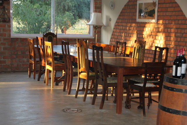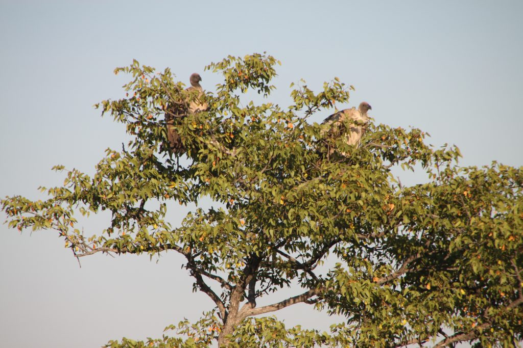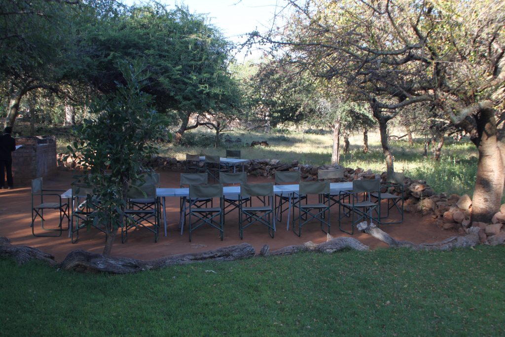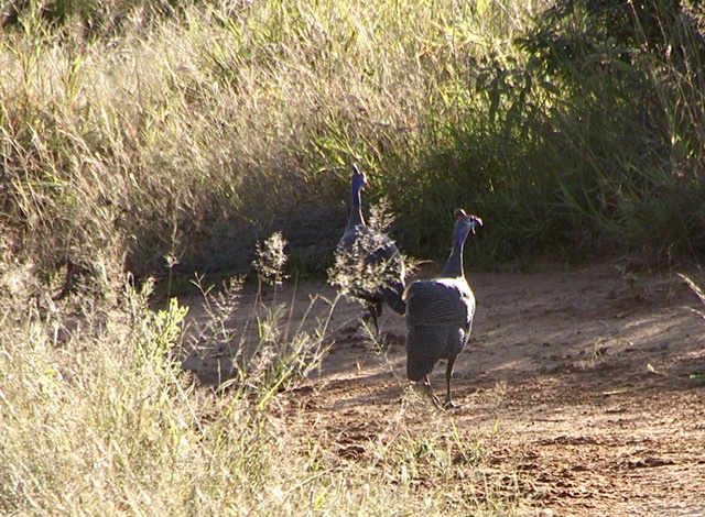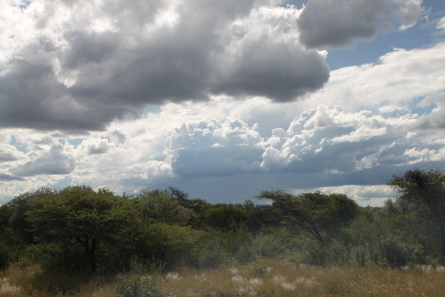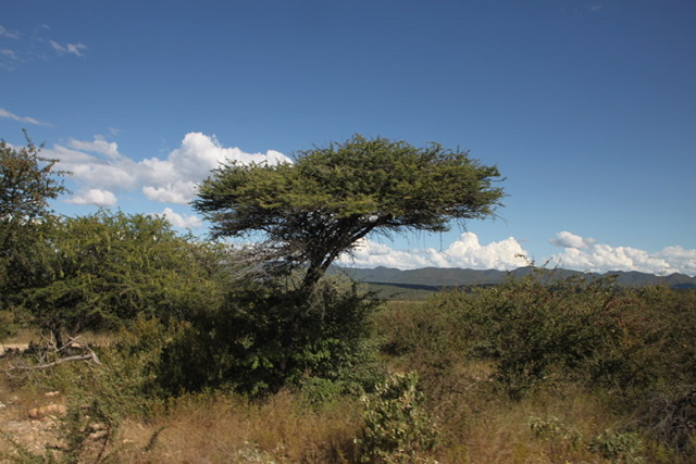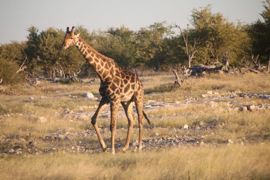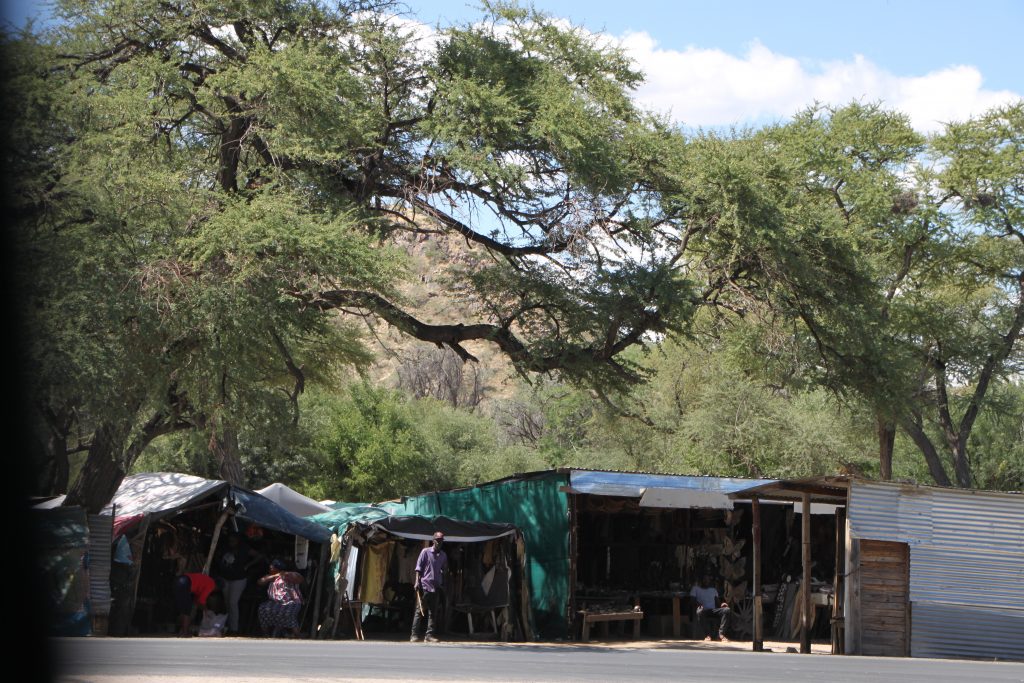 Wir fahren weiter nördlich am Waterberg Hochplateu vorbei über Otjiwarongo in die Otaviberge zur Ohange Lodge. Dort erwarten und Carla und Justus Brits in einem schönen Resort mit Wasserstelle, wo man abends Gazellen, Impalas und Springböcke grasen sehen kann. Wir haben kleine reetgedeckte Hütten und einen sonnigen Pool. Zum Abendessen unter freiem Himmel bekommen wir das Menu zunächst in der Landessprache erklärt, was ein wenig wie finnisch klingt. Es gibt Boeff Stroganoff mit Lechwe (eine Antilopenart) mit Wildreis. Am nächsten Morgen treffen wir uns bereits um 6:45 zur Morgensafari per Pedes. Unser Guide Bony erklärt uns die einheimischen Pflanzen (u.a. einen Brandybaum mit kleinen orangefarbenen Beeren, den Ahnenbaum). Nach einer Weile springen in der Ferne 2 Zebras über unseren Weg. Ihr Getrappel hört sich an wie der Hufschlag von Pferden. Über die Bäume haben wir von der Höhe eine schöne Fernsicht auf die nahen Otaviberge und über die grüne Ebene. Die Bäume färben sich allmählich gelb, aber dieses Jahr gab es ausreichend Regen, so dass das Gras noch ziemlich hoch steht. Dies erschwert wiederum Tiere zu entdecken. Nach 7 Kilometern erreichen wir wieder unsere Ranch. Abends machen wir eine Jeepsafari und sehen viele Vögelarten von Hühnern bis Raubvögel, die ziemlich relaxt auf uns drauf blicken. Eine Baumschlange hängt nach ihrer augenscheinlichen Jagd mit dicken Bauch träge in einem Baum und rührt sich ebenfalls nicht, als sich 11 Kameras auf sie richten. Unser Guide sagt, sie wäre sehr giftig und zu 98 % tödlich. Traditionell machen wir einen Sundowner am höchsten Punkt mit einem Drink der Wahl. Die Sonne geht gerade unter und es herrscht ausgelassene Stimmung nach der schaukelnden Tour über die steinigen Pfade. Bony ist begeisterter Fahrer und erzählt stolz, dass er den Toyota super gerne fährt und sein Wagen einen sehr starken Motor hat, der Anhöhen und Unebenheiten ohne Probleme bewältigt. Zum heutigen Abendessen bekommen wir Oryxschnitzel mit süßem Kürbisgemüse und gelben Süßkartoffeln. Zum Nachtisch: Brandykuchen: sehr saftig und noch ein bisschen warm. Alles sehr lecker. Unser Gastgeber Justus erklärt uns, dass man nach jedem Namibia-Besuch mit 9 Kilo plus abreist. Sehr glaubhaft.