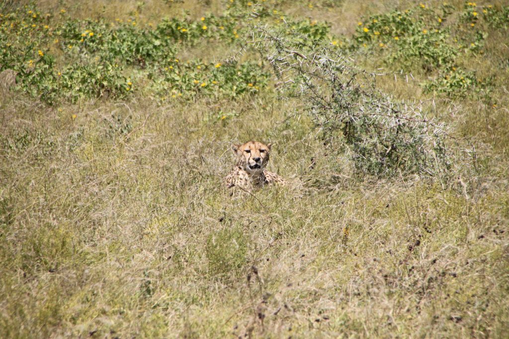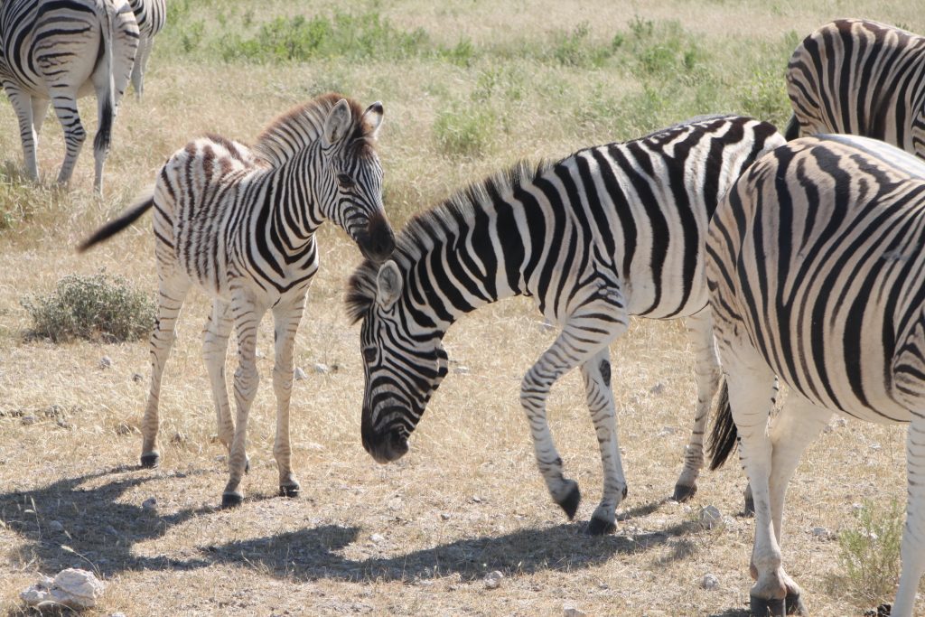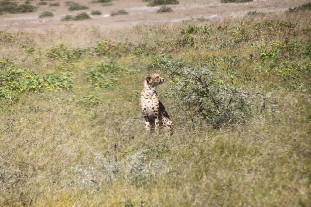 Zebras mit einem Streifengnu in der Mitte (diese Kombi sieht man öfter) folgen, ein gelb-beiger Schakel läuft durch den Sand. An der Etoshapfanne, ein ehemaliger Salzsee sehe ich das erste mal eine Gabelschwanzrake (ein kleiner, sehr schöner lila-türkis-schimmernder Vogel) und eine Wasserschildkröte kriecht von der Straße ins Gebüsch. Wir fahren zum Onkoni Camp und weiter nach Stinkwater. An der Andoni Wasserstelle grasen Zebras, ein Gnu sowie Kiebitze mit langen roten Beinen baden im Wasser. Dann erspähen wir Steinböckchen und Kronengucker. Am nächsten Wasserloch schlafen zwei Nilgänse und diverse Wasserschildkröten dösen in der Sonne. In der Steppe grast ein Streifengnu. Wir fahren weiter und werden von einem Geparden, der im Gras sitzt, überrascht. Er wird müde, gähnt und streckt sich hin. Die Autos scheinen ihn nicht zu stören, er kennt das Schauspiel. Mir tut es ein wenig leid, dass wir in seinen Lebensraum eindringen. Noch deutlicher spüre ich das, als wir auf die in der Nähe ruhende Gepardenmutter mit zwei Jungen unter einem schattigen Busch aufmerksam gemacht werden. Die Besucher geben die Informationen, wo welche Tiere gerade sind, weiter wenn die Autos sich kreuzen. In Folge stehen dann alle Autos und Busse direkt vor den Tieren.