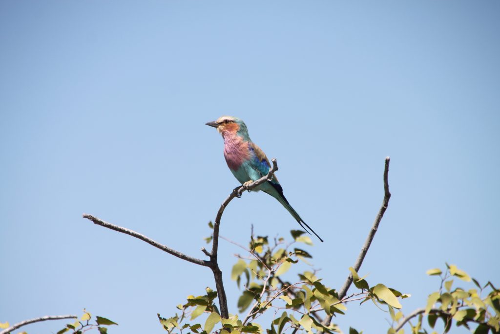 Auf dem Weg zum Ausgang des Parks kommen wir an einem Siedelwebervogelnest, das in einem Baum hängt, vorbei. Eine Giraffe stolziert auf das Wasserloch am südlichen Ausgang des Anderson Gates zu. Wir sind glücklich nach diesen vielen tierischen Begegnungen. Es ist mega, diese Tiere life und in ihrer natürlichen Umgebung sehen zu dürfen.