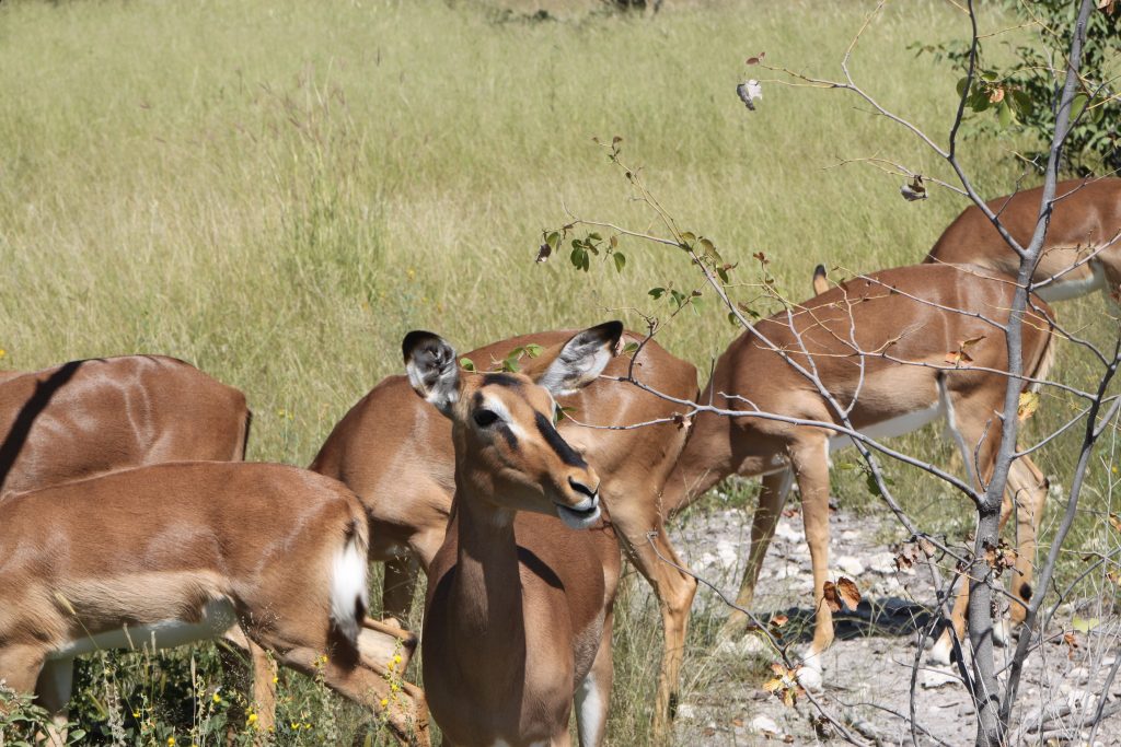 Am späten Vormittag fahren wir am östlichen Von-Lindequist-Gate herein. Zu meiner Überraschung ist die Vegetation aufgrund der späten und in diesen Jahr intensiven Regenzeit sehr grün. Wir sind alle etwas aufgeregt, was wir entdecken werden und die Kamera sind in Position. Klaus bleibt ganz cool hinter seinen Steuer und fährt den Bus entspannt über die Schotterpisten. Begrüßt werden wir von einem kleinen Dikdik, das auf der Straße steht und uns neugierig mit großen Augen anschaut.