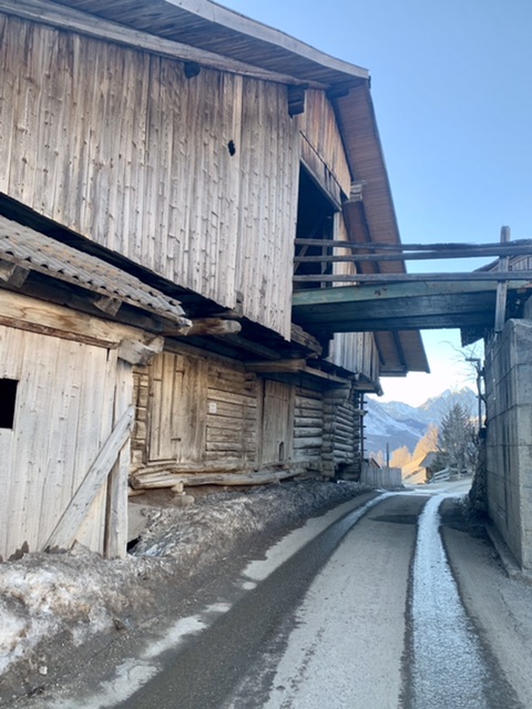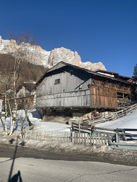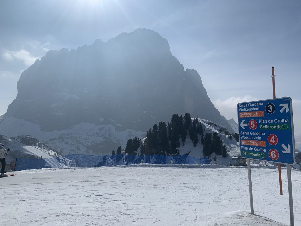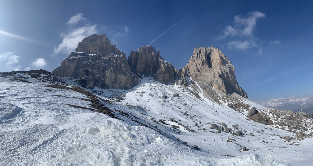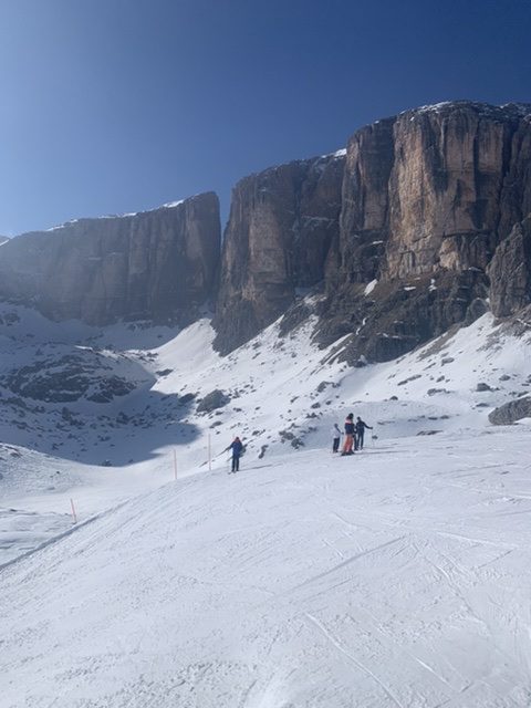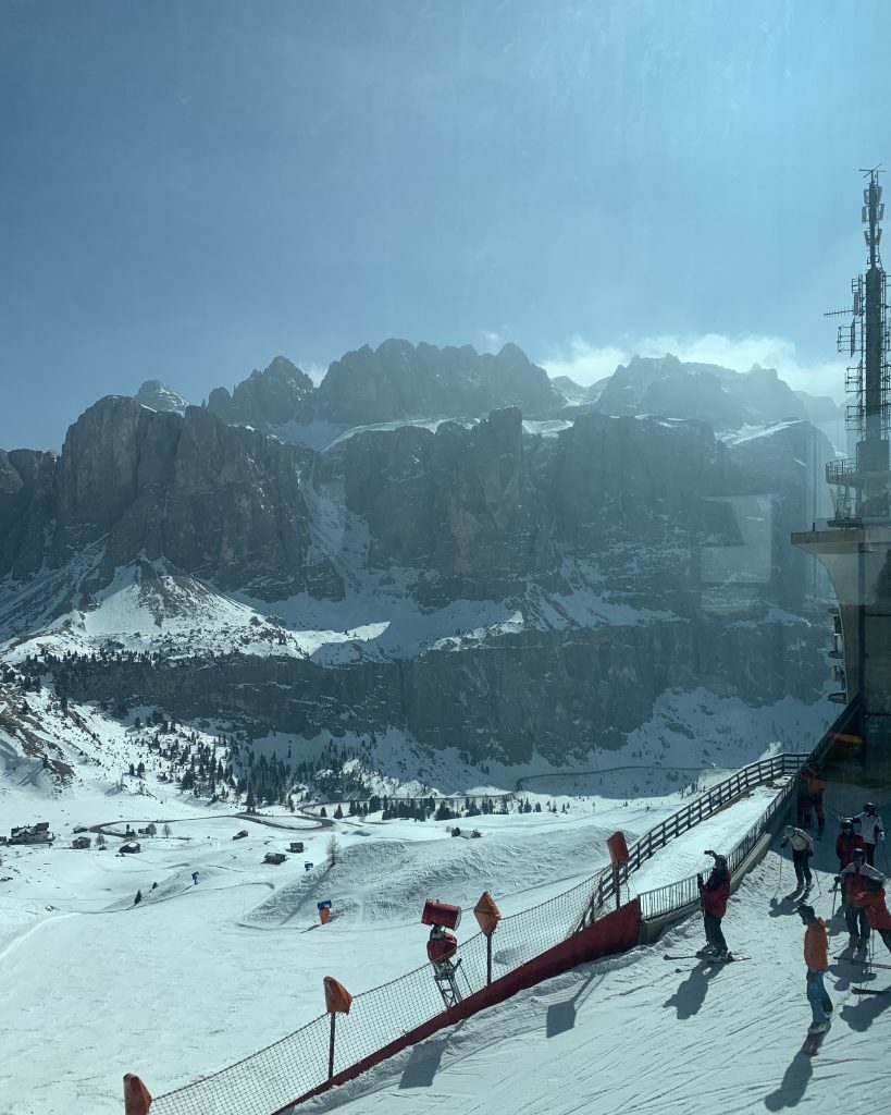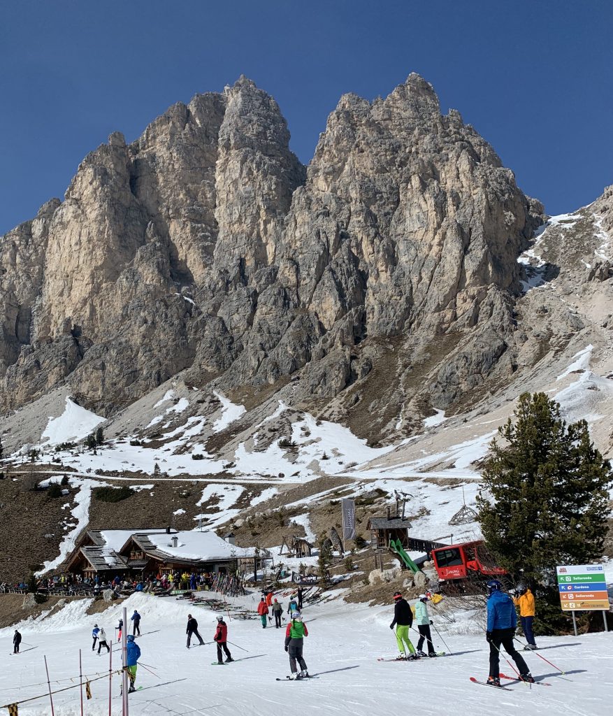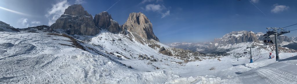 Auf keinen Fall auslassen solle man die Skitour zum berühmten Lagazuio, der südlich von San Cassiano in Richtung Cortina D´Ampezzo liegt. Hierfür muss man überraschenderweise allerdings ein privates Skitaxi nehmen um über den Passo Valperola zur Talstation des Lagazuoi zu gelangen. Der Lagazuio ist 2.778m hoch und man hat auch von hier die perfekte Fernsicht über alle Dolomitengipfel. Die 600 Höhenmeter lange Abfahrt zur Talstation ist ein Genuss, wir fahren noch einmal mit der Gondel hoch und fahren dann von oben in die andere Richtung zwischen den schneebedeckten Steinriesen die Skiroute zurück nach San Cassiano. Diese Tour ist insg. 7,5 km lang und es ist mega schön hier Skifahren zu dürfen. Ich kann mich gar nicht aufs Skifahren konzentrieren, sondern schaue mir nur diese herrlichen Berge links und rechts. Rechts von uns liegt das berühmte Fanes-Tal. Es ist so schön, dass man am liebsten entweder hierbleiben würde oder die Tour immer und immer wieder wiederholen könnte, was der Tischnachbar von uns tatsächlich auch schon einmal gemacht hat. An einem Tag ist er die Tour 7 x gefahren, ich kann es sehr gut verstehen. Die Pause machen wir in der gut besuchten urigen Berghütte Ütia de Scotoni. Auf der Terrasse herrscht fröhliche Mittagspausenstimmung, zum Glück finden wir schnell einen Platz. Heute gibt es Pulled Pork Burger. Weiter geht es an schroffen Bergfelsen vorbei, leider sehen wir aufgrund des Tauwetters der letzten Tage die Eisfälle nicht mehr. Am Ende der Piste nach einer langen Schussfahrt und ein wenig mühsamen Schieben warten die Pferdeschlitten auf die Skifahrer und bringen uns zurück zum Skilift Armentarola. Wir hängen uns an lange Seile und werden von den starken Arbeiterpferden durch den teils schon sehr matschigen Schnee gezogen.