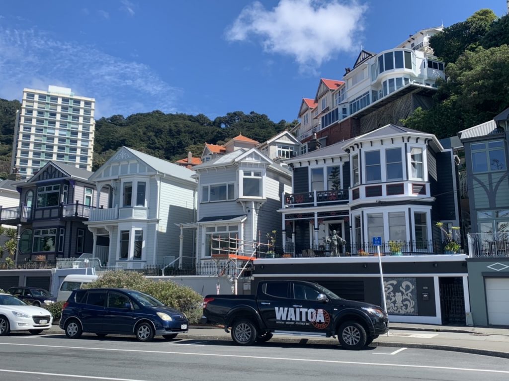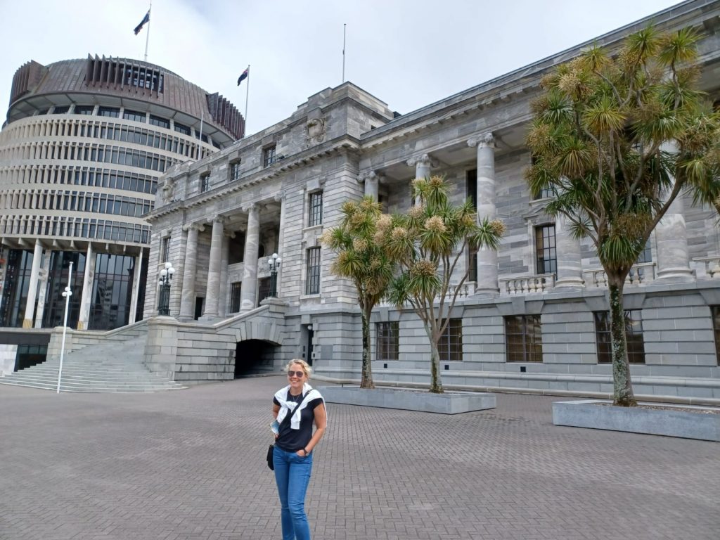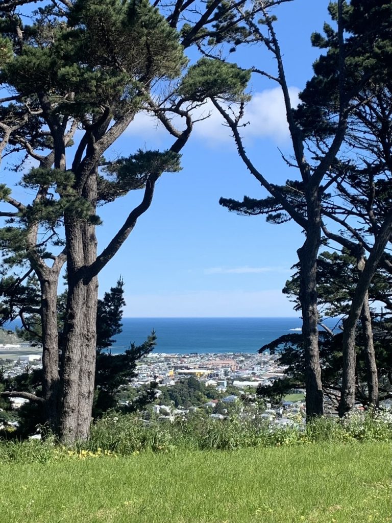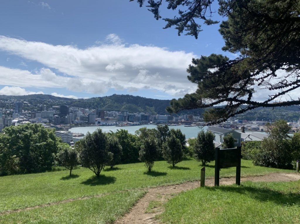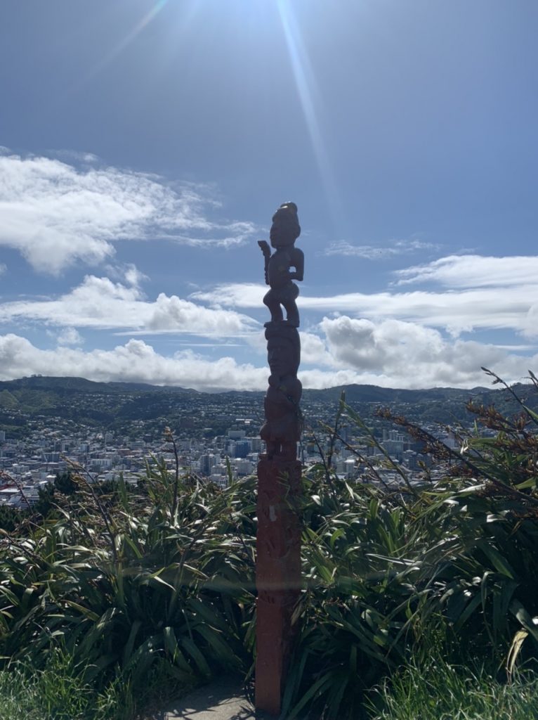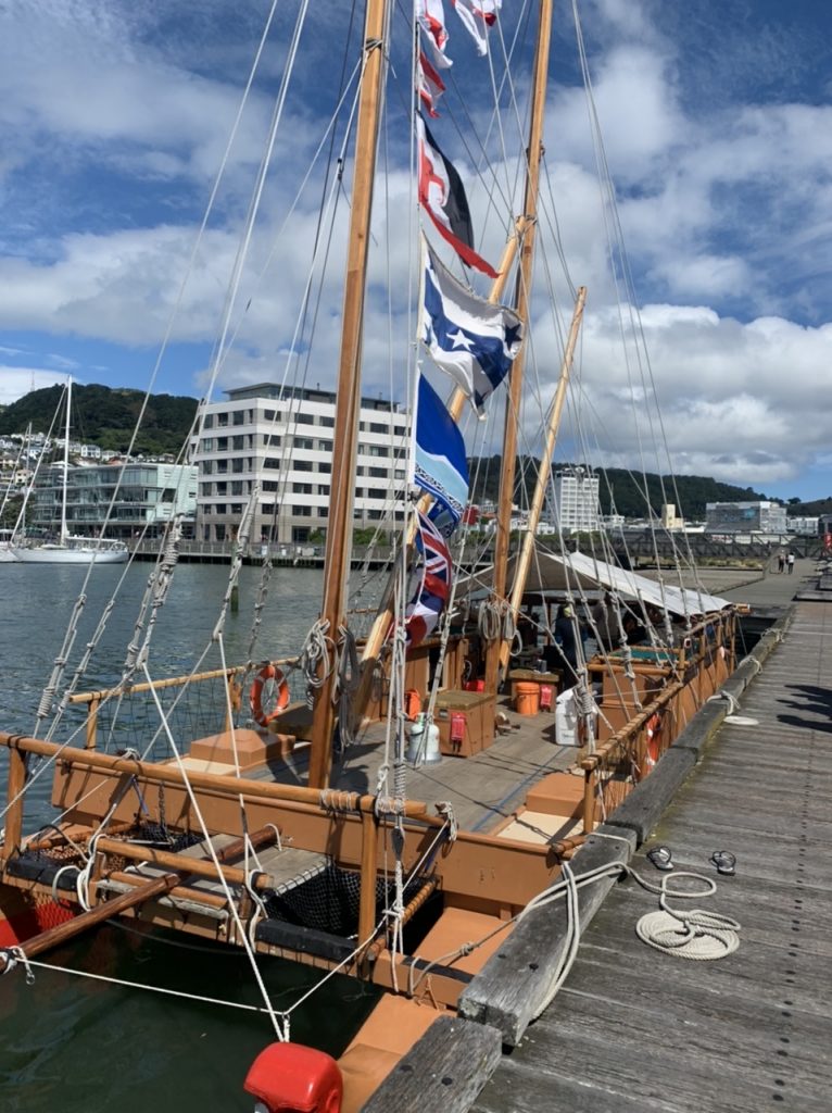 Am nächsten Morgen frühstücken wir Banana Pancakes im Neo Cafe and Eatery. Danach geht es mit dem historischen Cable Car nach oben zum Stadtteil Kelburn. Die Bahnstrecke führt durch 3 Tunnel. Ganz schön steil. Hier oben ist eine beliebte Wohngegend, entstanden um die Jahrhundertwende mit Sicht über die Wellington Harbour Bay und auf die umliegenden grünen Hügel. Durch den Botanical Garden laufen wir wieder zurück in die Innenstadt vorbei am Rose Garden mit tropischem Gewächshaus und am Regierungsviertel mit dem Beehive & Parliament Building. Durch die Railway Station gelangen wir zum Waterloo Quay und laufen an den aufgewerteten Docks entlang. Hier gibt es neben den schicken Fischrestaurants viele Freizeitangebote wie Klettern in der Hafenhalle, Kanufahren oder Radeln. Hinter dem National Museum liegt der Hafen mit einem alten Māori Waka Segelboot. Alles aus Naturmaterialien, sogar das Segel. Um zum Lookout auf den Mount Victoria mit seinen über 200 m zu kommen, wird es anstrengend. Aber die Aussicht ist toll, man sieht wie weit sich Wellington zwischen den vielen Halbinseln ausgebreitet hat. Unten am Courtenay Place brauchen wir erstmal einen Durstlöscher im Pub.