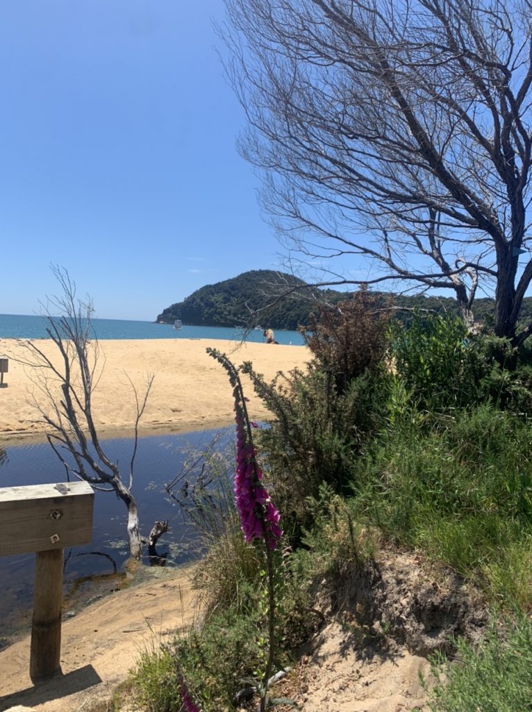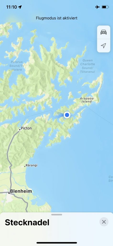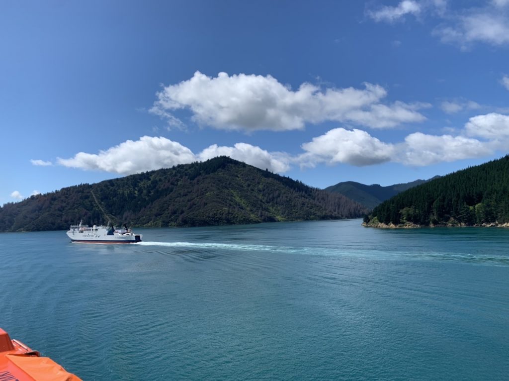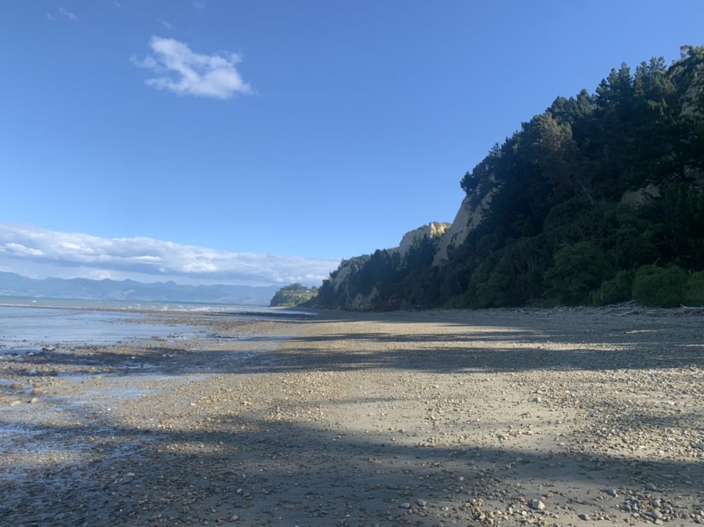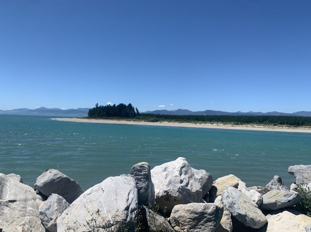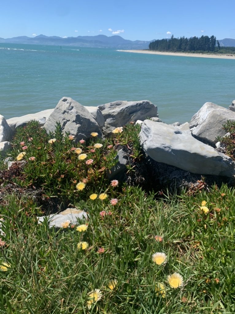 Die frühe Fähre bringt uns von Wellington auf die Südinsel nach Picton. Es regnet und unser Navi versagt, fast hätten wir das Tanken vergessen. Den Leihwagen müssen wir am Fährterminal abgeben, wir kriegen im Süden ein neues Auto von Europcar. Beim Einchecken treffen wir eine junge englische Bikepackerin, fast gleiches Setup wie Li und ich, nur ohne Gepäckträger und mit toller Rahmentasche. Sie ist auch nass geworden. Auf der Fähre entspannt sich das Wetter, es wird sonnig und als wir nach 2 Stunden Fahrt an den Marlborough Sounds der Südinsel ankommen, ist es traumhaft. Viele kleine Inseln, die bewaldeten Berge, blauer Himmel, ein paar entgegenkommende Schiffe. Alle sind oben auf dem Heck und staunen über diese herrliche Aussichten. In Picton geht es flott und wir haben einen neuen Wagen, einen weißen Mitsubishi ASX, ein kleiner SUV. Aufgrund einer Straßensperrung müssen wir über Blenheim einen Umweg fahren und kommen durch die Weinregion Marlborough. Viele Weinanbauflächen sind in diesem Tal. Es ist berühmt für seine Weine. Nach und nach wird es hügeliger und kurviger und wir haben schöne Aussichten auf die über 2.000 m hohen Berge. Die Städte sind klein und liegen weit auseinander. Nach 2 Stunden kommen wir in Tasman an. Unser Cottage ist ein kleines Holzhaus Aroha Cottage (findet man auf Booking) mit Veranda und Garten, das richtig liebevoll eingerichtet wurde. Wir fühlen uns sofort wohl. Das Meer liegt fast hinter dem Haus und lockt uns zu einen Walk über die Steine an den Klippen entlang.