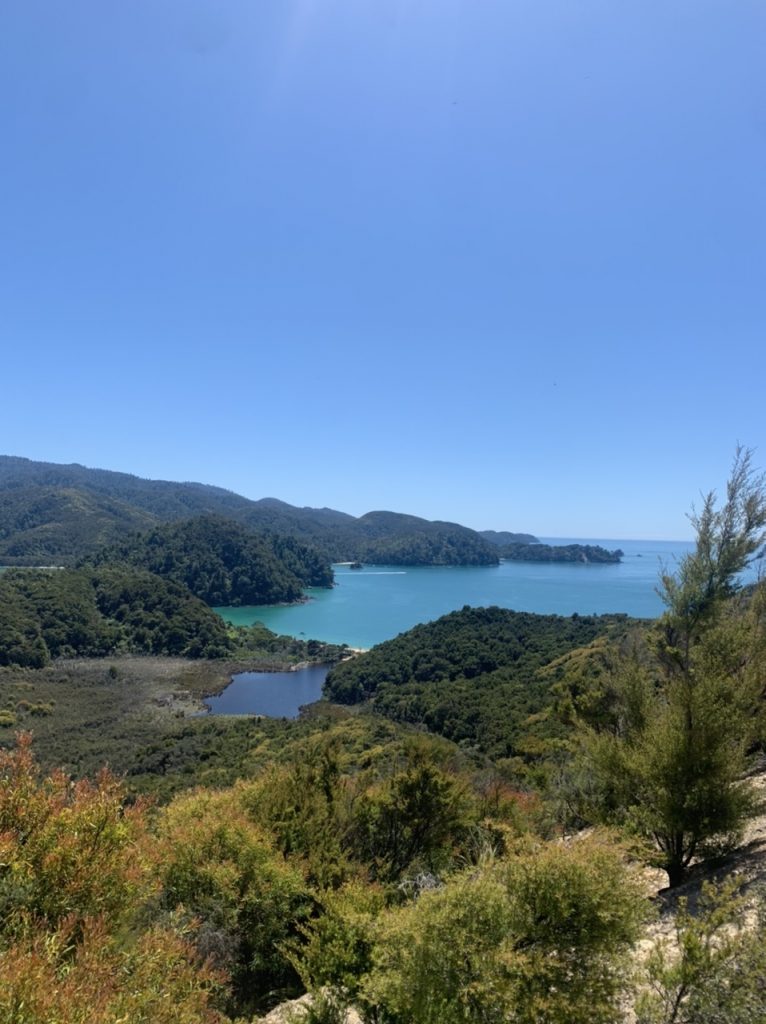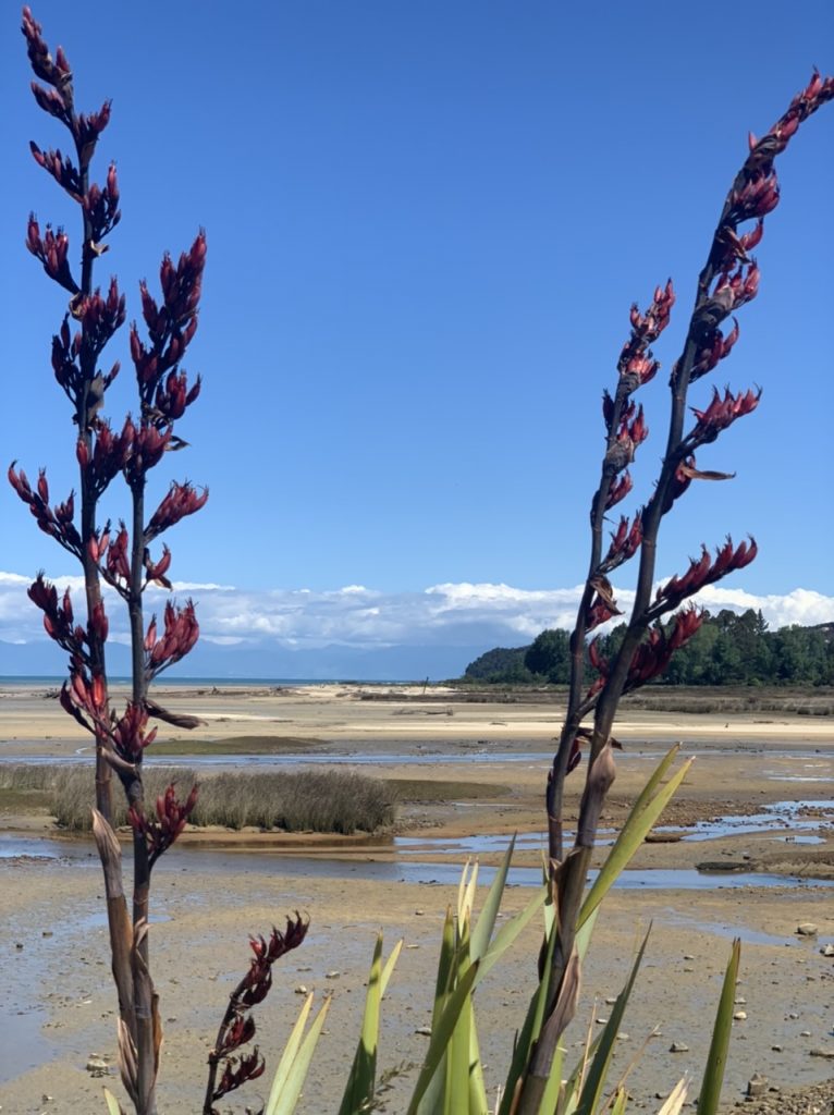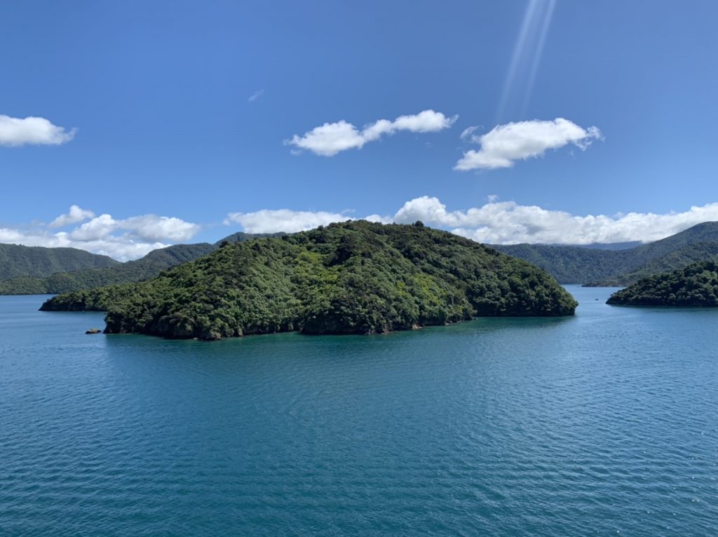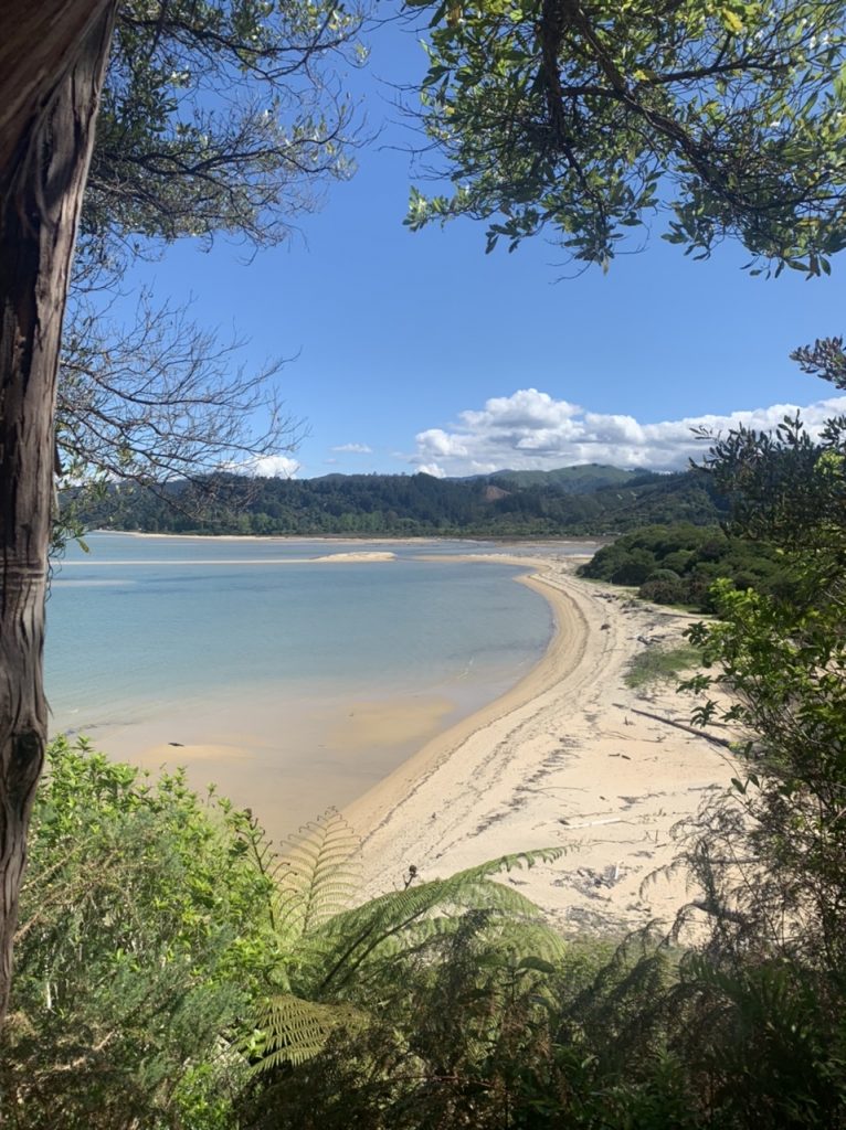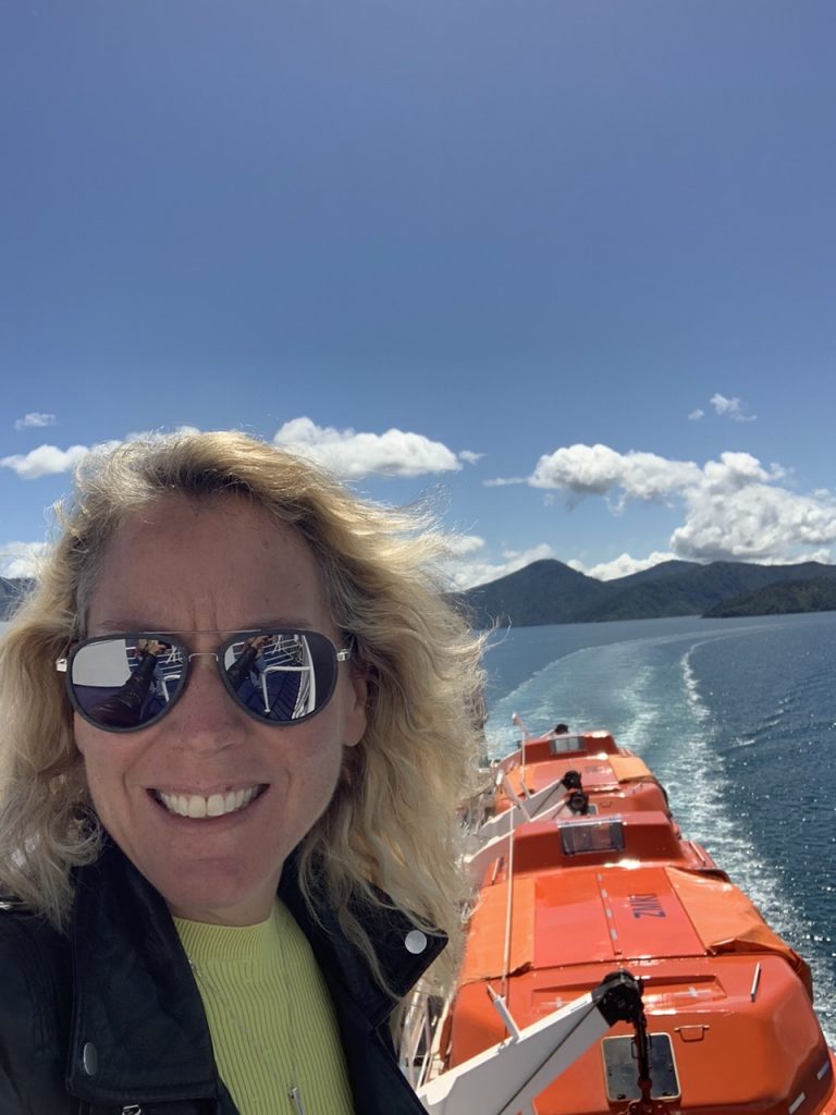 Die frühe Fähre bringt uns von Wellington auf die Südinsel nach Picton. Es regnet und unser Navi versagt, fast hätten wir das Tanken vergessen. Den Leihwagen müssen wir am Fährterminal abgeben, wir kriegen im Süden ein neues Auto von Europcar. Beim Einchecken treffen wir eine junge englische Bikepackerin, fast gleiches Setup wie Li und ich, nur ohne Gepäckträger und mit toller Rahmentasche. Sie ist auch nass geworden. Auf der Fähre entspannt sich das Wetter, es wird sonnig und als wir nach 2 Stunden Fahrt an den Marlborough Sounds der Südinsel ankommen, ist es traumhaft. Viele kleine Inseln, die bewaldeten Berge, blauer Himmel, ein paar entgegenkommende Schiffe. Alle sind oben auf dem Heck und staunen über diese herrliche Aussichten. In Picton geht es flott und wir haben einen neuen Wagen, einen weißen Mitsubishi ASX, ein kleiner SUV. Aufgrund einer Straßensperrung müssen wir über Blenheim einen Umweg fahren und kommen durch die Weinregion Marlborough. Viele Weinanbauflächen sind in diesem Tal. Es ist berühmt für seine Weine. Nach und nach wird es hügeliger und kurviger und wir haben schöne Aussichten auf die über 2.000 m hohen Berge. Die Städte sind klein und liegen weit auseinander. Nach 2 Stunden kommen wir in Tasman an. Unser Cottage ist ein kleines Holzhaus Aroha Cottage (findet man auf Booking) mit Veranda und Garten, das richtig liebevoll eingerichtet wurde. Wir fühlen uns sofort wohl. Das Meer liegt fast hinter dem Haus und lockt uns zu einen Walk über die Steine an den Klippen entlang.