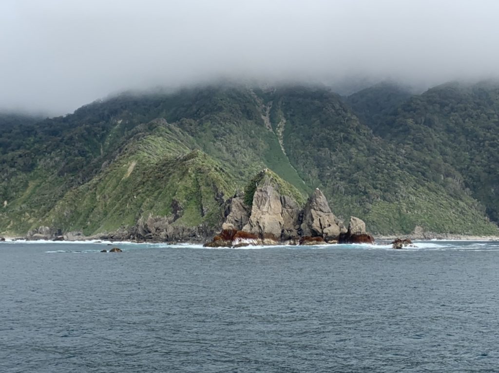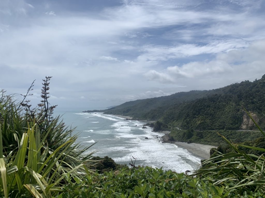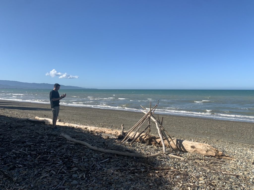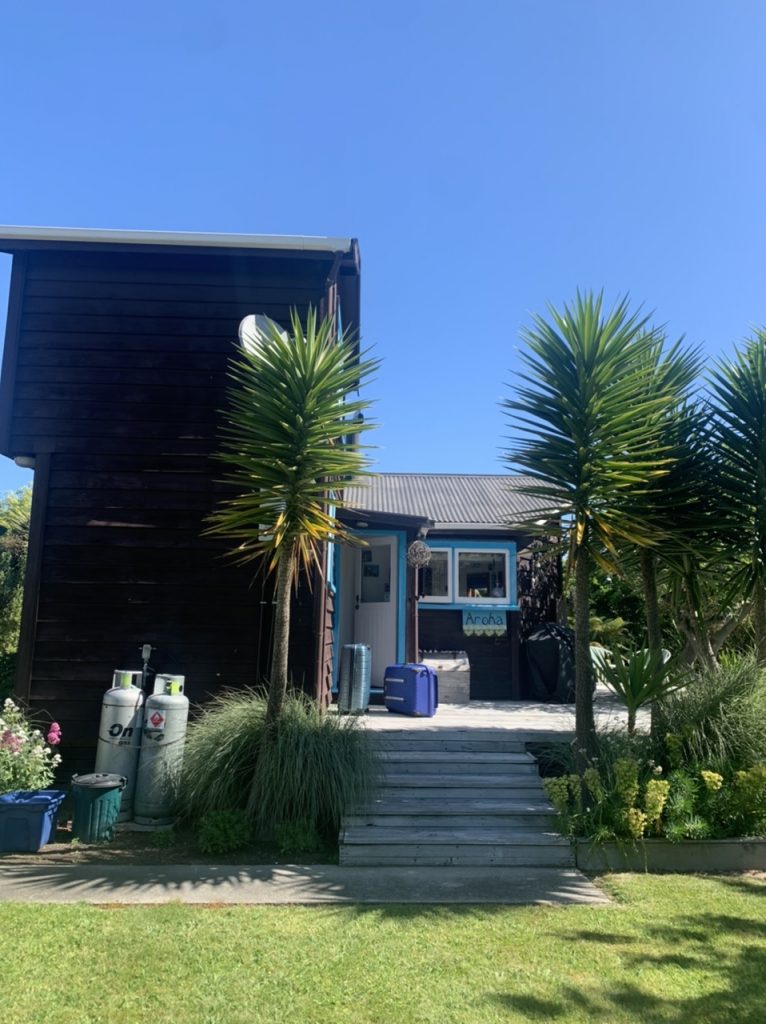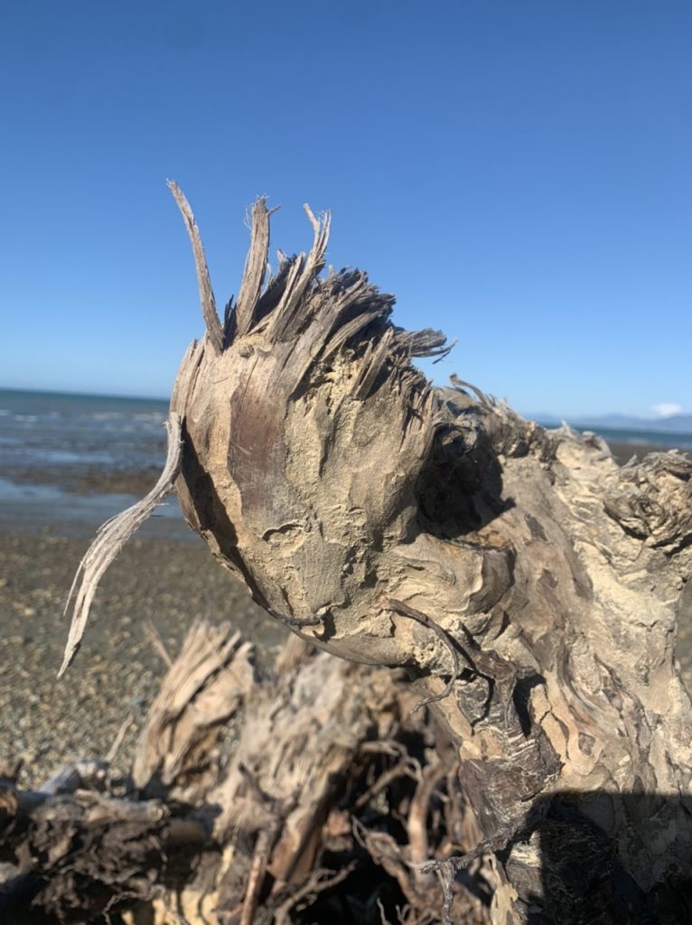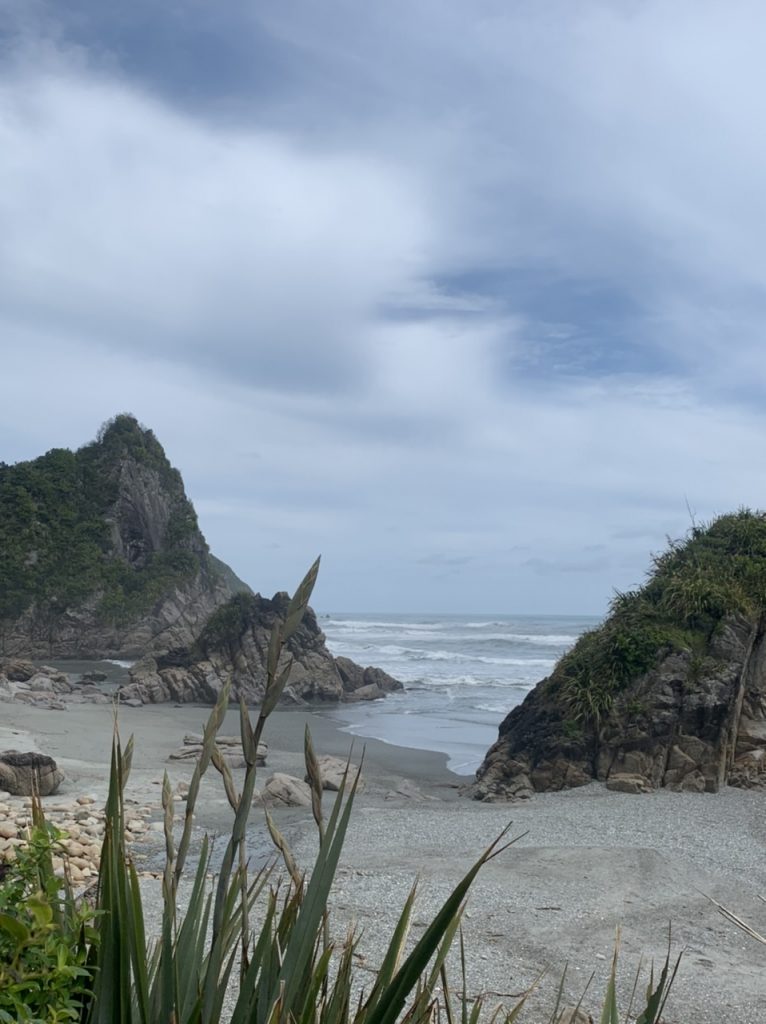 Die frühe Fähre bringt uns von Wellington auf die Südinsel nach Picton. Es regnet und unser Navi versagt, fast hätten wir das Tanken vergessen. Den Leihwagen müssen wir am Fährterminal abgeben, wir kriegen im Süden ein neues Auto von Europcar. Beim Einchecken treffen wir eine junge englische Bikepackerin, fast gleiches Setup wie Li und ich, nur ohne Gepäckträger und mit toller Rahmentasche. Sie ist auch nass geworden. Auf der Fähre entspannt sich das Wetter, es wird sonnig und als wir nach 2 Stunden Fahrt an den Marlborough Sounds der Südinsel ankommen, ist es traumhaft. Viele kleine Inseln, die bewaldeten Berge, blauer Himmel, ein paar entgegenkommende Schiffe. Alle sind oben auf dem Heck und staunen über diese herrliche Aussichten. In Picton geht es flott und wir haben einen neuen Wagen, einen weißen Mitsubishi ASX, ein kleiner SUV. Aufgrund einer Straßensperrung müssen wir über Blenheim einen Umweg fahren und kommen durch die Weinregion Marlborough. Viele Weinanbauflächen sind in diesem Tal. Es ist berühmt für seine Weine. Nach und nach wird es hügeliger und kurviger und wir haben schöne Aussichten auf die über 2.000 m hohen Berge. Die Städte sind klein und liegen weit auseinander. Nach 2 Stunden kommen wir in Tasman an. Unser Cottage ist ein kleines Holzhaus Aroha Cottage (findet man auf Booking) mit Veranda und Garten, das richtig liebevoll eingerichtet wurde. Wir fühlen uns sofort wohl. Das Meer liegt fast hinter dem Haus und lockt uns zu einen Walk über die Steine an den Klippen entlang.