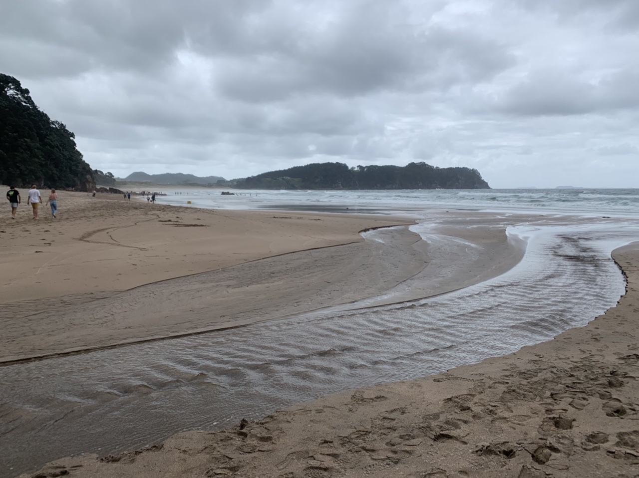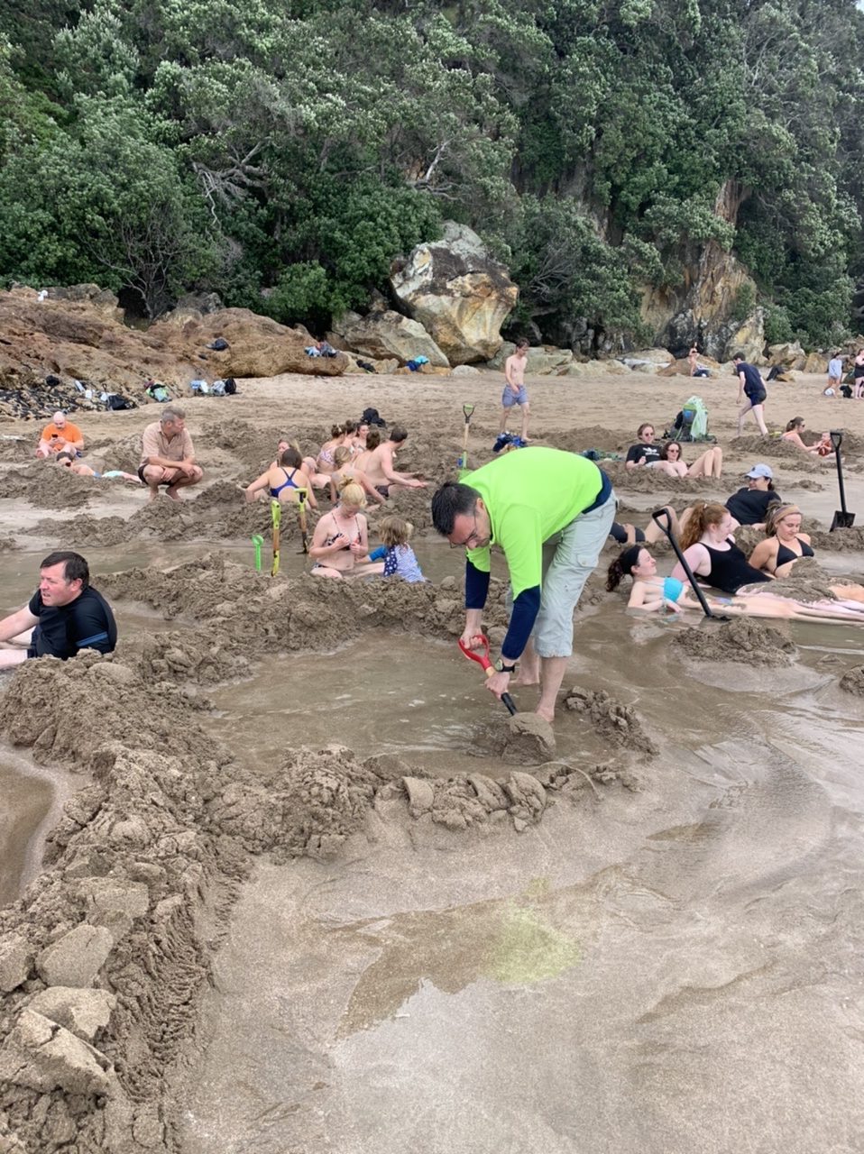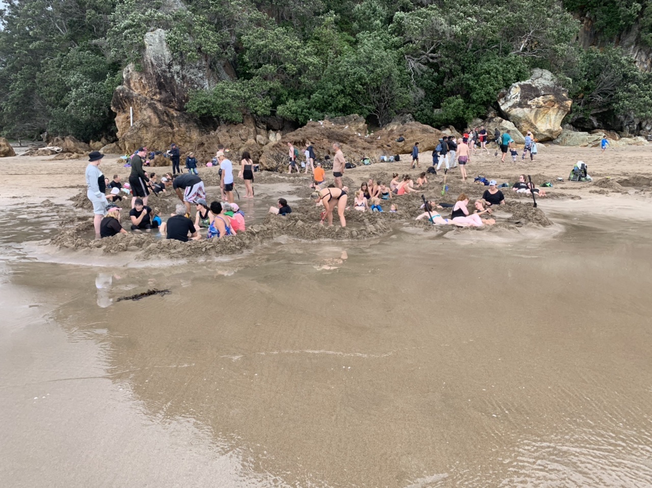 Das nächste Ziel ist der Hot Water Beach. Gespeist von einer unterirdischen Lavaheizung steigt hier Wasser durch den Sand hinauf. Um die Low Tide ist es perfekt um ein Loch in den Sand zu buddeln für den eigenen Hot Tube. Das Wetter ist heute stürmisch und trüb mit hohen Wellen, ideal um im eigenen heißen Loch abzuhängen. So relaxing! Ich könnte ewig drin bleiben, vor allem nach dem kühlen Sprung ins Meer. Ein Paradies. Die anderen Besucher helfen uns sogar beim schaufeln. Schließlich kommt die Flut und überspült unser heißes Loch.