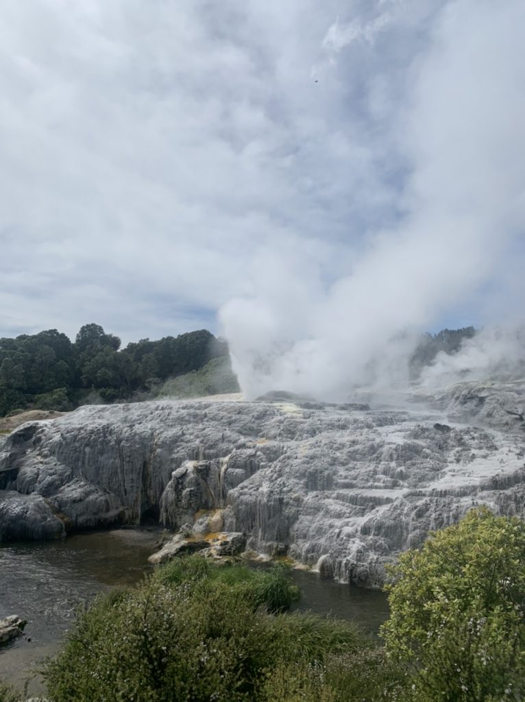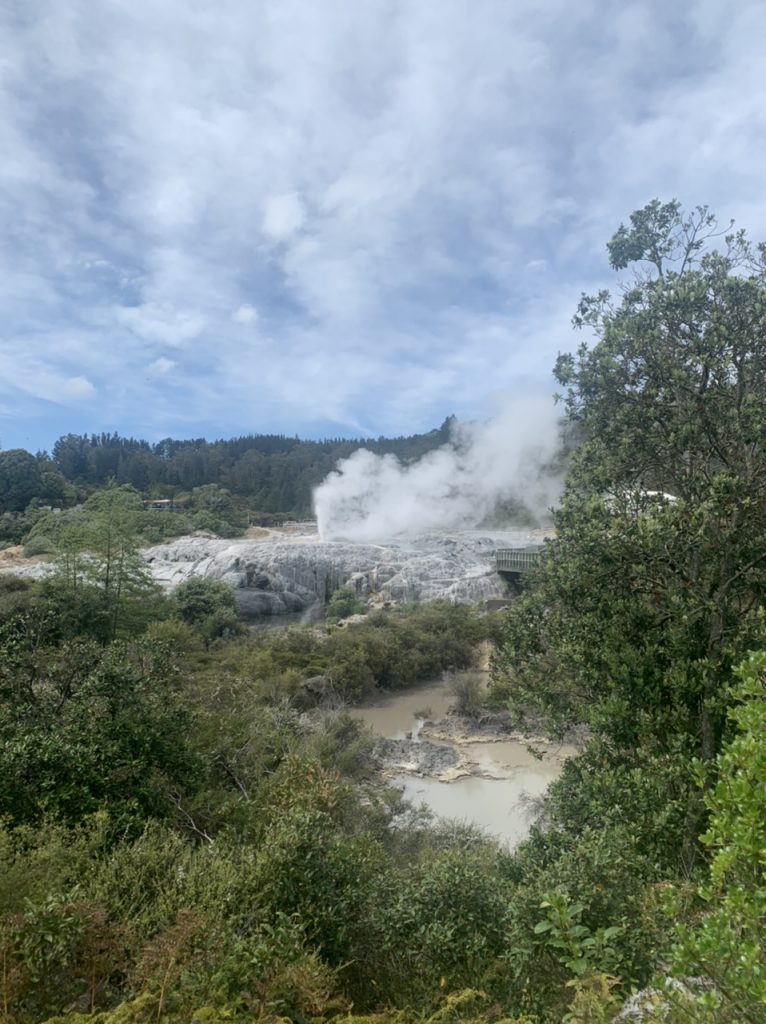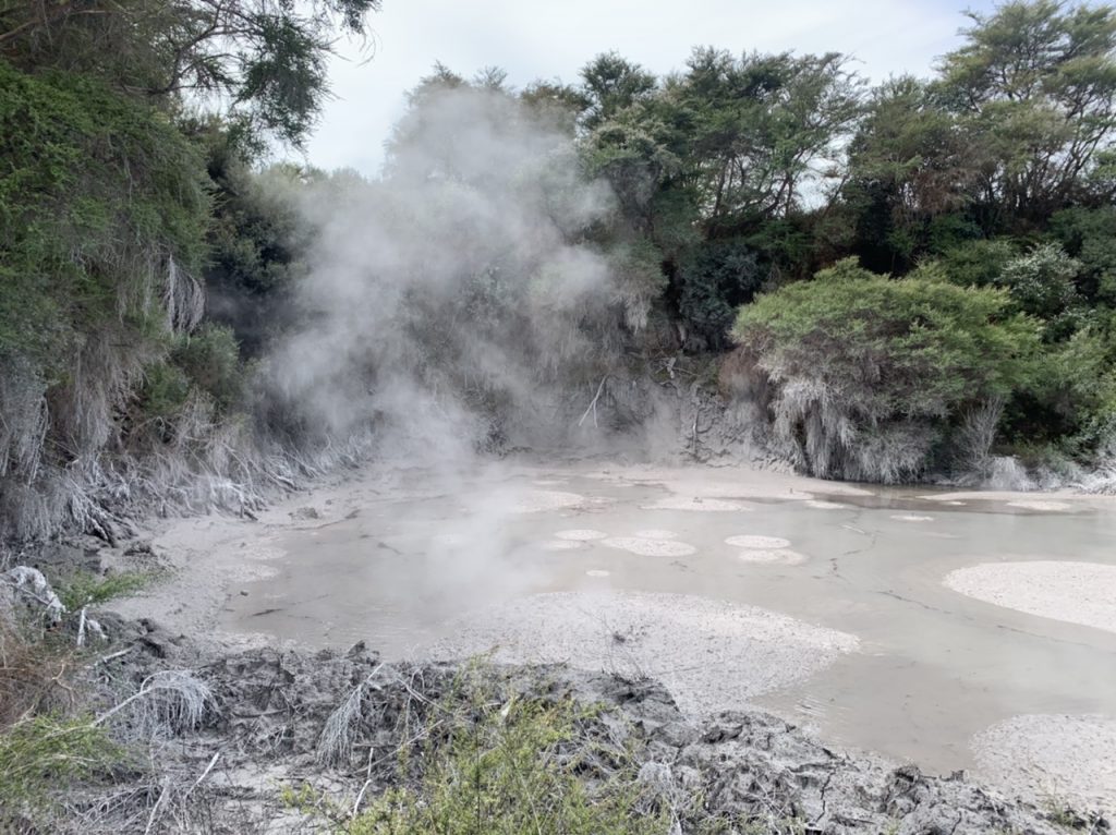Nach einem lustigen Frühstück mit Karin und Rolf aus Stuttgart im B&B von Vivienne starten wir mit der nächsten Tour im Te Puia Geothermalpark mit sanft fauchenden Geysiren, blubbernden Mud Holes und viel Schwefeldampf. Unser Māori Guide erklärt uns viel, inzwischen haben wir uns an die merkwürdige Aussprache gewöhnt. Eier heißen Iggs, nicht Eggs. Der Geysir ist jede Stunde aktiv und erreicht 30m. Das Wasser fällt auf weiße Siliziumterrassen hinab. Die Schlammlöcher sind 80-90 Grad warm. Zu heiss für ein Bad, der Schlamm kann aber als Fango für den Rücken genutzt werden. Im Anschluss besuchen wir die National Kiwi Hatchery, wo die bedrohten National-Vögel aufgezüchtet werden. Dazu werden den wilden Kiwis die Eier gestohlen. Nicht so schön, aber ihre Überlebenschance in der Wildnis wäre aufgrund der vielen Fressfeinde nur 5 %. Die nachtaktiven Vögel sind dick, mit pelzartigen Federn, langen Schnabel und Mini-Flügeln, die sie gar nicht verwenden. Sie können nämlich gar nicht fliegen. Die Eier sind 1/3 ihres Körpergewichts. Alle Neuseeländer lieben diese lustigen Viecher. Wir sehen die gerade geschlüpften Küken, das zuletzt auf die Welt gekommene wurde Schatz genannt.