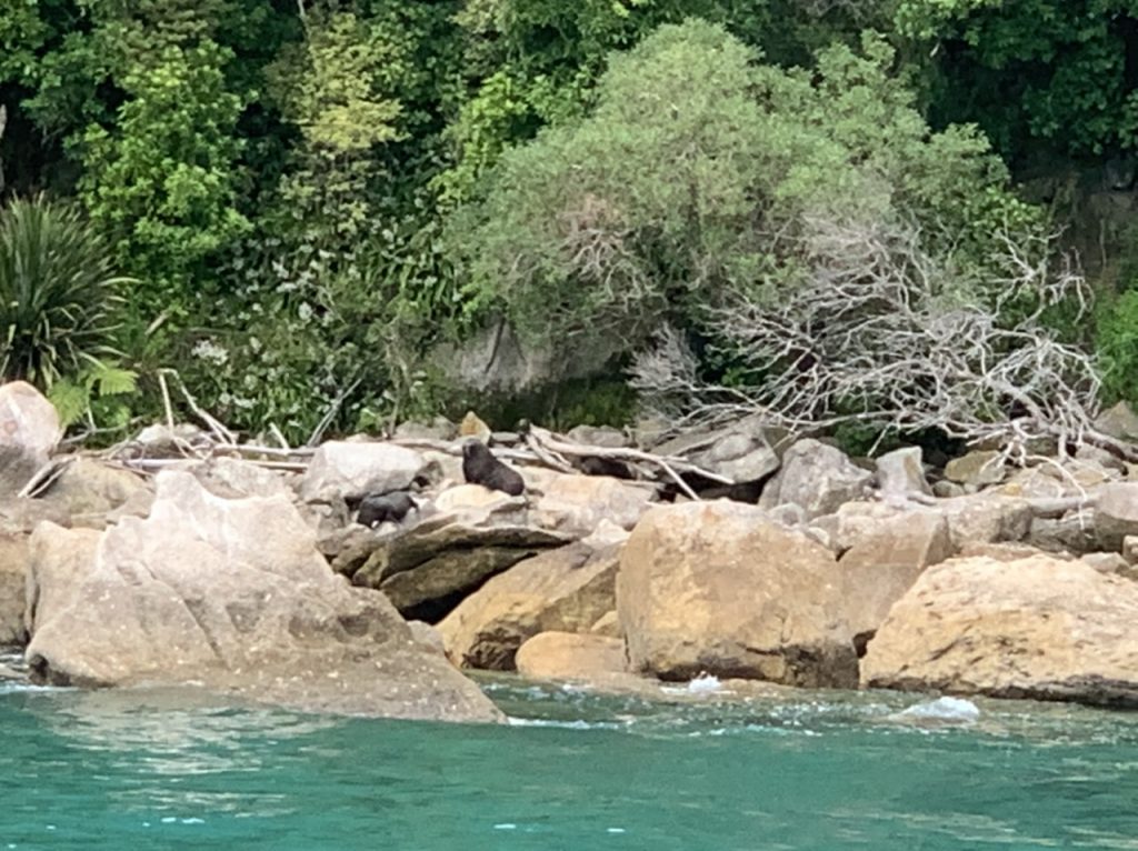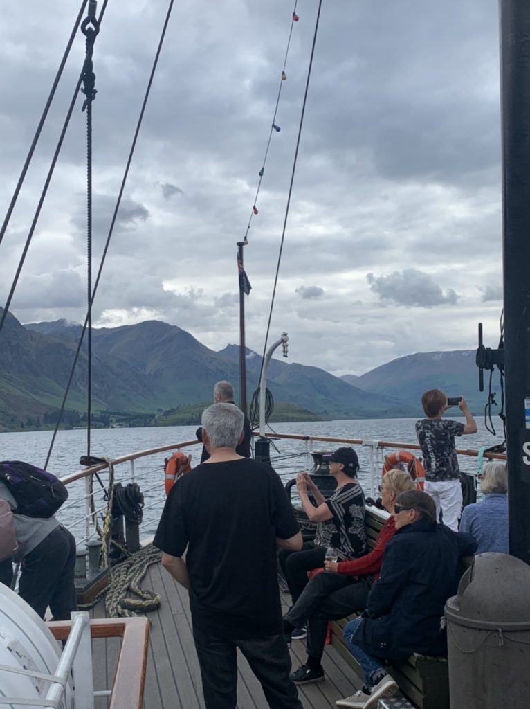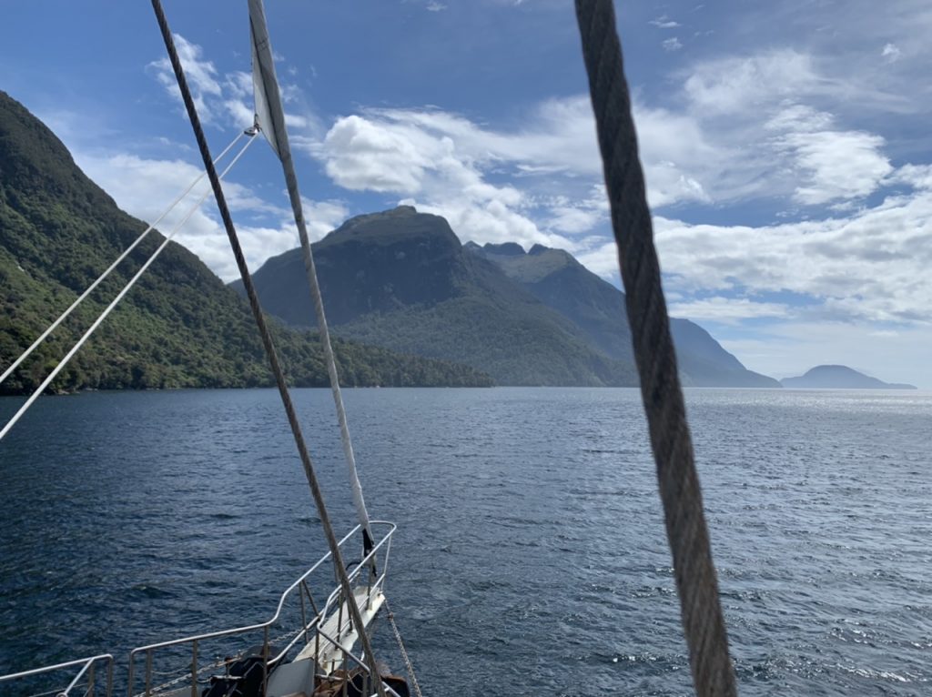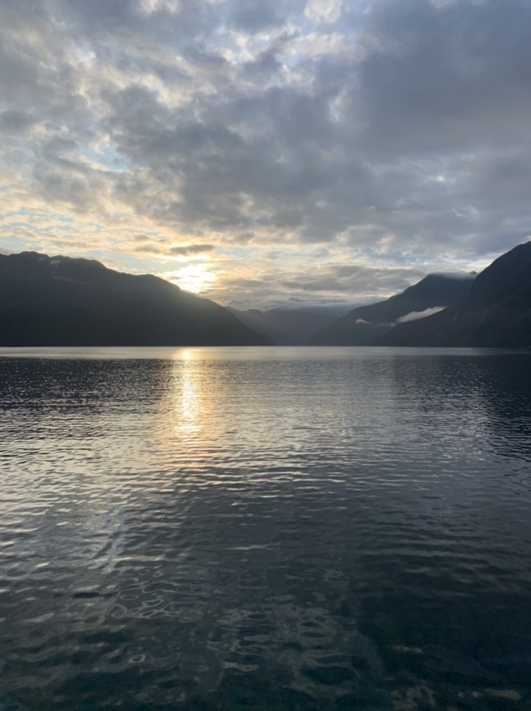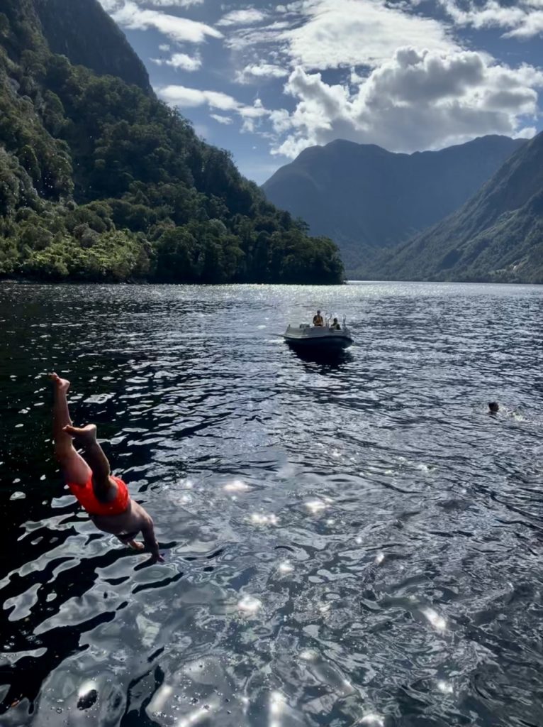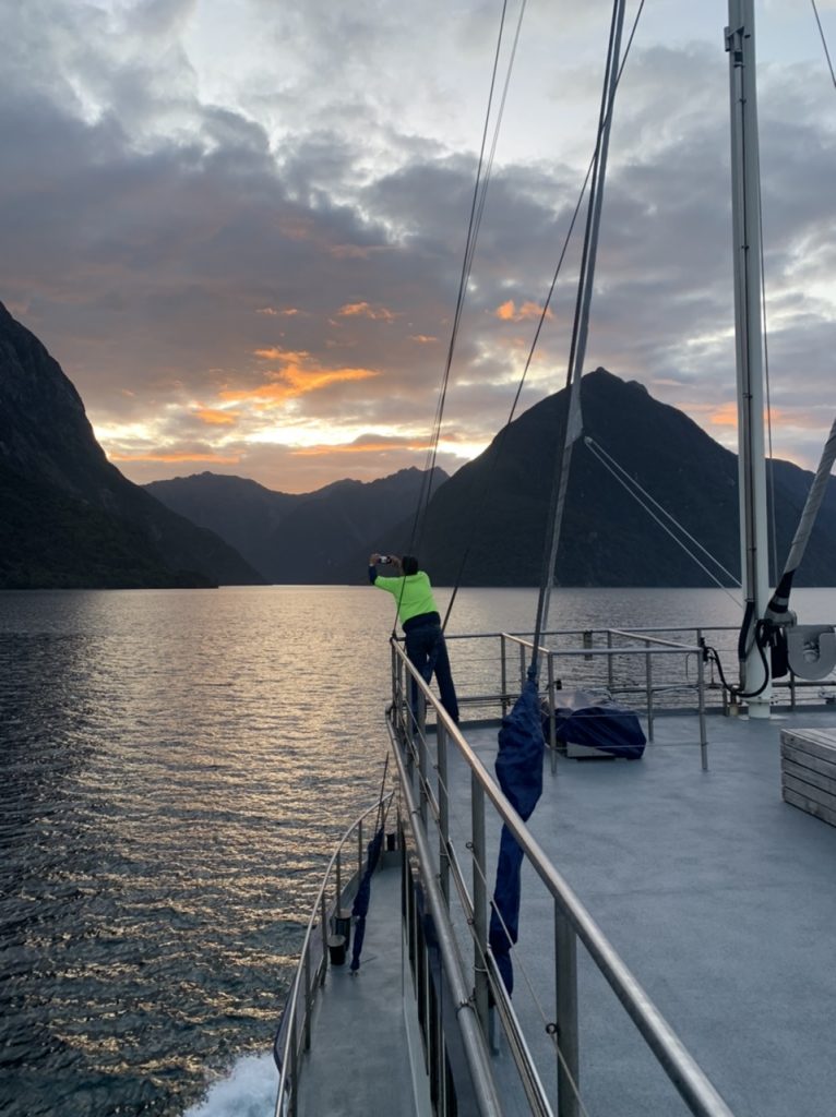 Am Samstag erwartet uns ein besonderer Wochenendausflug 😀. Eine Schiffsreise durch den Lake Wanapouri, dann mit dem Bus über die hohen Berge runter zum Doubtful Sound, einer der größten Fjorde Neuseelands. Hier steigen wir in ein elegantes Segelschiff und verbringen die nächsten 20 Stunden in dieser Traumlandschaft. Steile dicht bewachsene Hänge links und rechts, einige Wasserfälle, verzweigte Fjordlandschaften. Nachmittags springen wir in die bootseigenen Kajaks und schwimmen im Fjord (gar nicht zu kalt). Dann geht es raus zur offenen Tasman Sea. Das Segel wird gesetzt, der Wind und die Wellen nehmen zu. Wir sehen faulenzende Robben auf den Felsen und Pinguine, die neben uns herschwimmen. Eine junge Mitarbeiterin erklärt uns total liebevoll viele Details über die Natur und die Tiere. Wahnsinn, was sie alles weiß. Das Abendprogramm sieht neben dem leckeren Buffet zudem Delphine vor. Alle springen von den Tischen um sie zu sehen. 😀