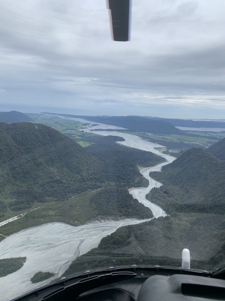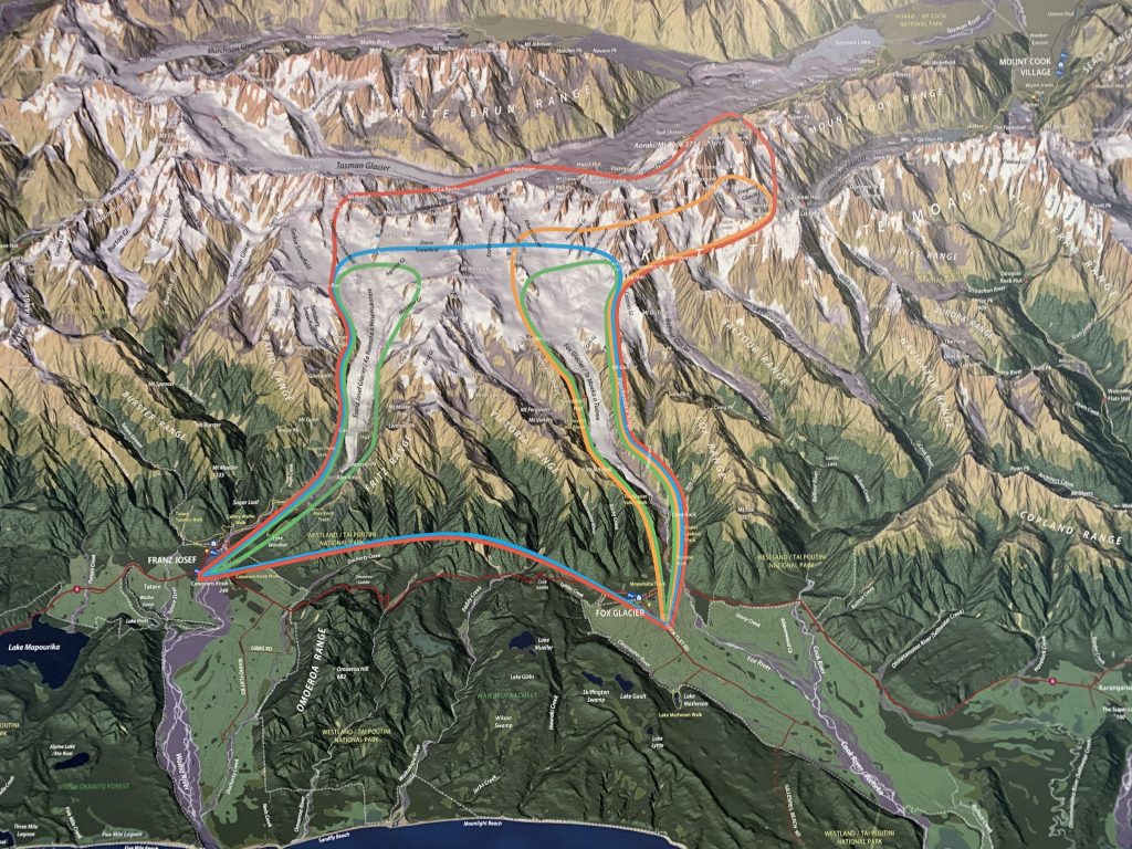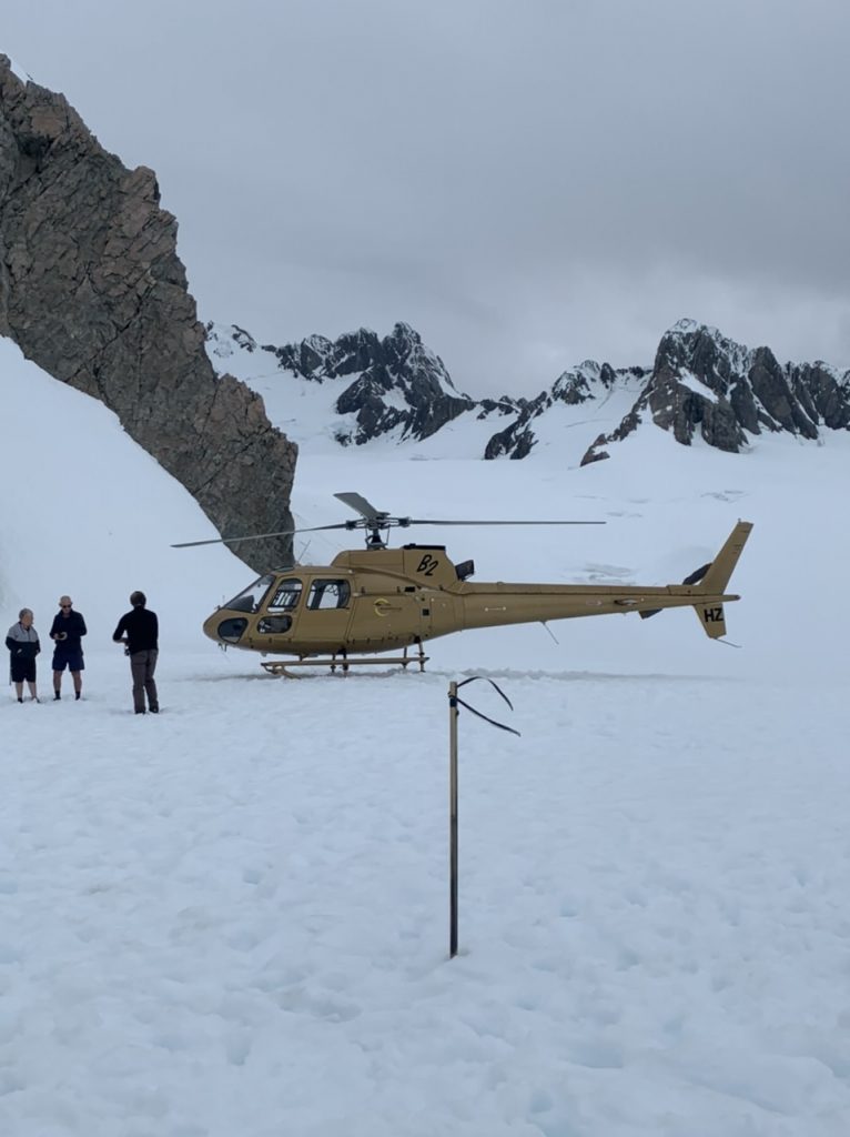 Oben liegen die Gipfel Mount Cook 3.754 m und Mount Tasman 3.497 m. Links der Franz Josef Gletscher und rechts der Fox Gletscher. Beim Frühstück entscheide ich mich spontan einen Helikopterflug zu machen. Sonst würde ich nichts von den Gletschern sehen können. Unsere Gastgeberin ruft bei Josef und Fox Helikopter Services an und reserviert einen Flug um 11:30 für mich. Es ist ein Traum, die Welt von oben sehen zu dürfen. Unter mir der Flusslauf und der grüne dichtbewachsene Wald. Der Heli ist in Sekunden am Anflug auf den Gletscher. Zunächst über das Geröll und dann über das Eis. Tiefe blauleuchtende Spalten unter uns. Was für Einblicke. Viel zu schnell setzen wir zur Landung auf dem Schneefeld am oberen Ende an. Wir dürfen aussteigen und Fotos machen. Der Heli-Pilot erzählt mir, dass er gerne mehr deutsch sprechen würde, so dass er auch in Deutschland fliegen kann. Er hat diesen Sommer seine Freunde und Familie in Stuttgart besucht.