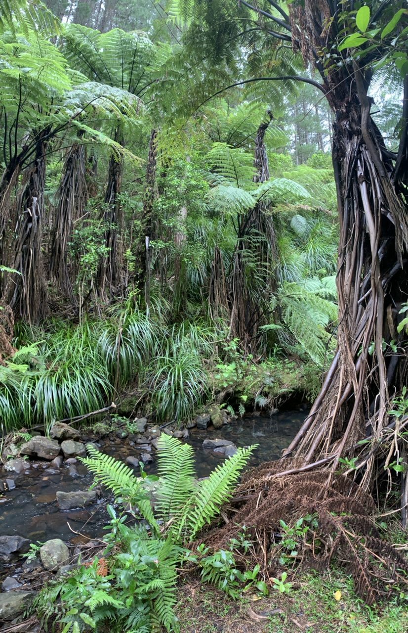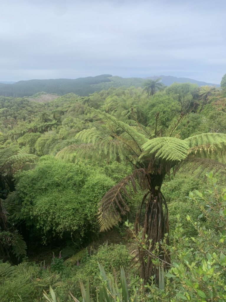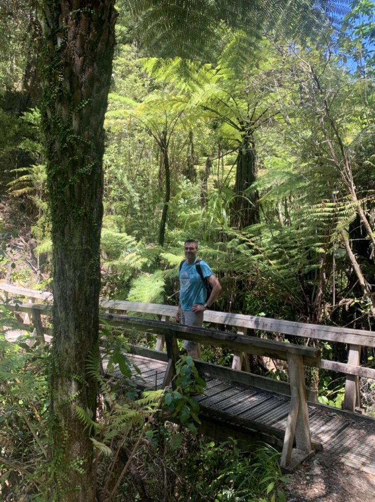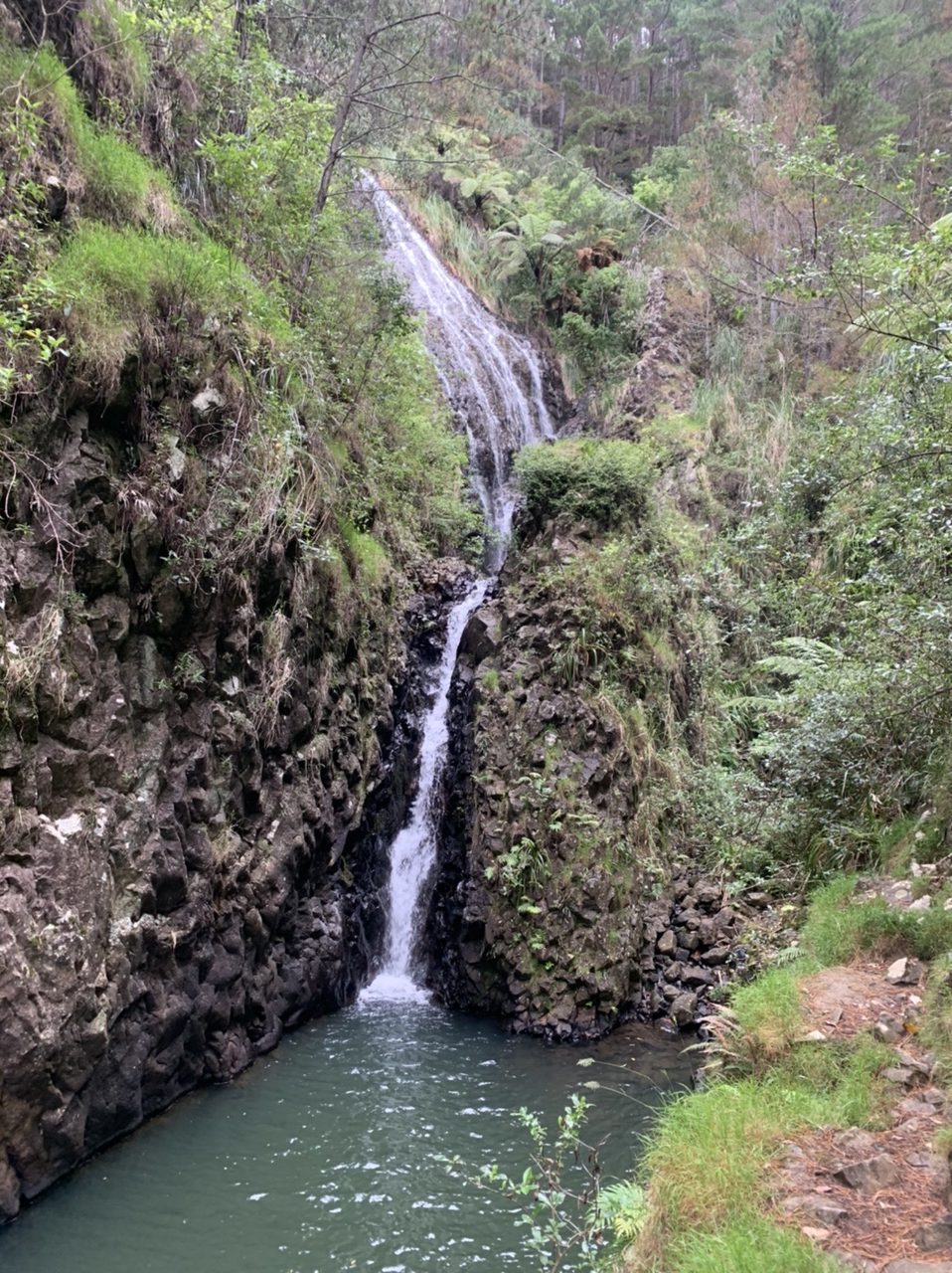 Dieser Tag wird sehr paradiesisch. Nach dem Frühstück machen wir einen Walk zu einem Wasserfall. Die Pflanzen sind so anders hier. Vor allem riesige Farne mit lustig geschwungenen Enden. Das Wasser fällt von weit oben sanft in einen Pool. Leider noch zu kalt zum Baden.