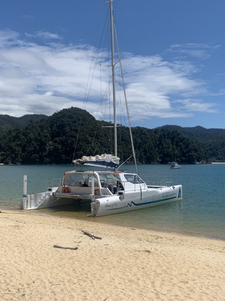 Am nächsten Morgen besuchen wir den Abel Tasman National Park. Mit dem Katamaran fahren wir vormittags direkt vom Strand in Kaiteriteri die Küste entlang in nördlicher Richtung. Der Nationalpark erstreckt sich viele Kilometer an der Küste entlang. Die Strände haben einen orangegelben Sand und sind nahezu menschenleer. Der Split Apple Rock sieht aus die ein gespaltener Apfel. An den Felsen der Adele Island liegen Seehunde und sonnen sich. Einige bunte Kajaks sind unterwegs. Leider ist es windstill und so reicht es heute nicht zum segeln. Aber trotzdem schön, mal ein Katatmaran kennenzulernen. Der Kapitän erklärt mir alles bereitwillig. Mittag erreichen wir die Anchorage Bay und laufen nun den Coastal Walk durch die bewaldete Küste an Farnen, Wasserfällen entlang begleitet von exotischem Vögeln zurück bis Maharau. Immer wieder gibt es tolle Ausblicke auf das türkisfarbene Meer und die Strände. Leider hat diese paradiesische Strecke nur 12 Kilometer. Lustig ist es die Wekas kennenzulernen. Diese etwa entengroßen frechen Vögel warten vorzugsweise an Picknickbänken auf die Touris und hoffen, etwas zu fressen abzukriegen. Als wir uns auf der Bank niederlassen, kommt ein Weka von hinten angeschlichen. Beeindruckend wie gut sie mit ihrem spitzen Schnabel den Apfel zerhacken können. Abends genießen wir das schöne Ferienhaus und kochen neuseeländische Süsskartoffeln mit grünem Spargel begleitet von einem neuseeländischen Chardonnay natürlich 🙂