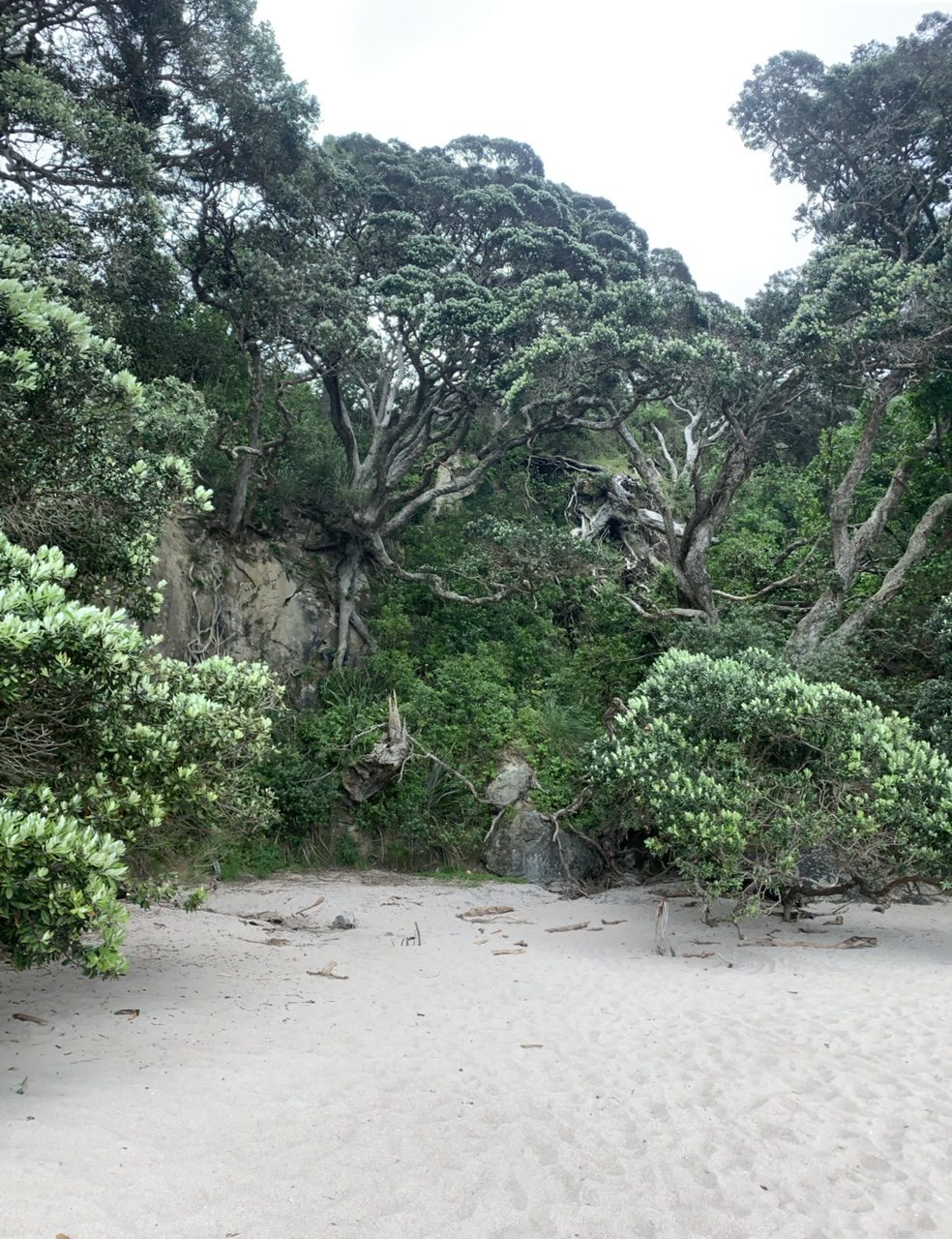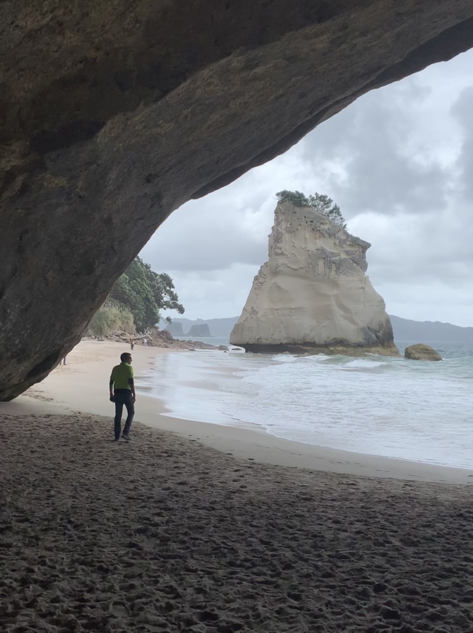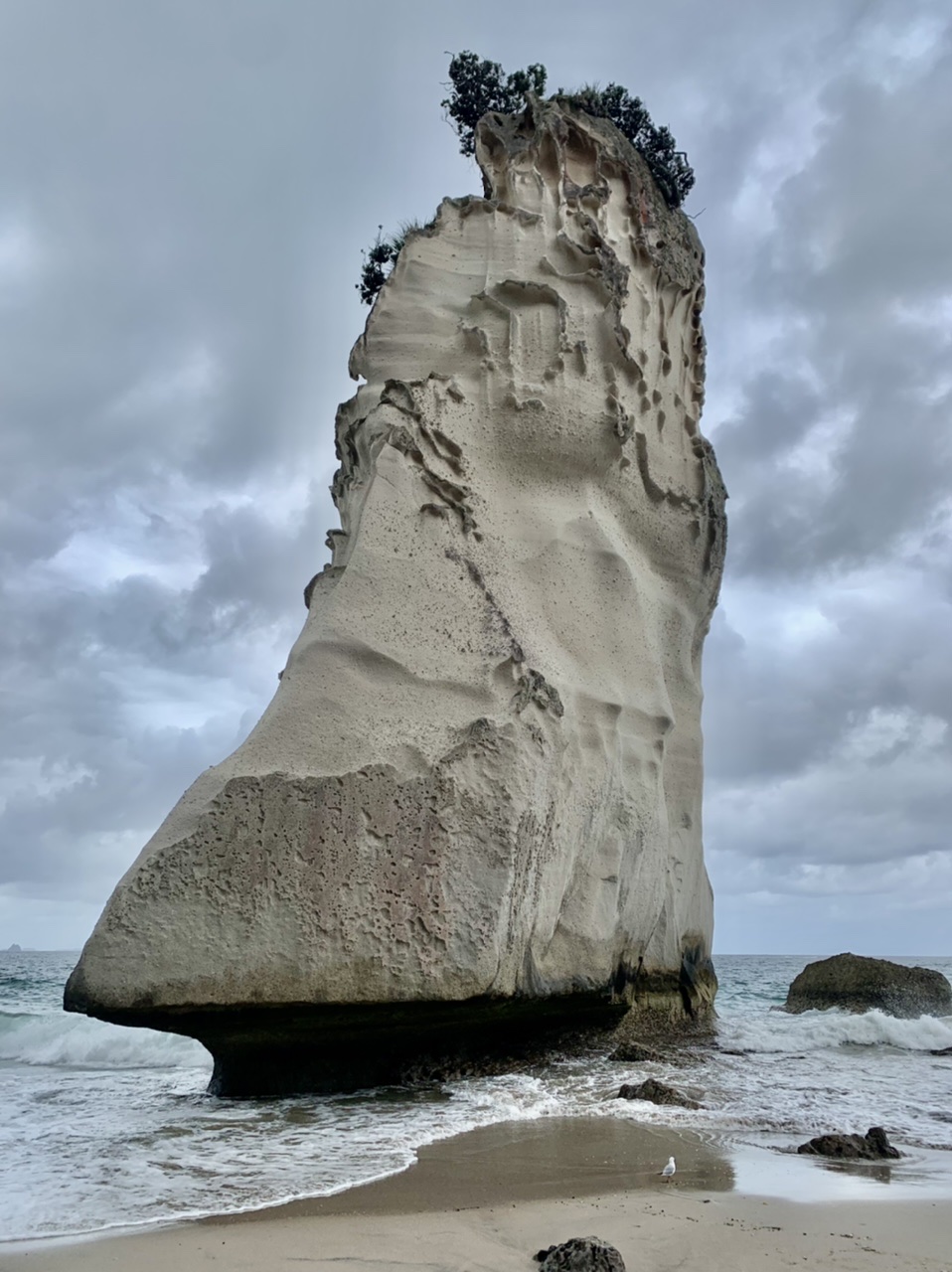 In Hahei machen wir einen Spaziergang zur Cathedral Cave, diesmal über den Landweg, der sich in sanften grünen Serpentinen zum Strand hinab schlängelt. Wir laufen durch die Höhle, wo Vögel brüten. Im Meer stehen imposante weiße Felsen, an denen die Wellen brechen, daher stehen sie fast wie auf einem Sockel. Ein Felsen hat die Form eines Segels. Ein himmlischer Strand, der Kontrast zum gestrigen Wetter ist extrem. Heute ist alles grau und beige, gestern türkis und gelb.