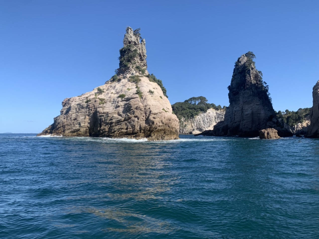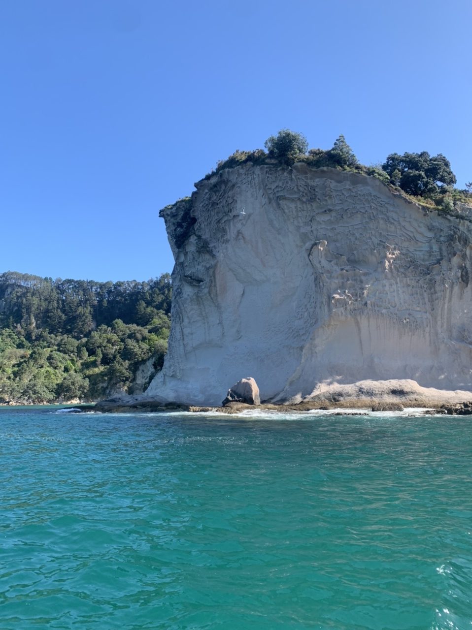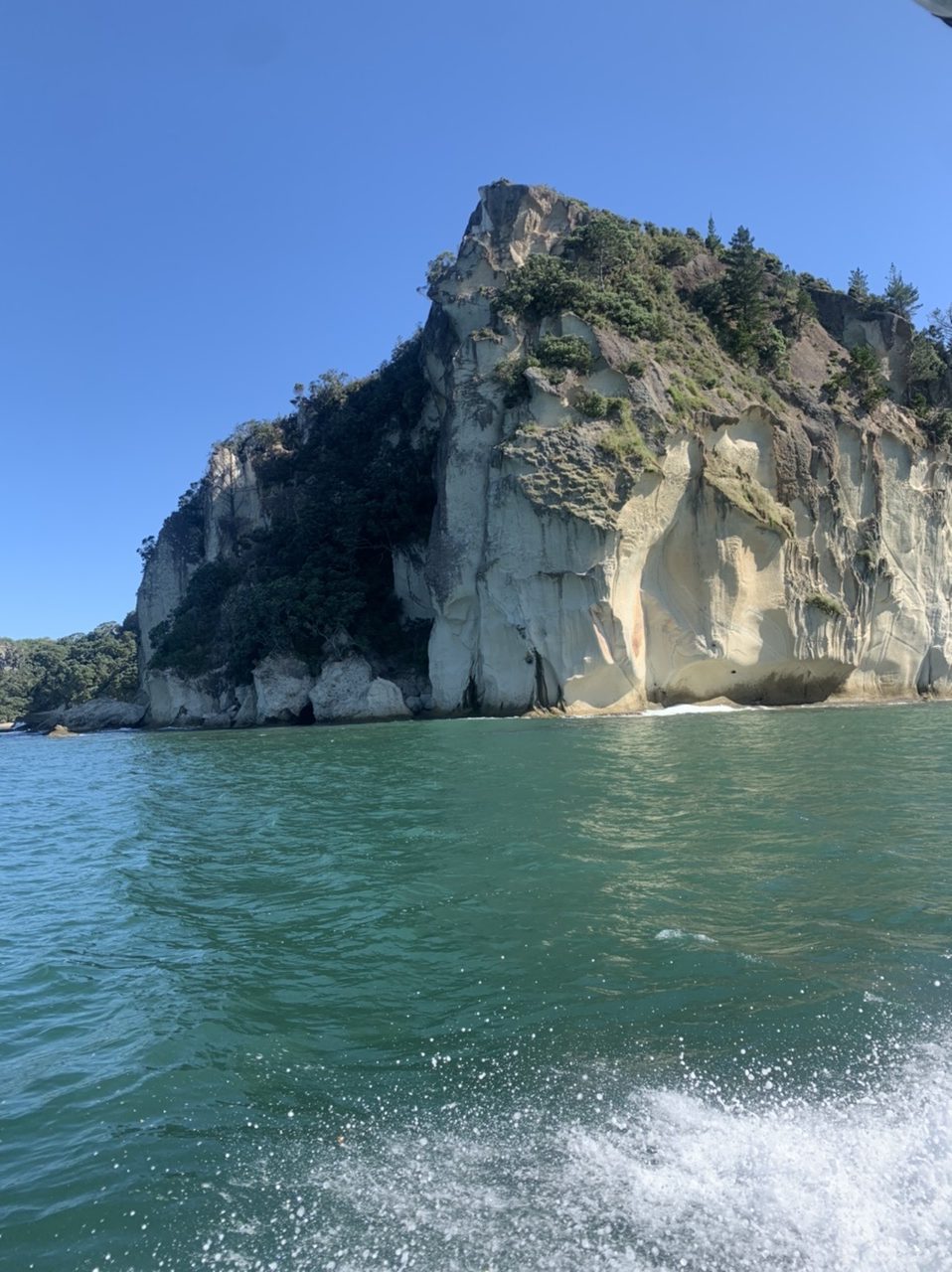 Unsere Boottour wurde wegen dem Wetter Forecast von morgen auf heute vorgelegt, also fahren wir umgehend los über den Highway und über die Berge auf geschlängelten Wegen nach Whitianga zur Ostküste. Der Strand ist herrlich, schöne Brandung und fast nichts los. Nach einem Spaziergang am Strand treffen wir Ocean Leopard Tours zu einer 2-stündigen Bootstour zu den Höhlen, Felsen und Inseln. Der Hit ist die Cathedral Cave mit eigenem Strand. Unerschrocken steuert unser das Motorboot trotz Wellengang in die Höhlen hinein. Die Eindrücke sind gigantisch. Leider müssen wir uns an den neuseeländischen Slang erst gewöhnen und verstehen daher nur die Hälfte der vielen Informationen.